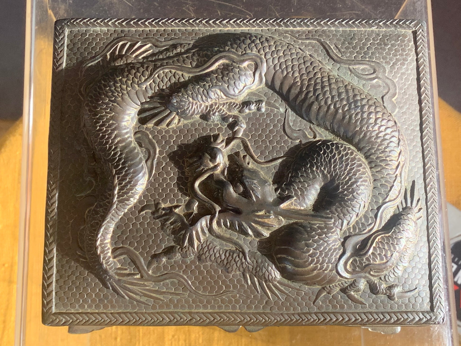 Medium sized antimony footed trinket box with dragon on the top and chrysanthemums around the sides.