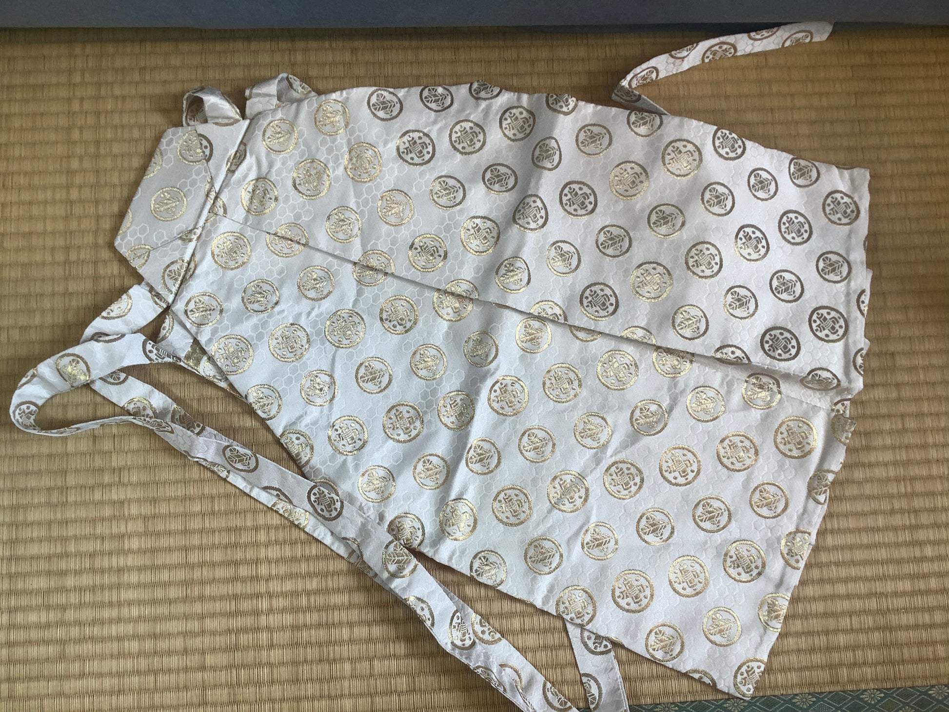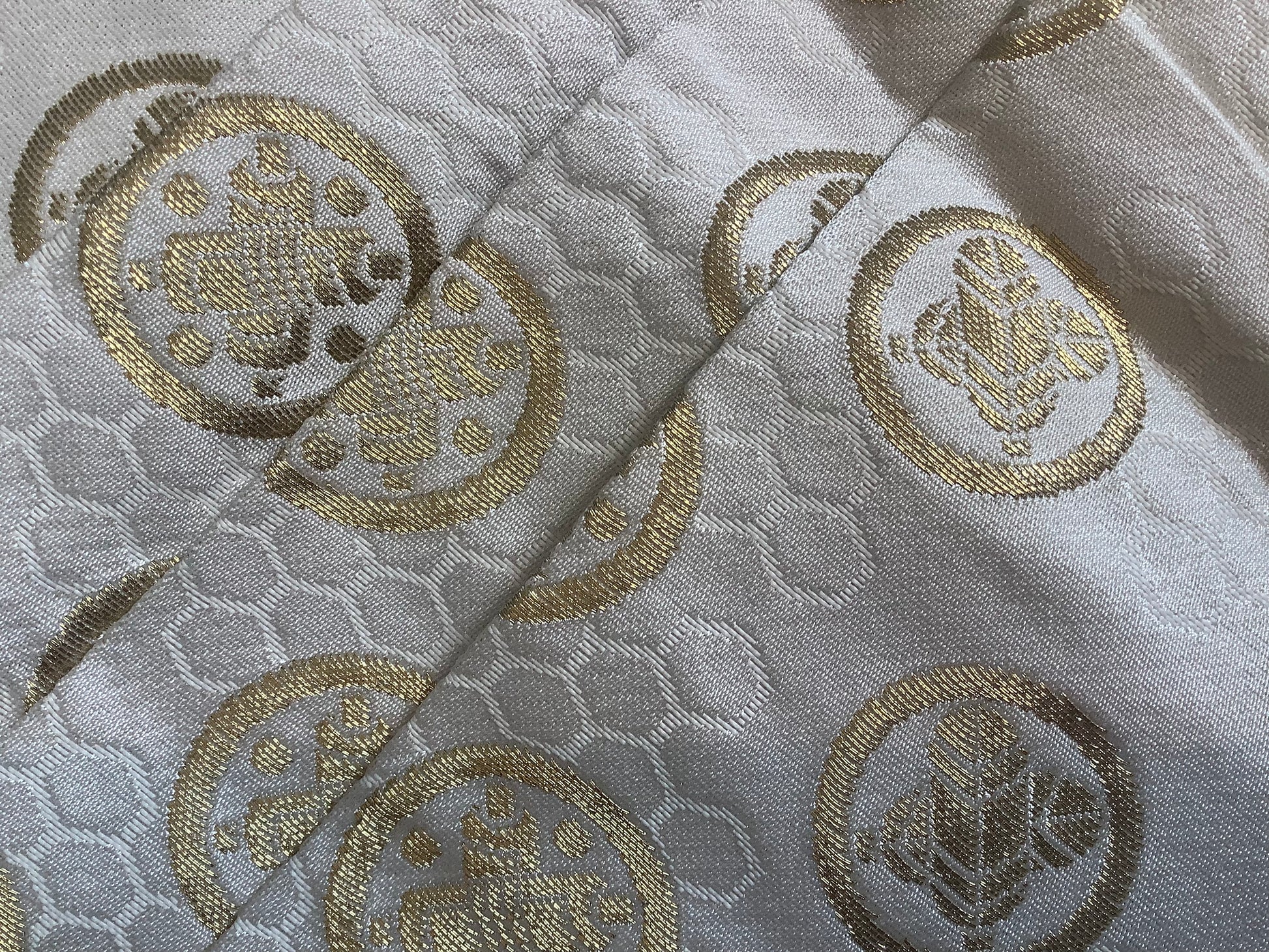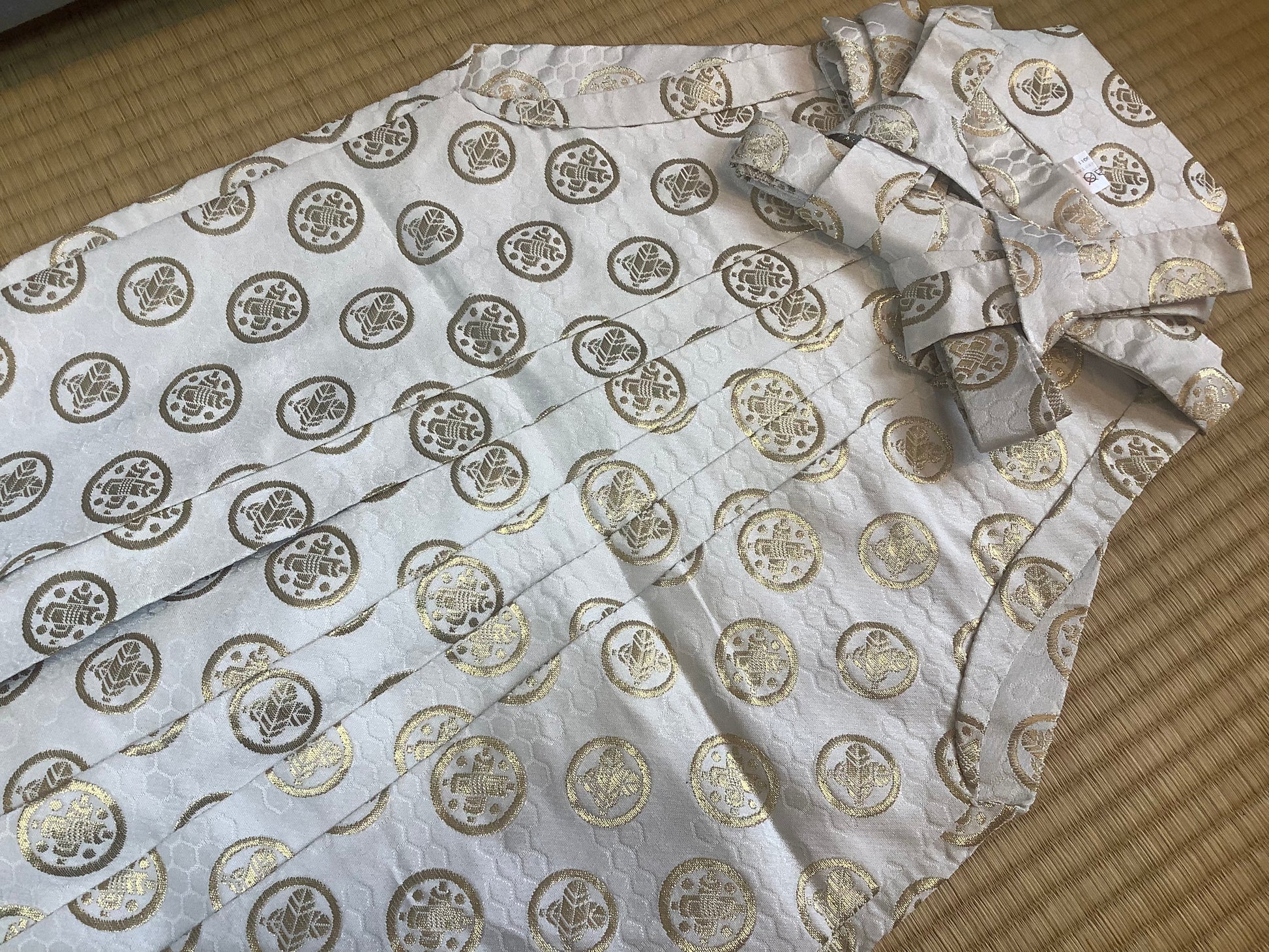 Cream coloured hakama for boys with woven gold mon design. Condition is excellent.