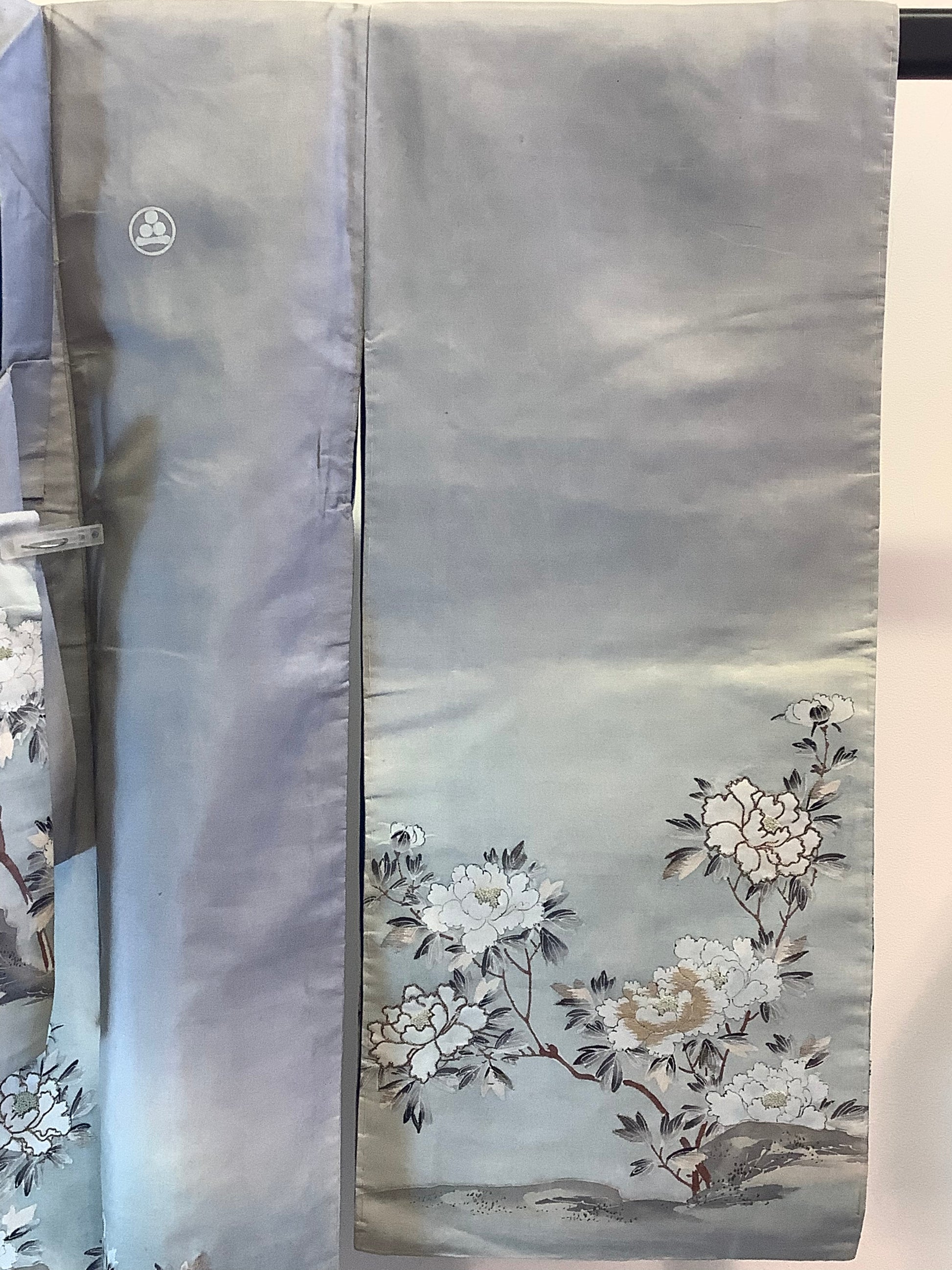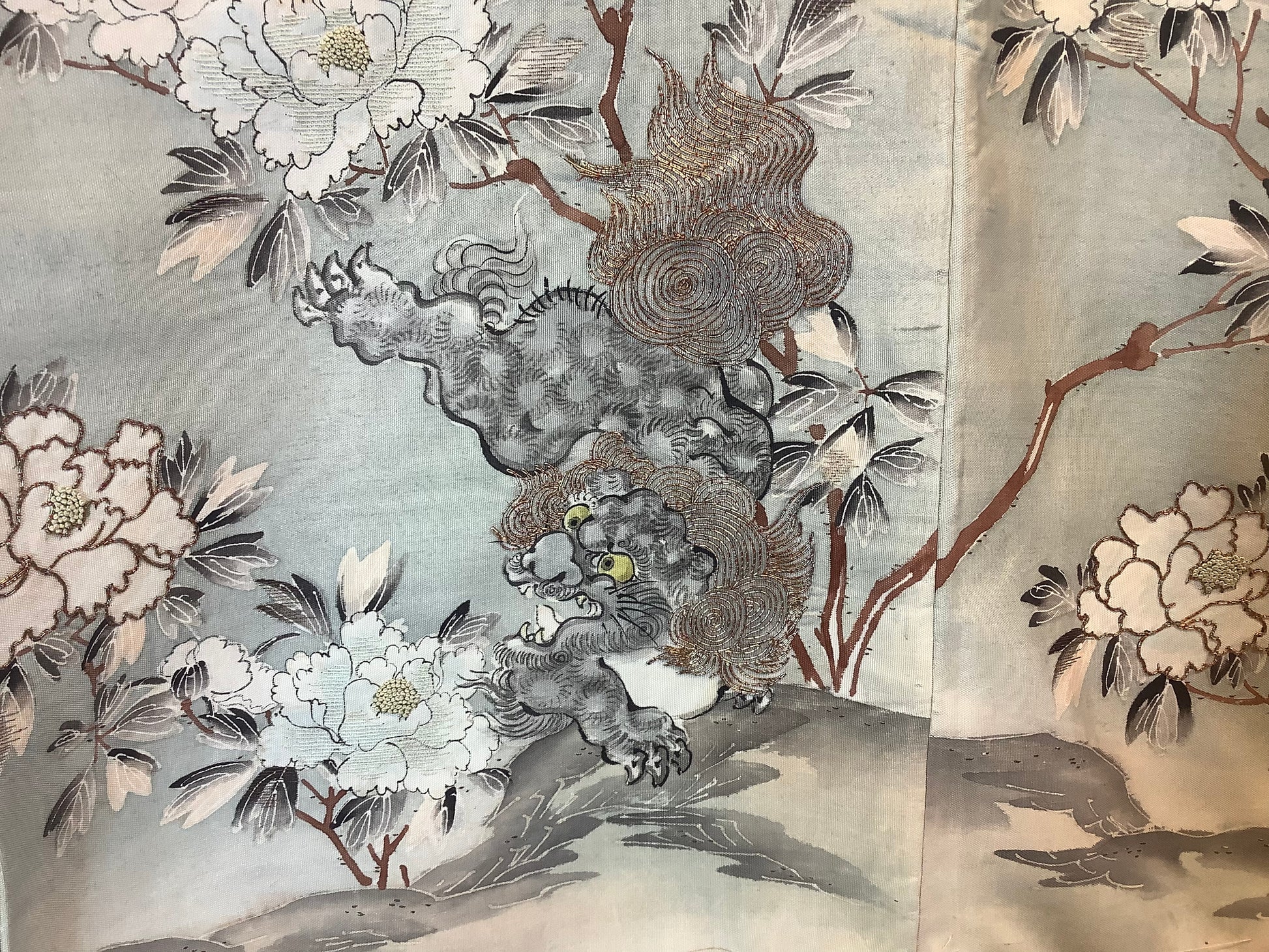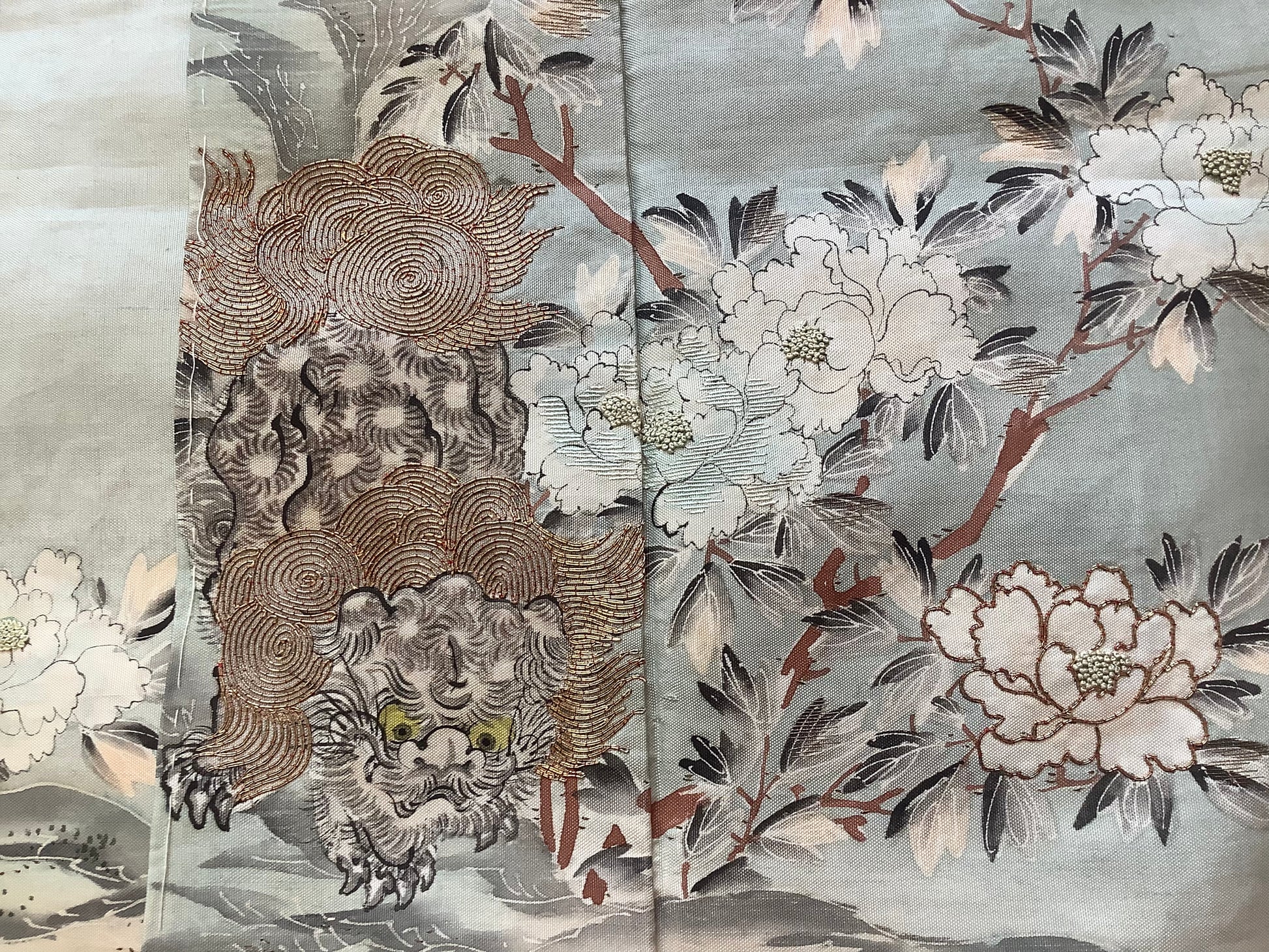 Stunning Meiji Era boys formal kimono with five mon. Fine silk shade dyed , painted and embroidered. Five characterful shishi lions play among the peonies and rocks. The peony centers are in sakiora stitch, and the shishi have fine kinkoma work.there is one tiny pin hole in the plain part of the back, around waist level. The hem is padded. Condition is excellent.