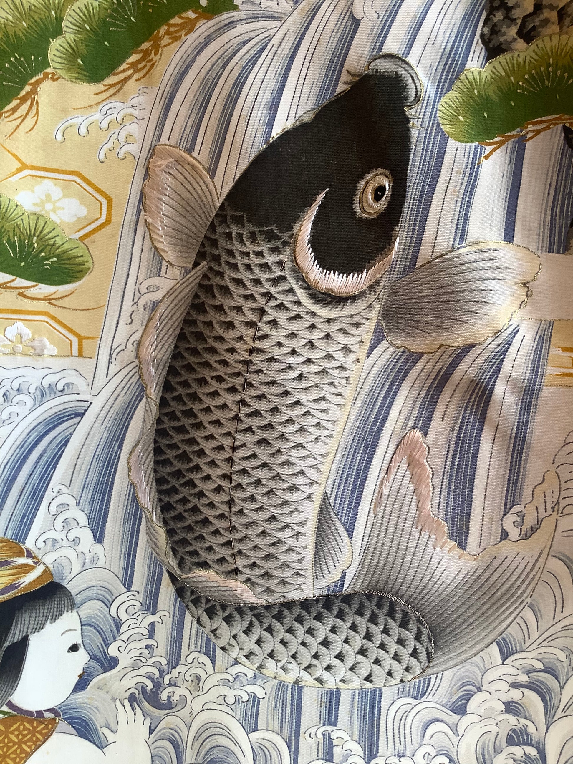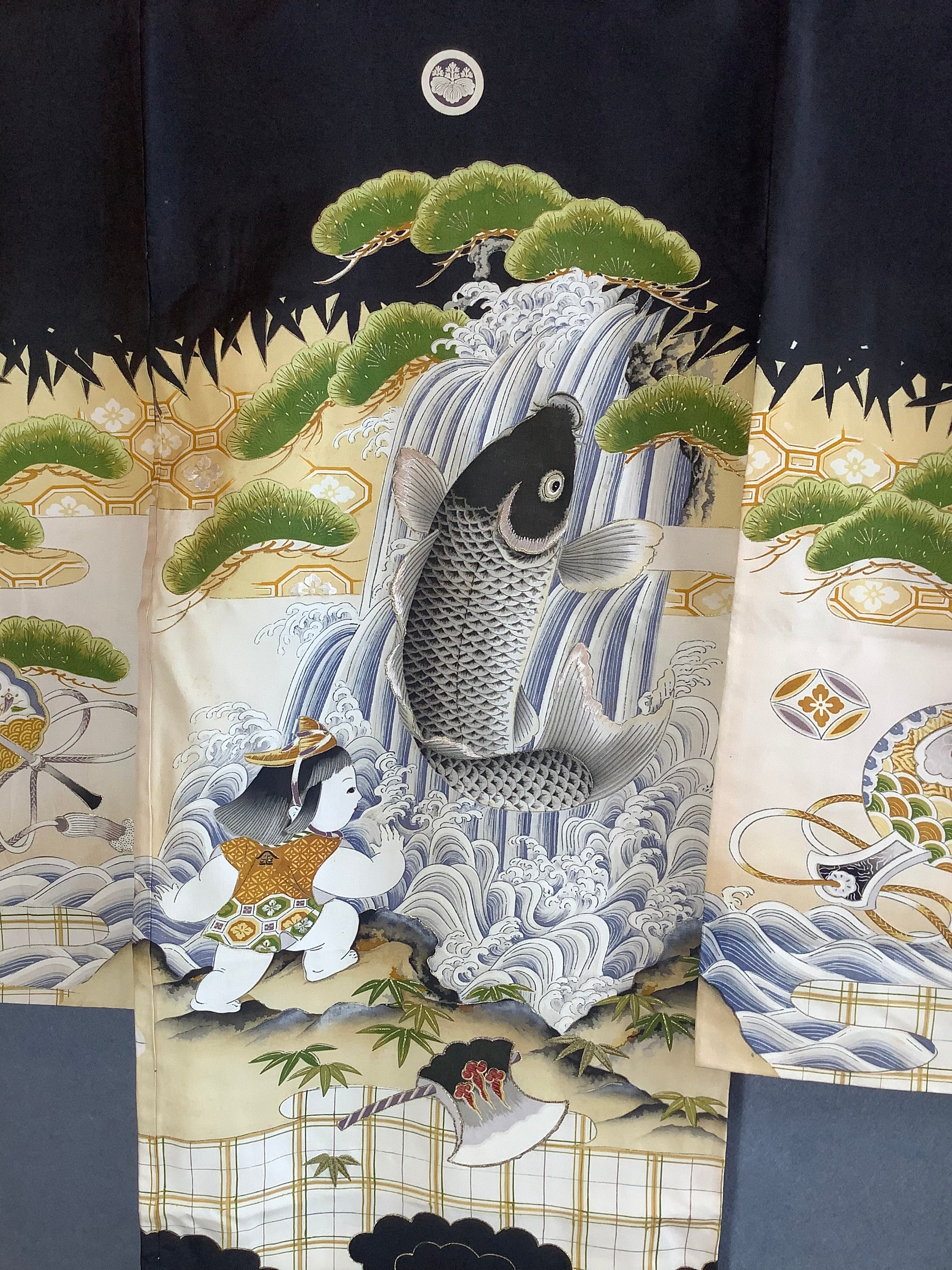 Yuzen dyed silk kimono. Leaping carp with embroidered highlights, with the hero Kintaro. Condition is excellent.