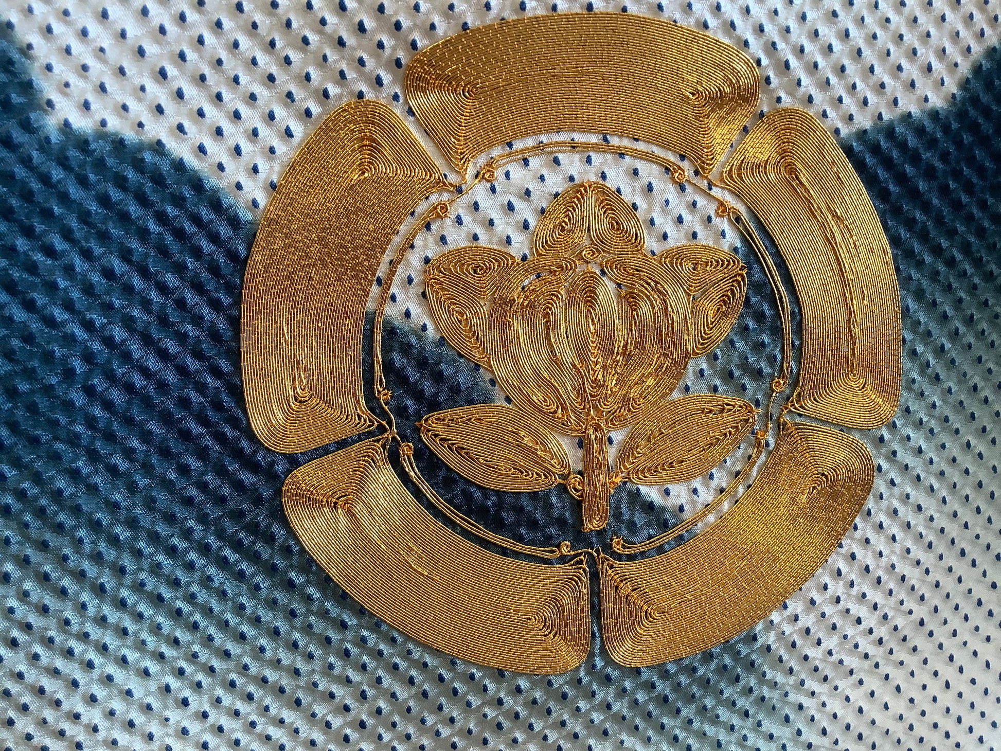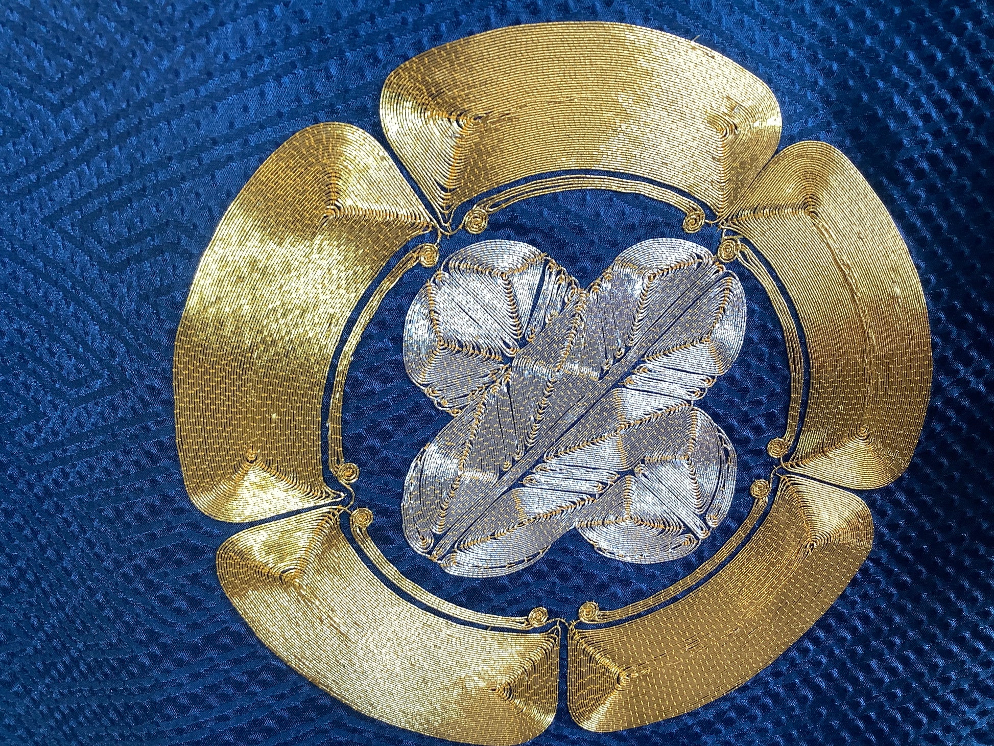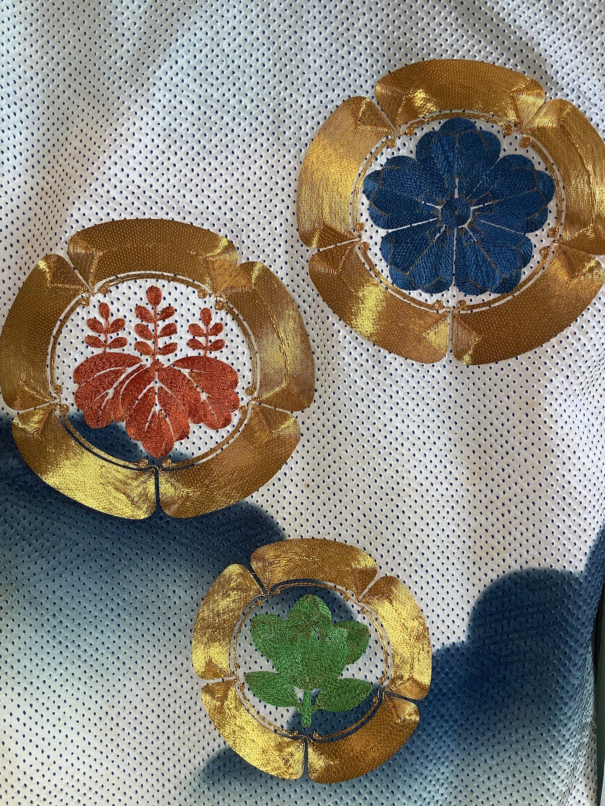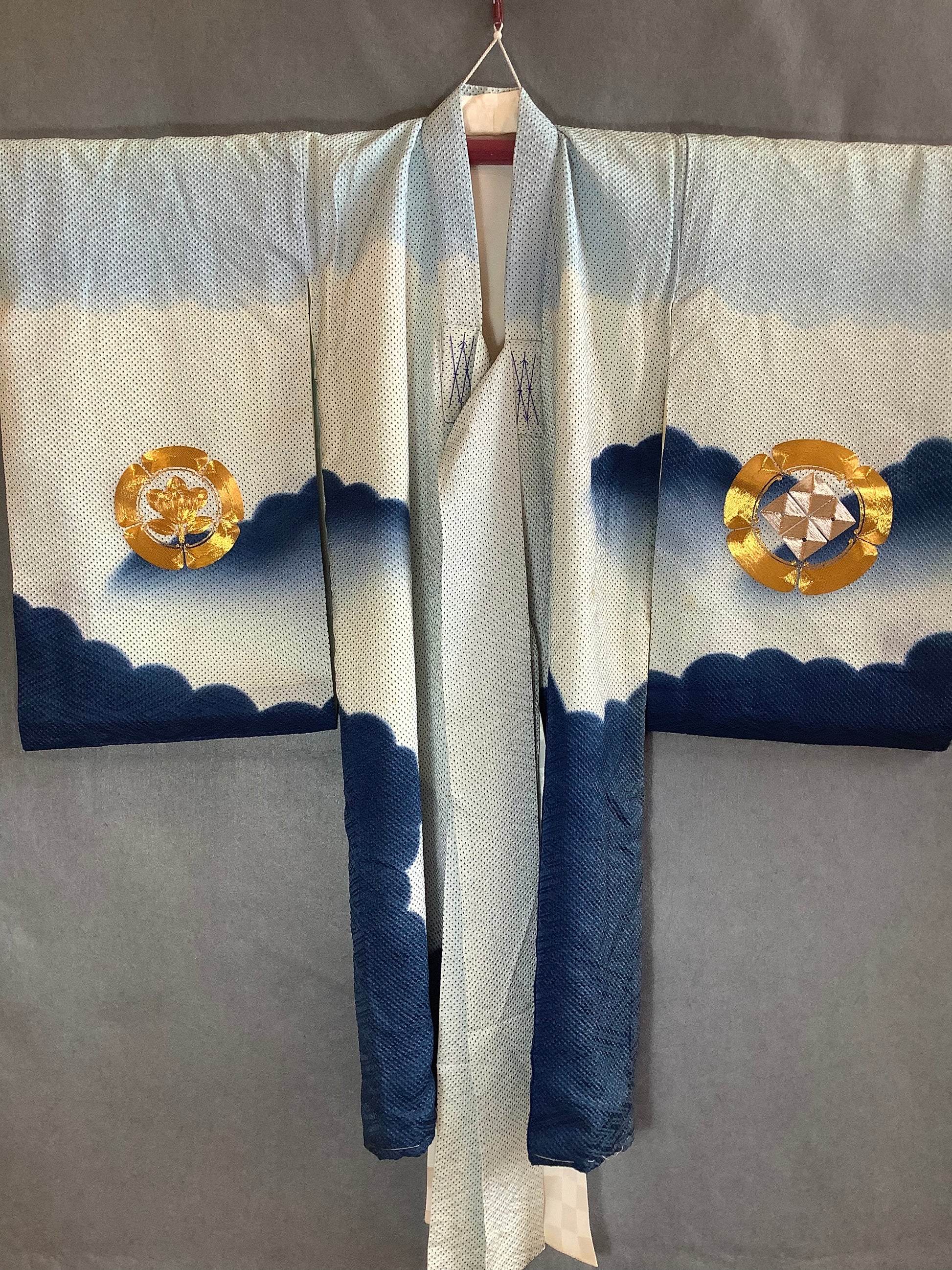 Full shibori rinzu silk kimono with shade dying and kinkoma embroidery. This piece has its juban, and sleeves are triple lined. There are a couple of light spots. Condition is very good.