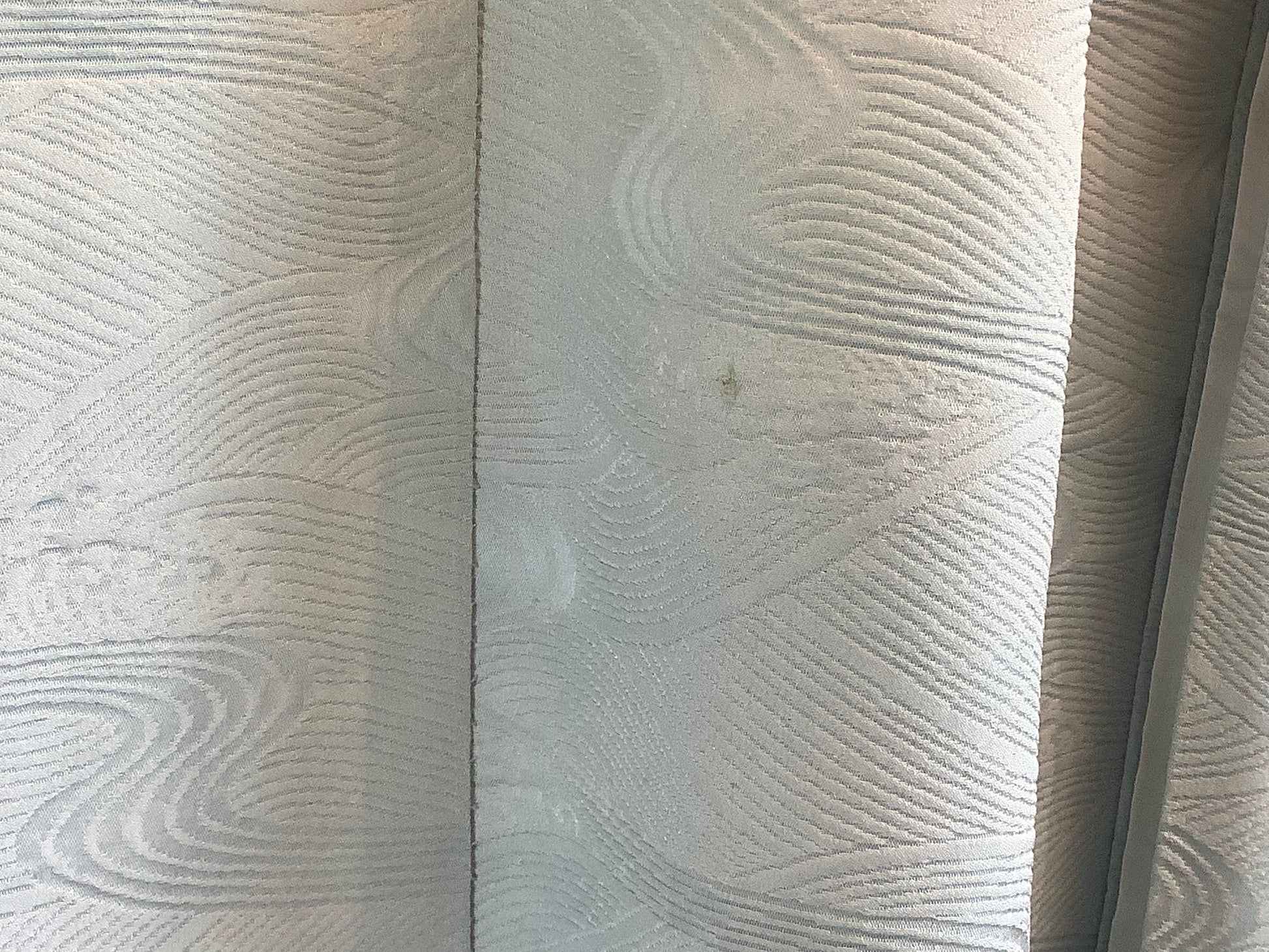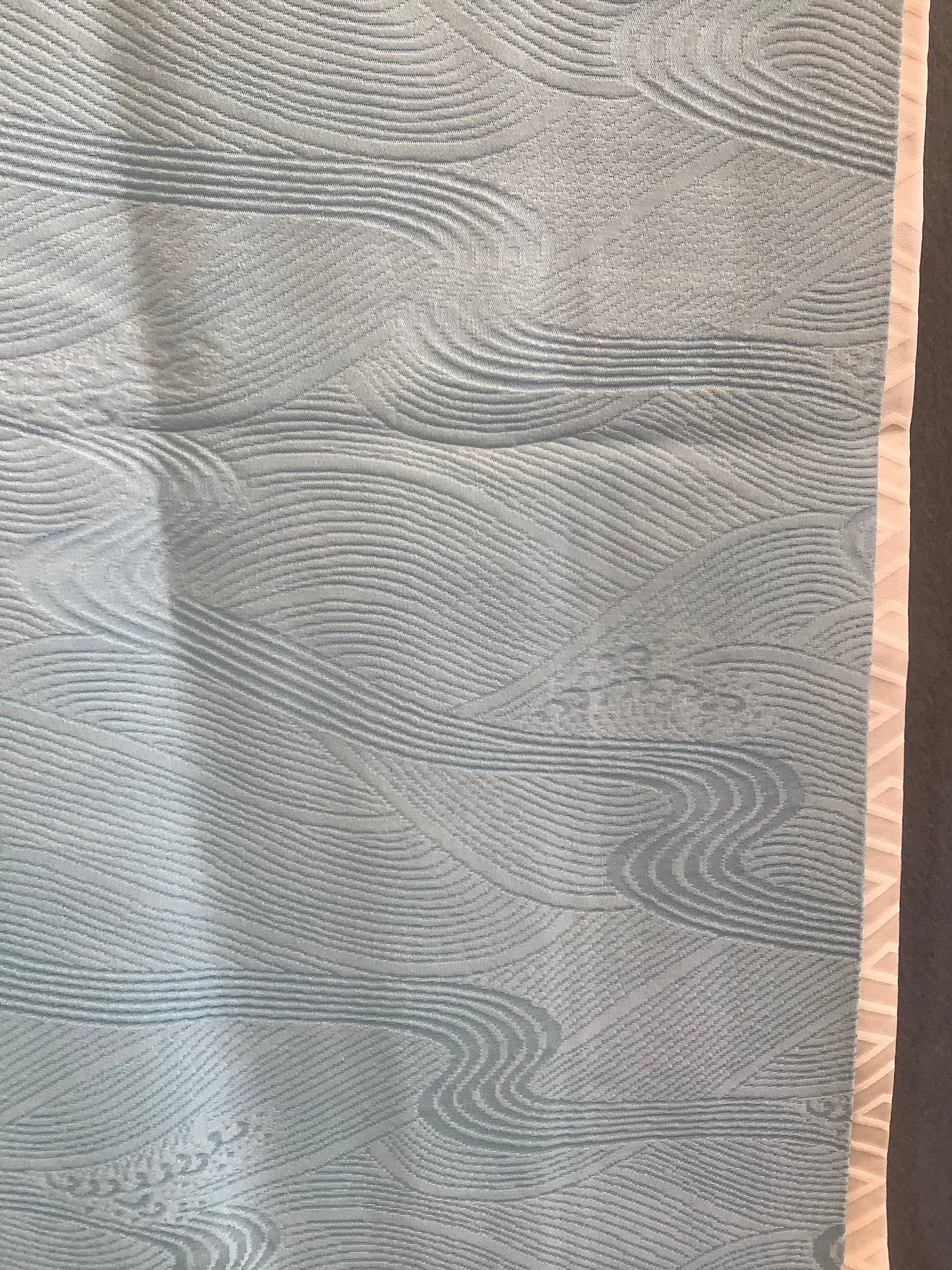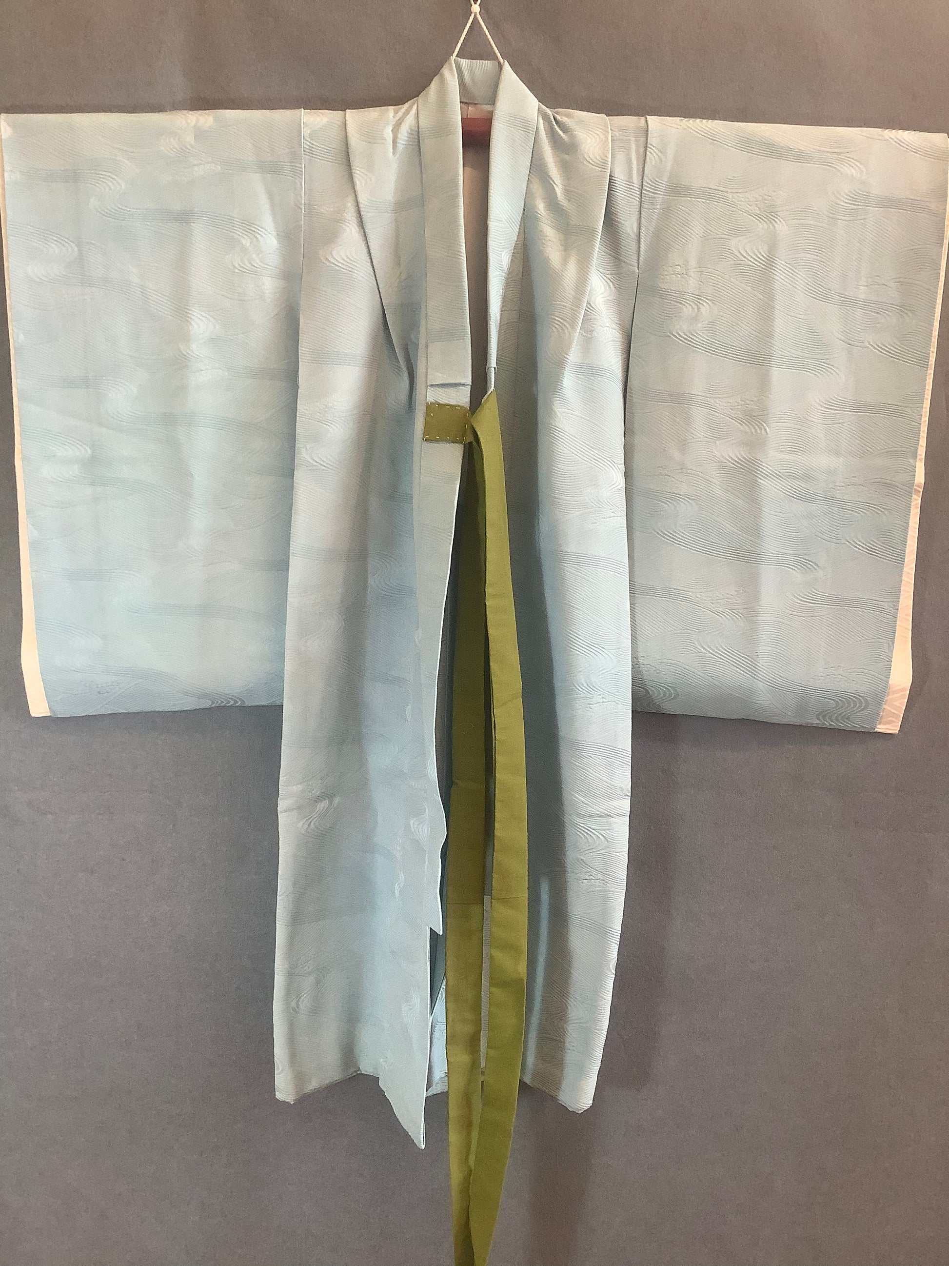 Pale blue silk kimono for boys with woven wave pattern. There is a secondary sleeve lining. There is a tuck in the shoulders. There is a small spot on the back at waist level.