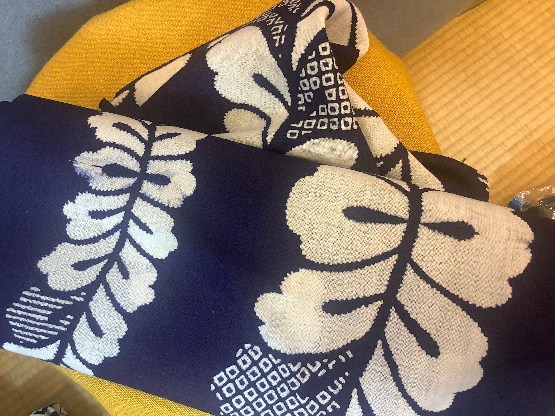 An early Showa cotton bolt for yukata. Bold pattern of wisteria. There are some slight smudges and colour bleeding, to be expected with indigo dying. Bolts are at least 10 meters long.
