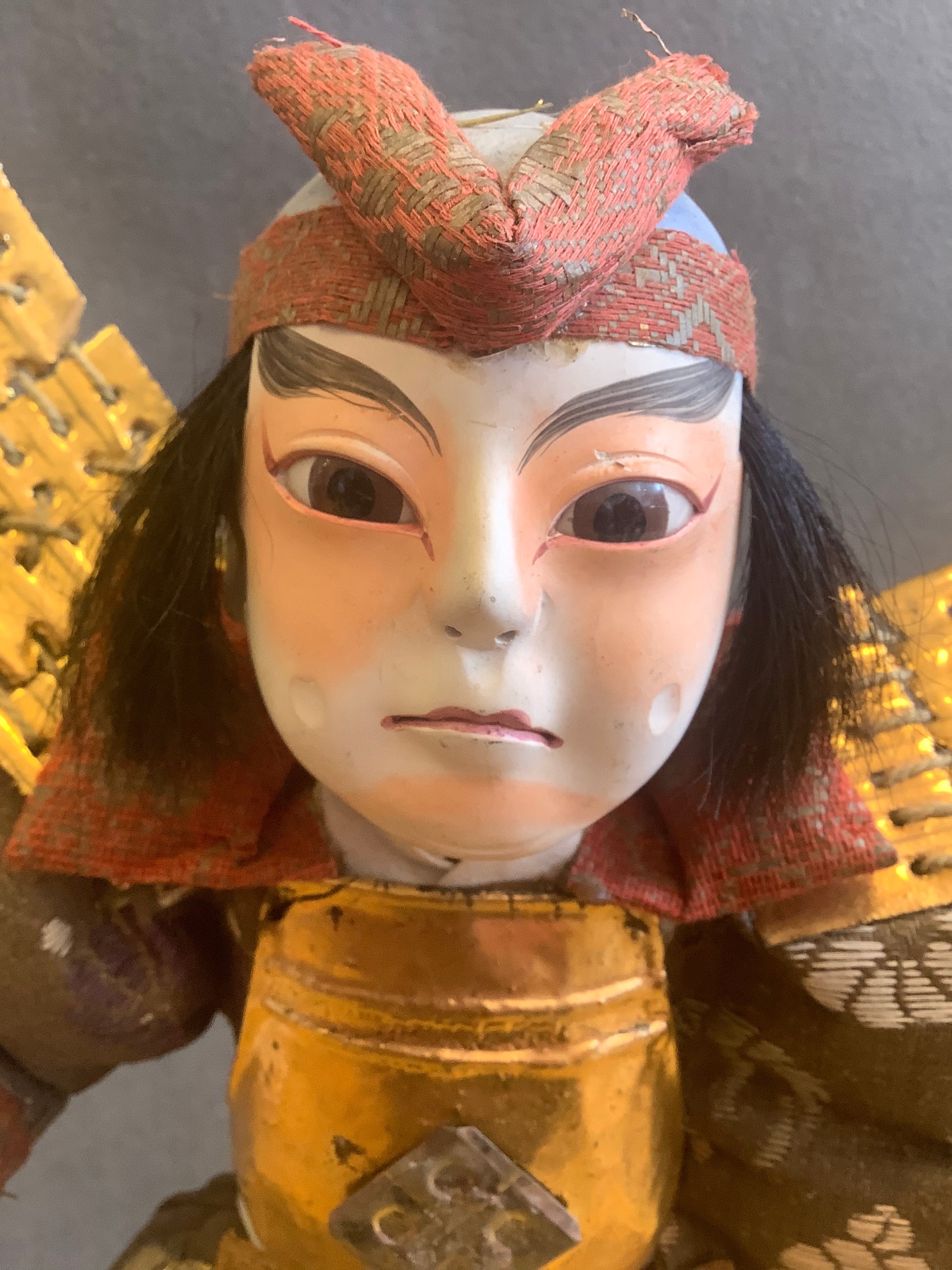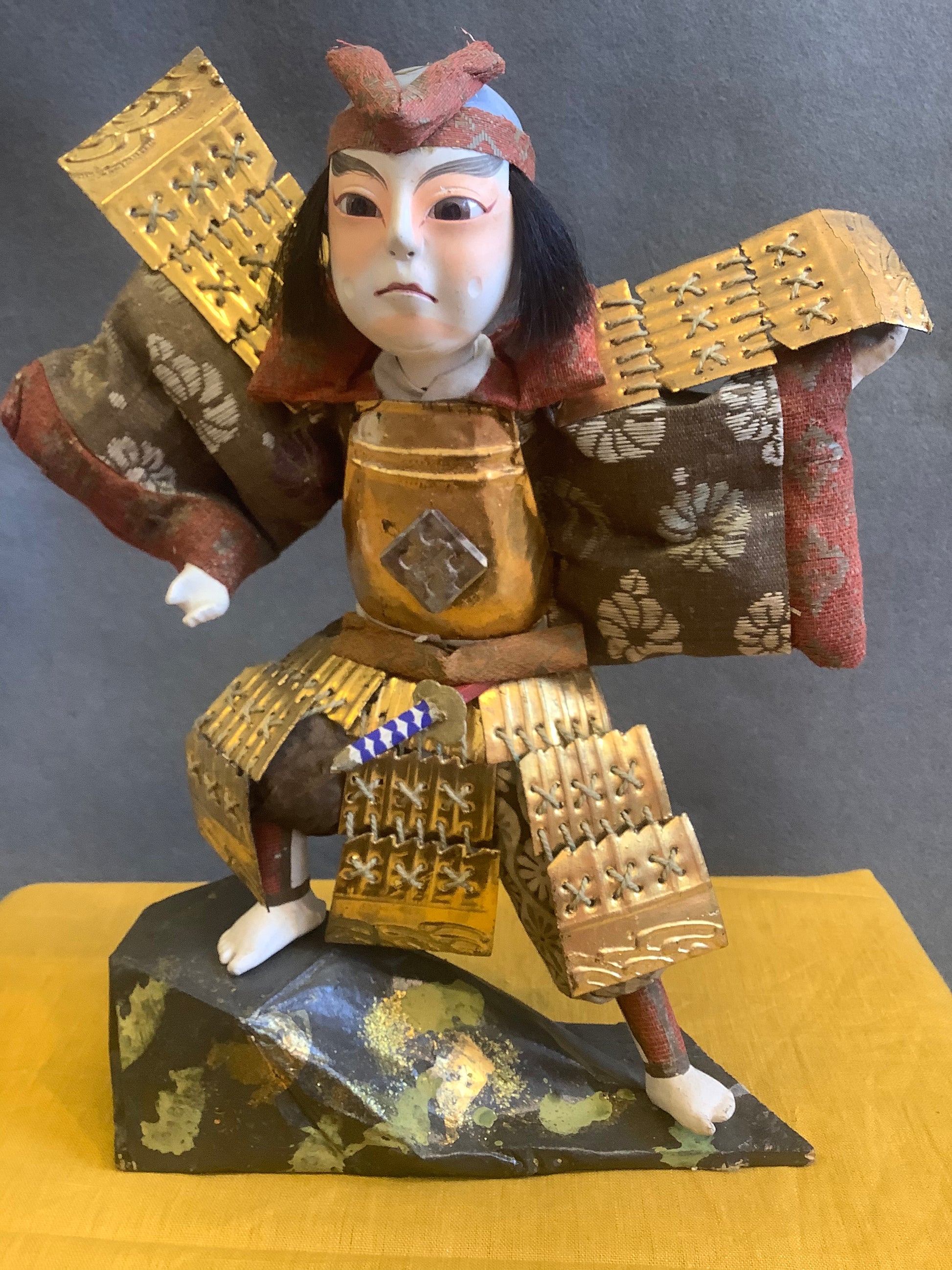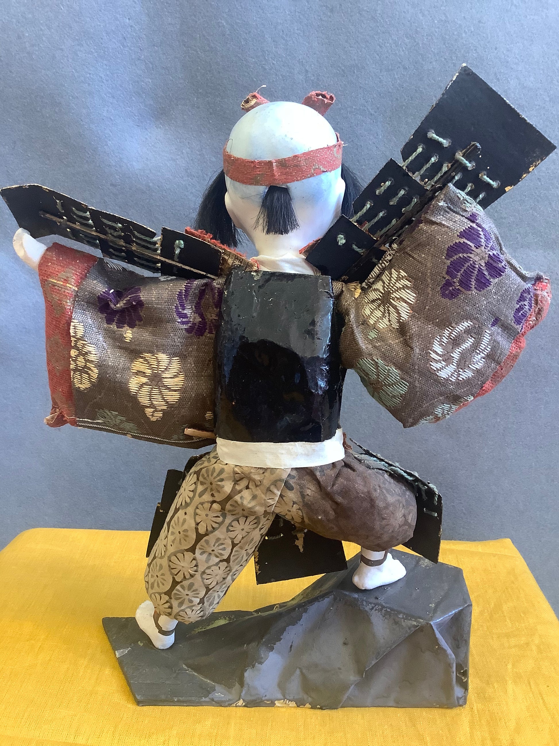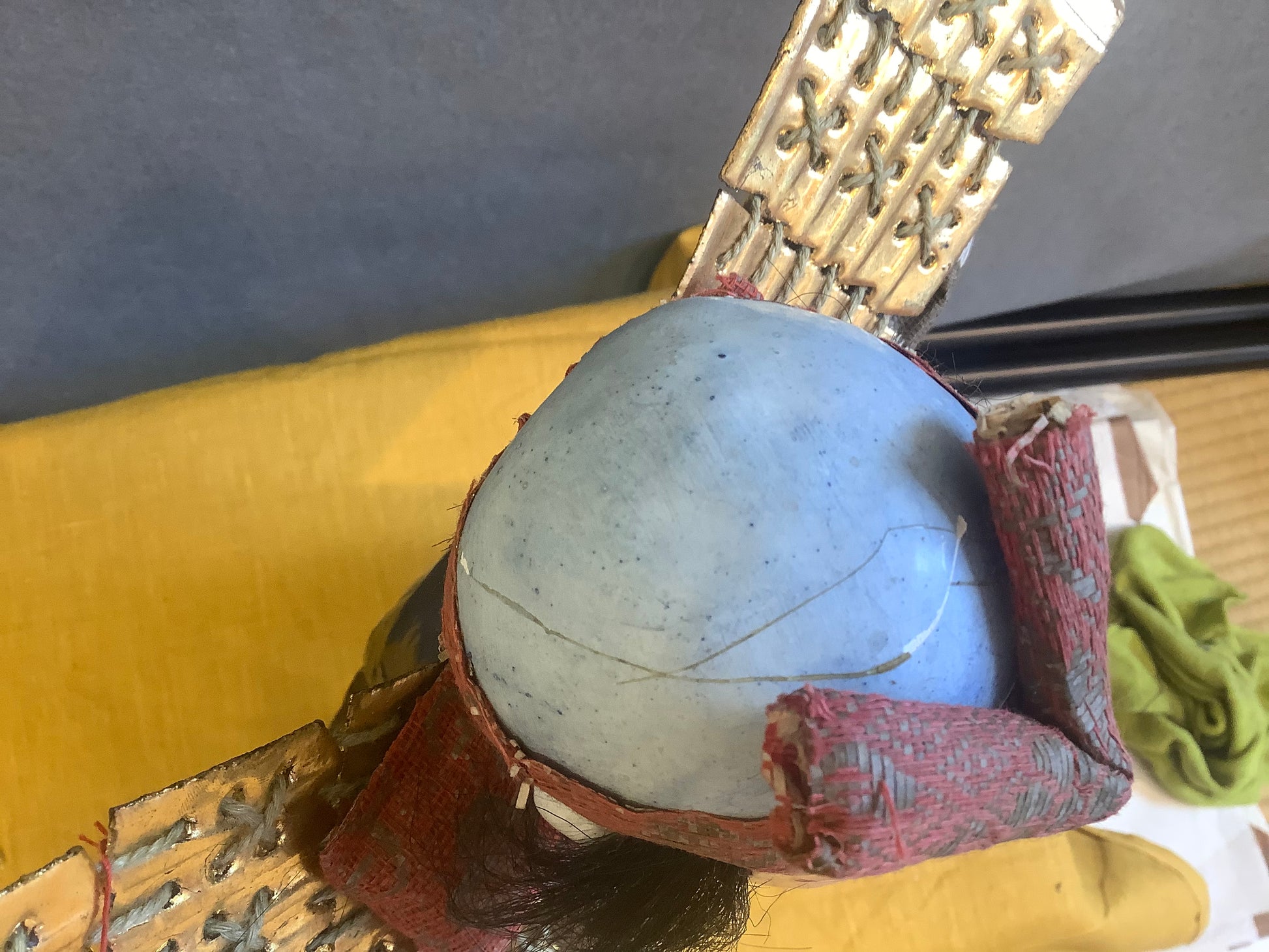 Boys festival gofun display doll. Made from paper and silk brocade, with gofun hands, feet and head. Meiji / Taisho period. He has cracking to the top of his head. Condition is very good.