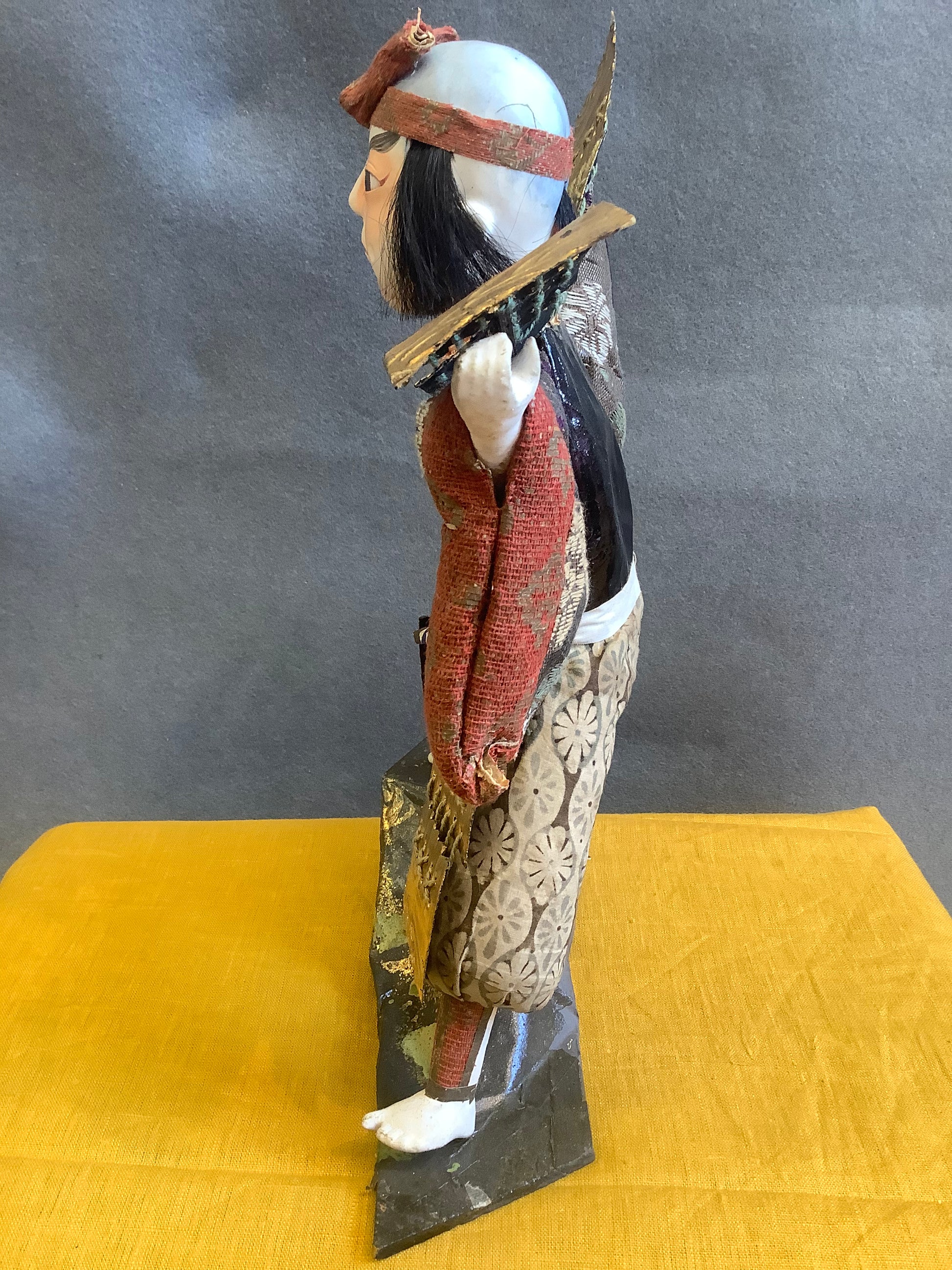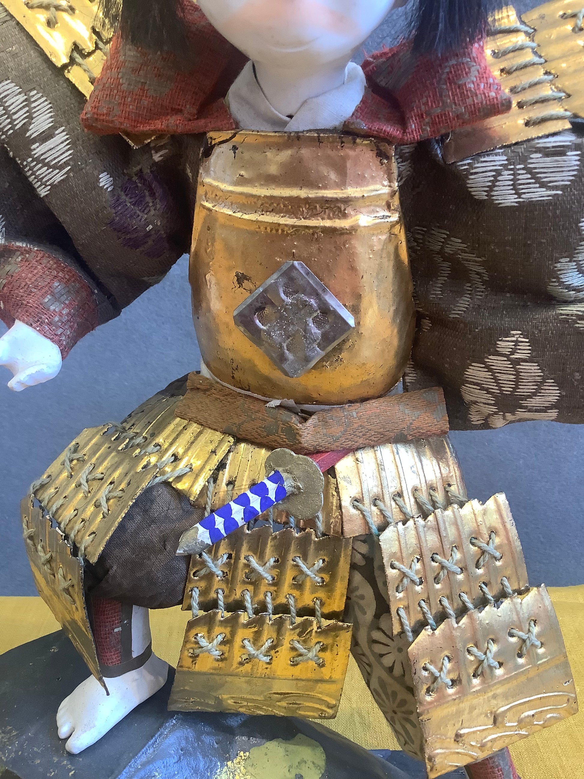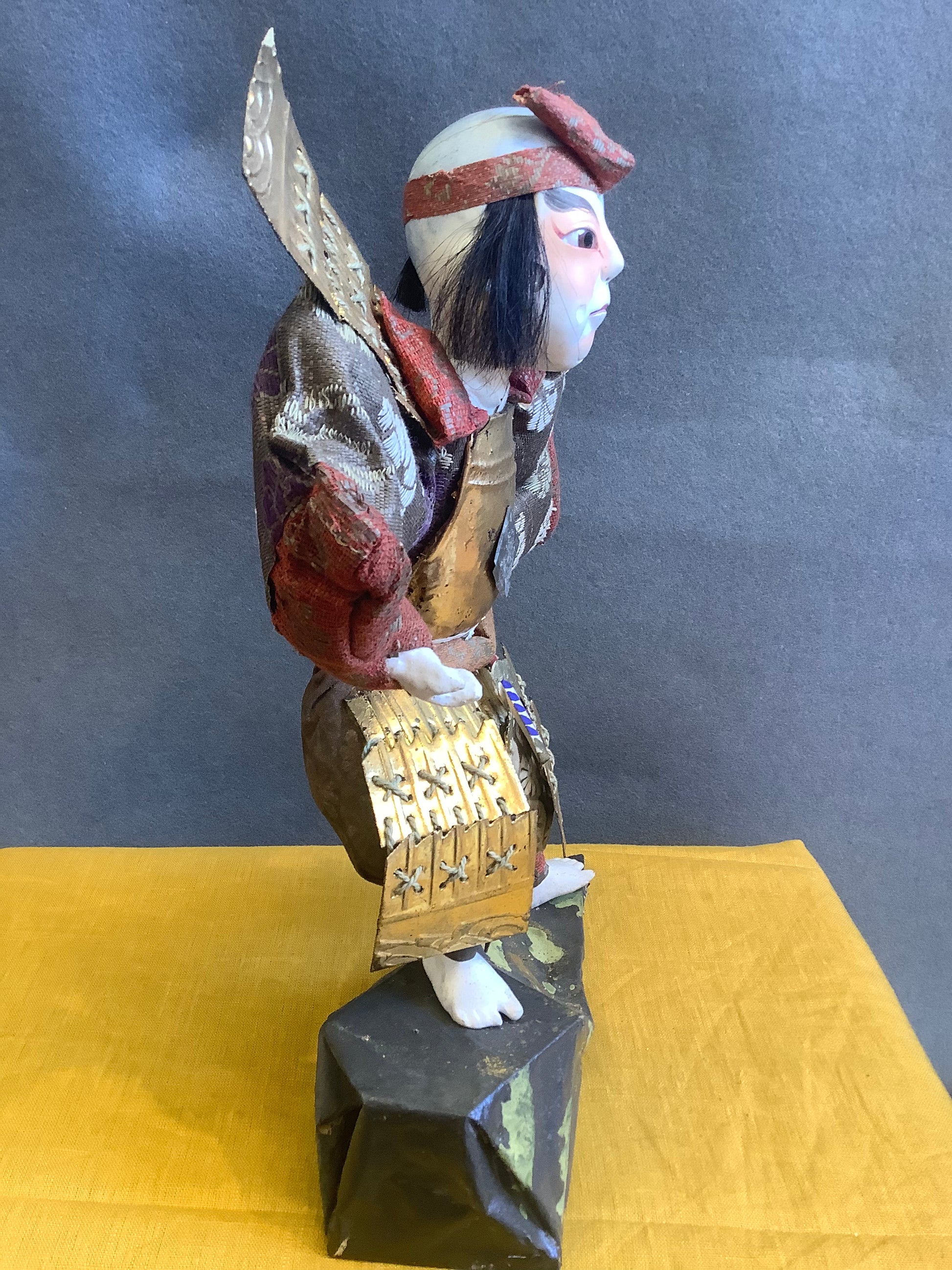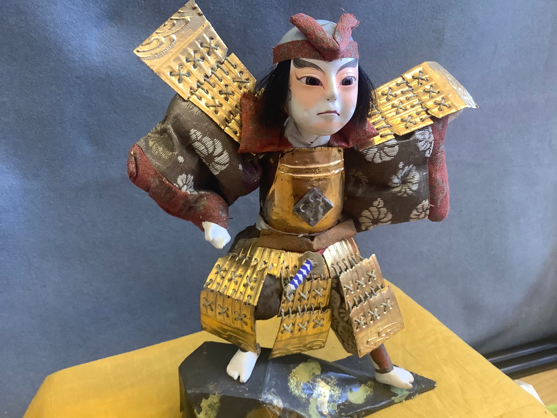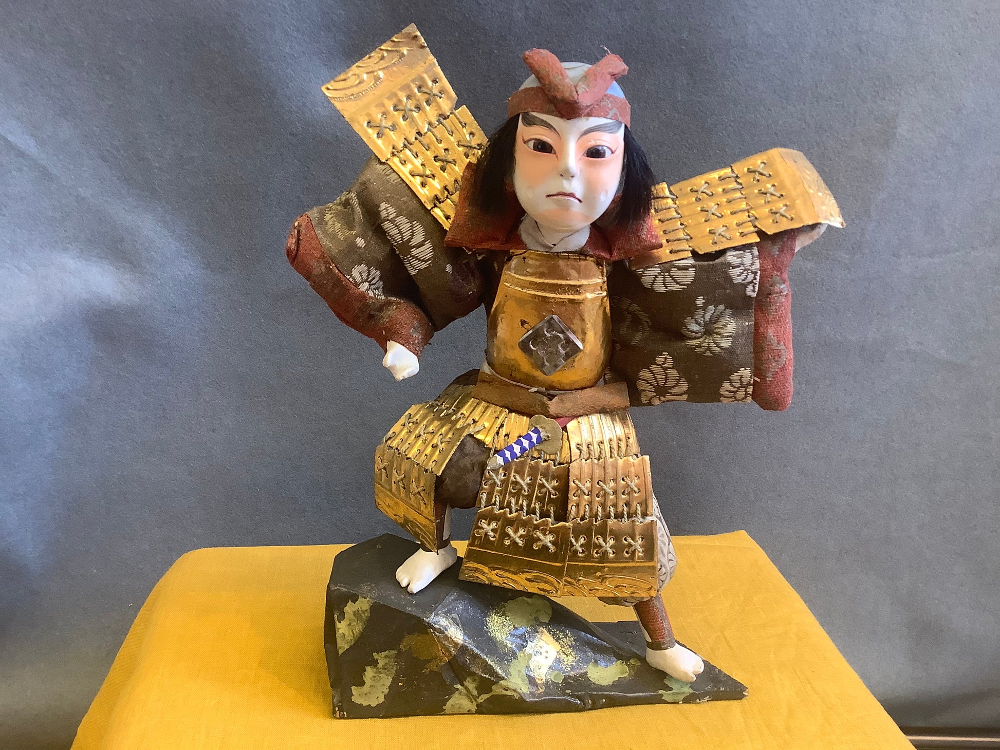 Boys festival gofun display doll. Made from paper and silk brocade, with gofun hands, feet and head. Meiji / Taisho period. He has cracking to the top of his head. Condition is very good.