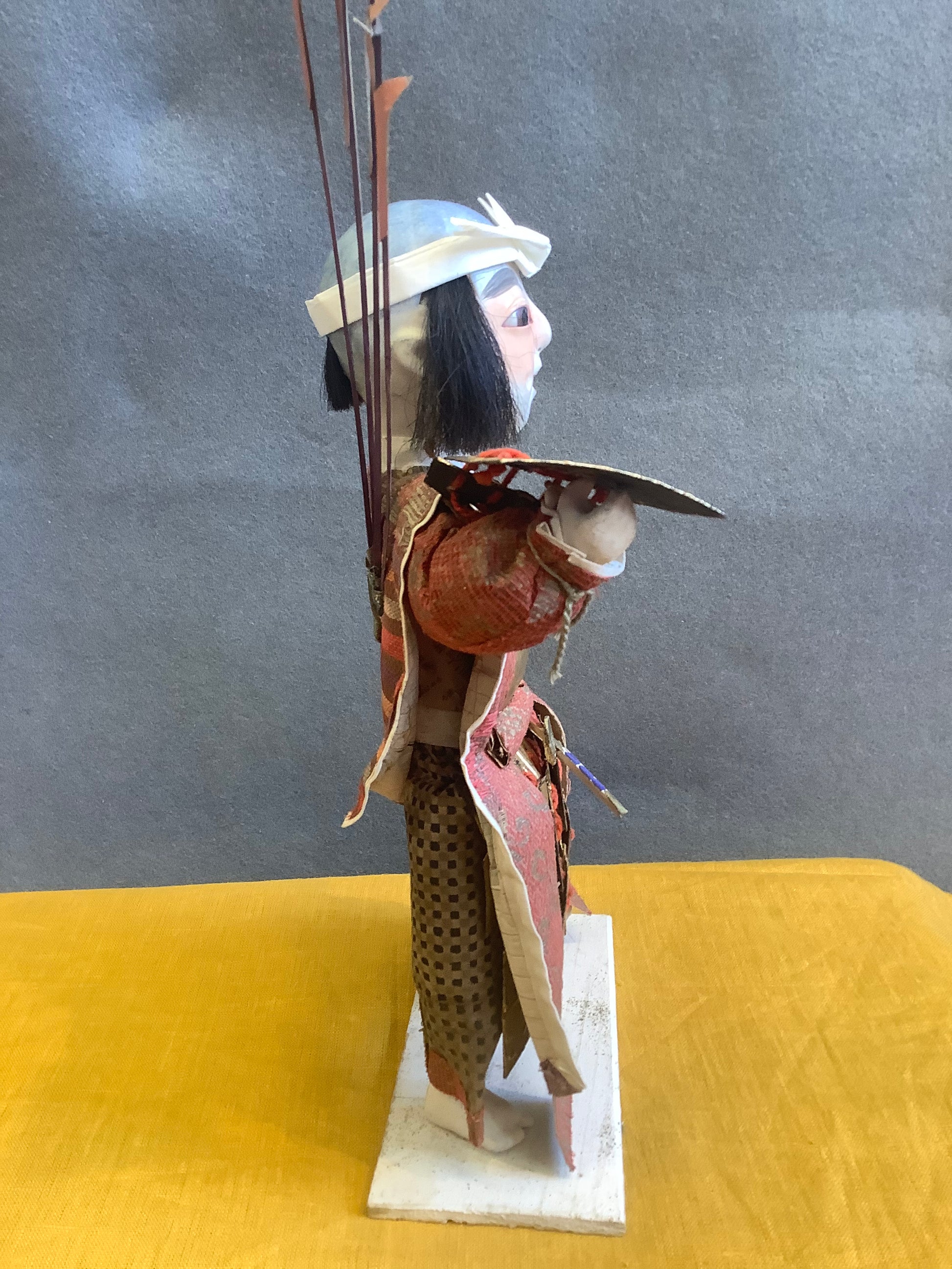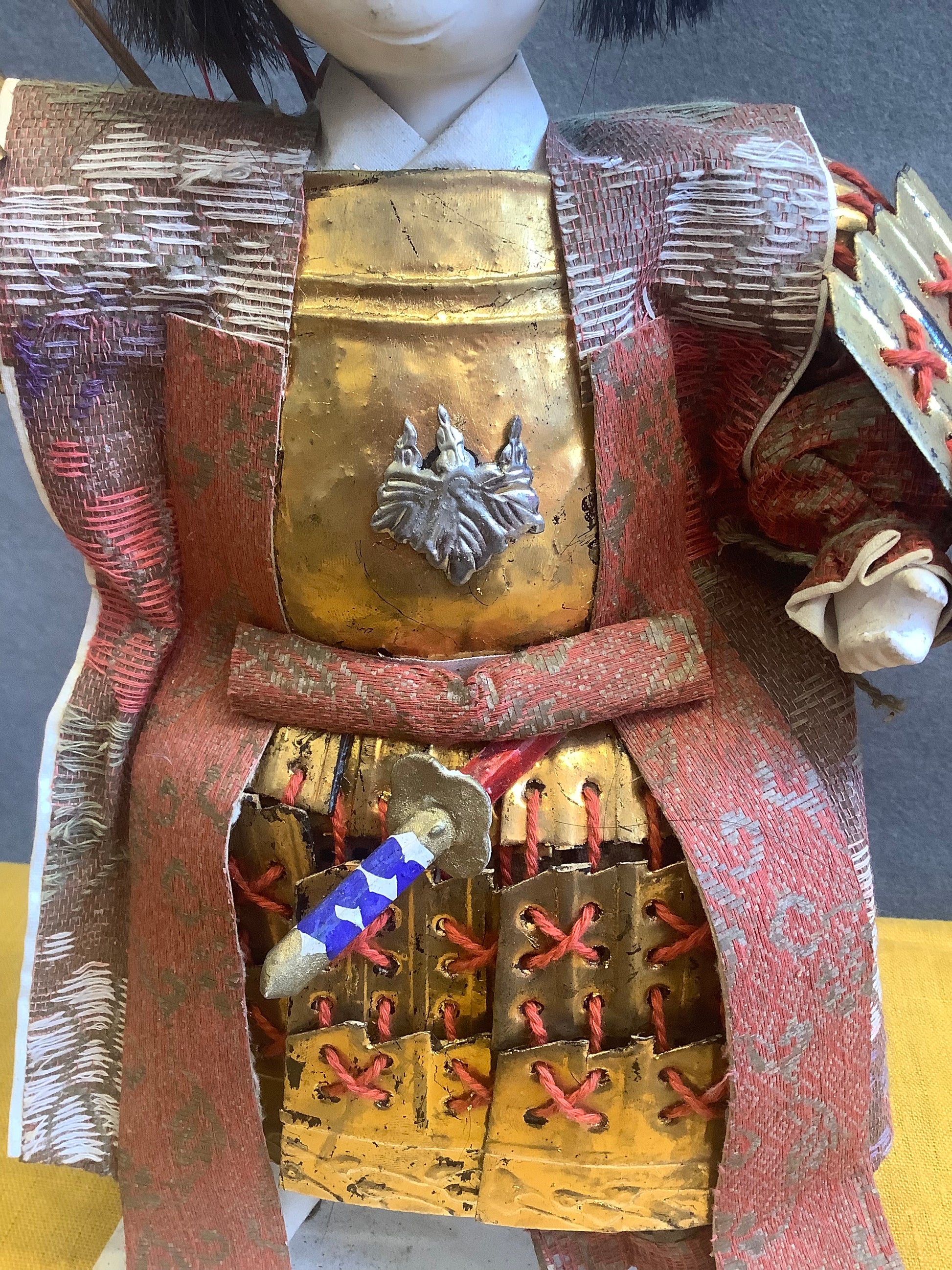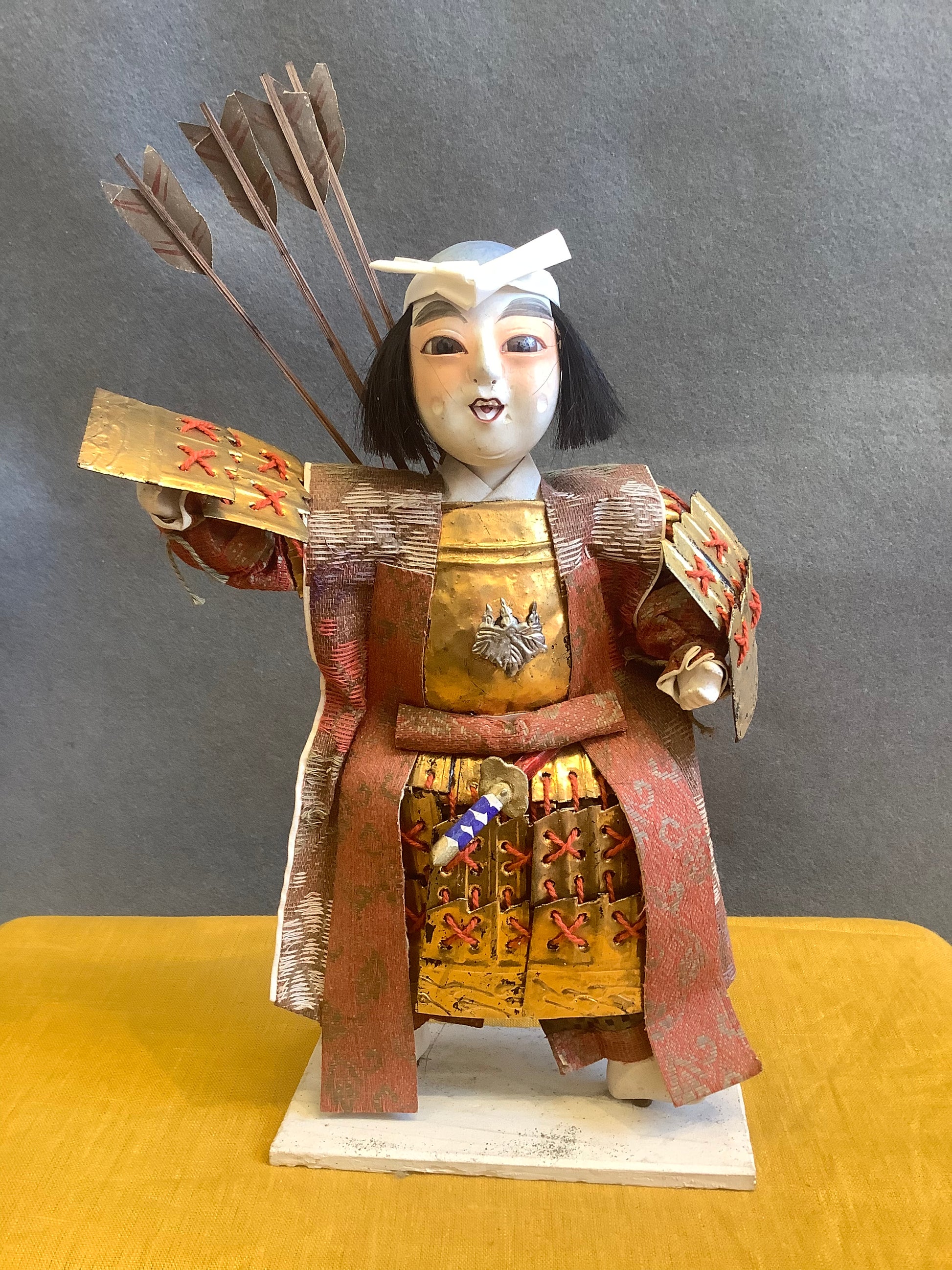 Boy’s festival display samurai doll. Made from paper and silk brocade, with gofun head, hands and feet, glass eyes. He has a replacement paper headband. He dates from the Meiji / Taisho period. Condition is very good.
