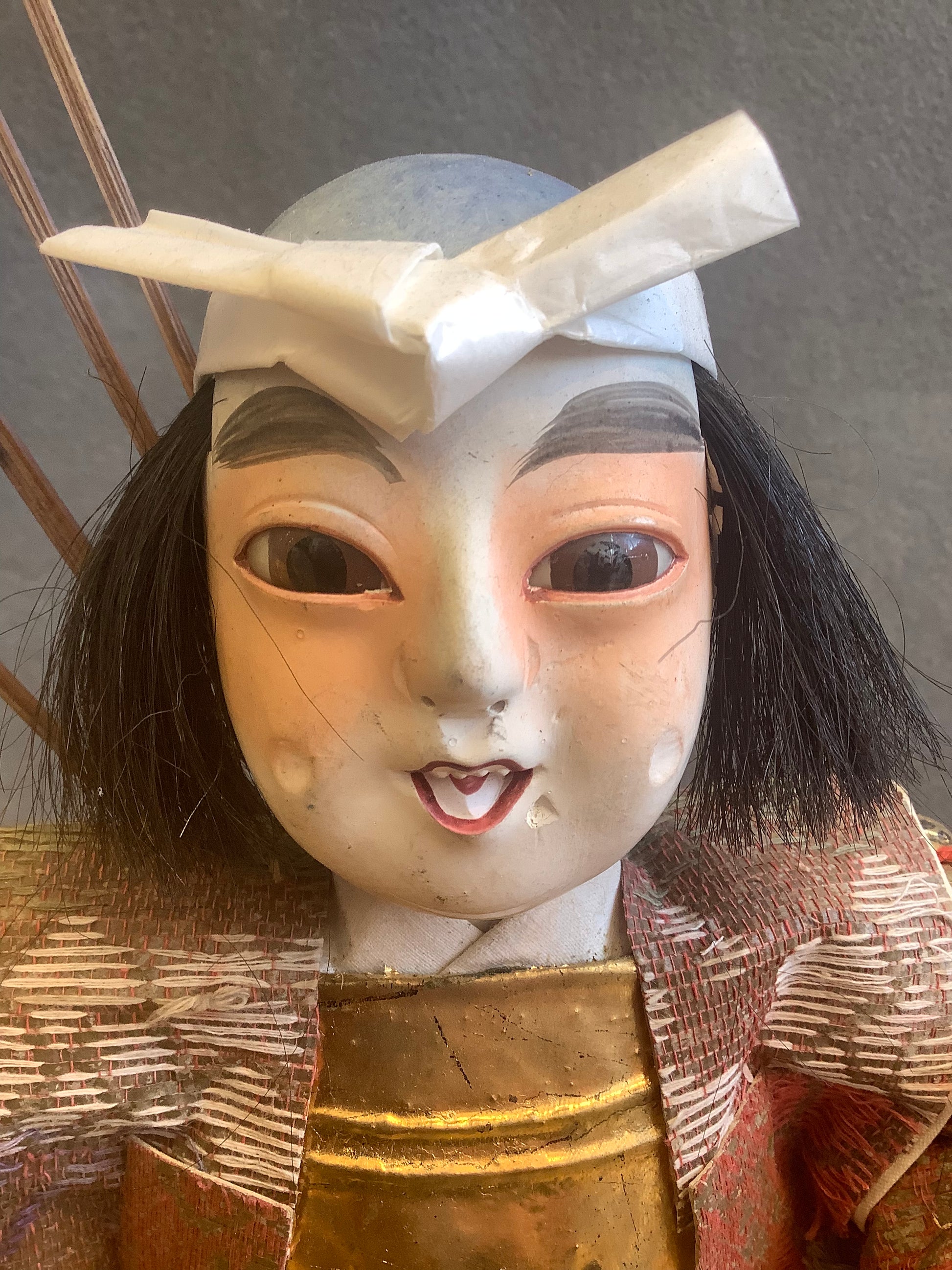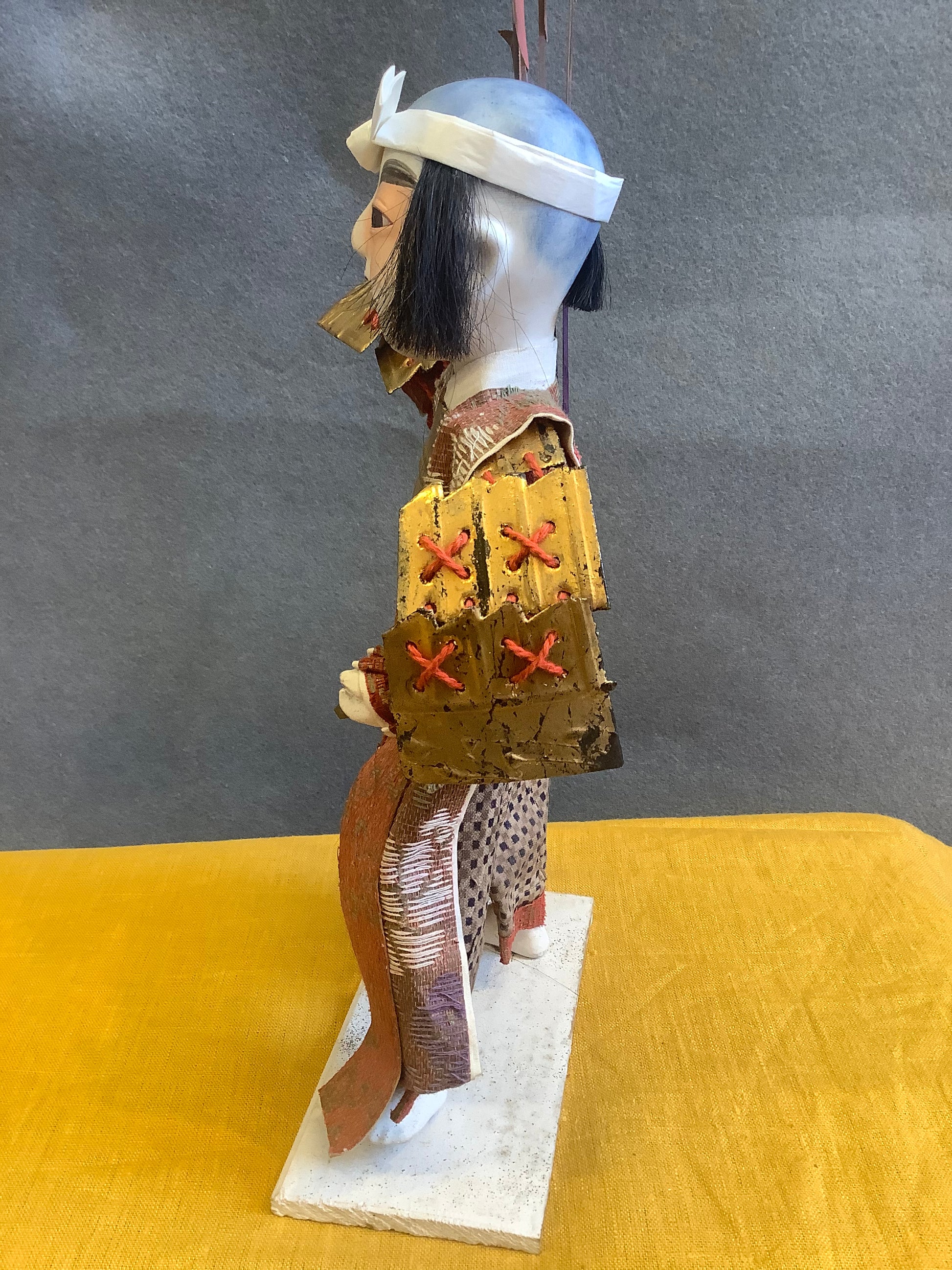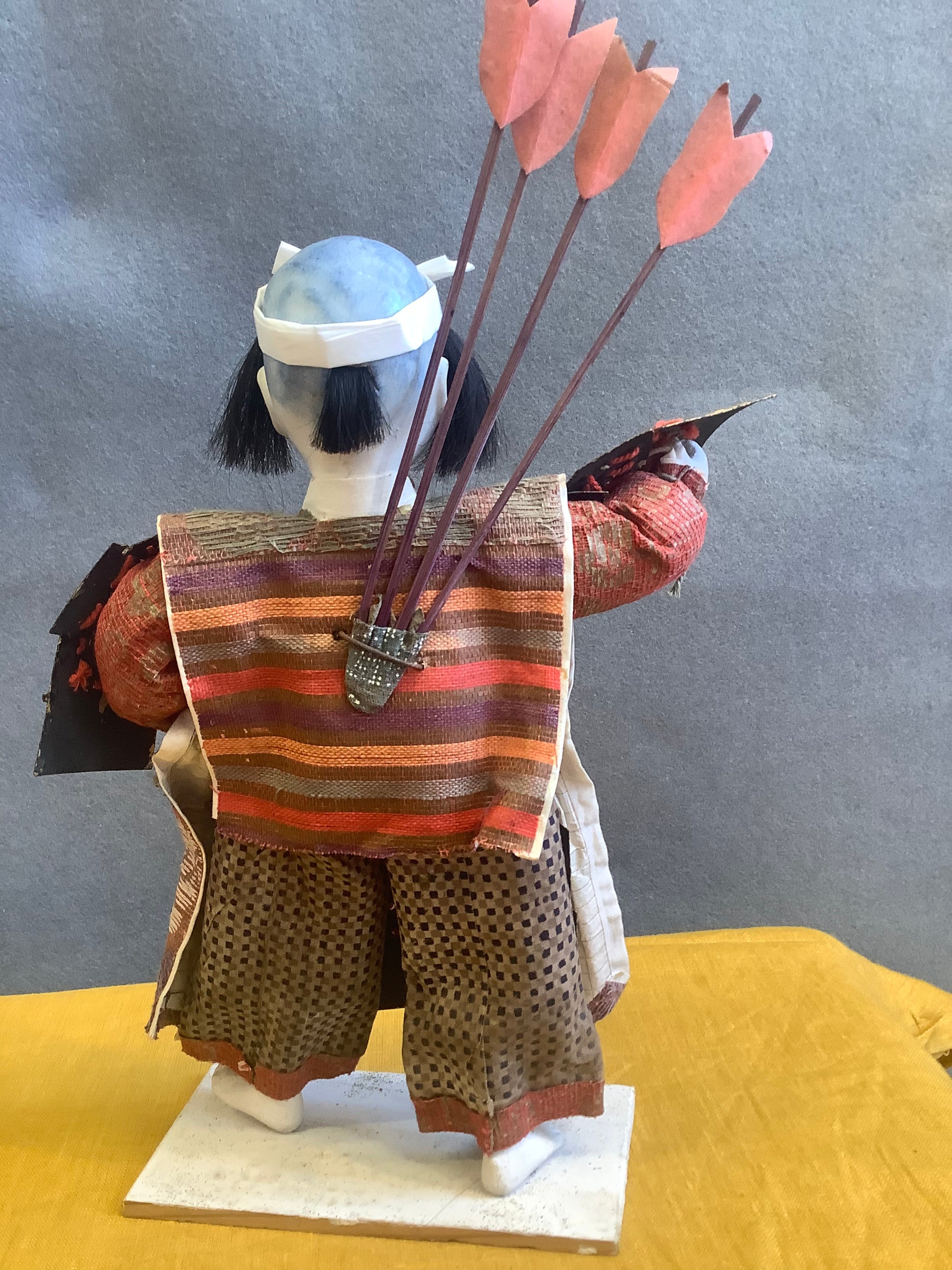 Boy’s festival display samurai doll. Made from paper and silk brocade, with gofun head, hands and feet, glass eyes. He has a replacement paper headband. He dates from the Meiji / Taisho period. Condition is very good.