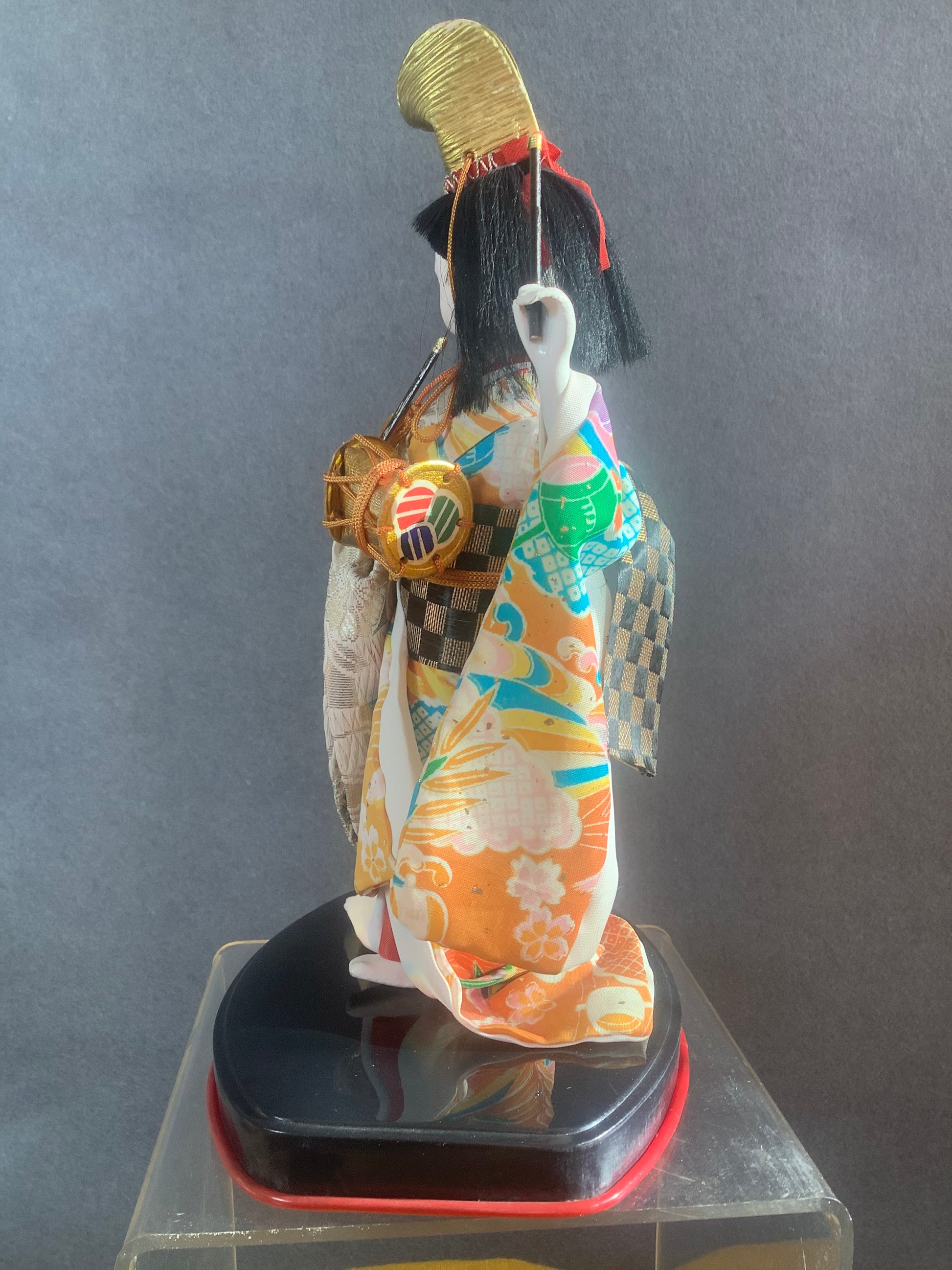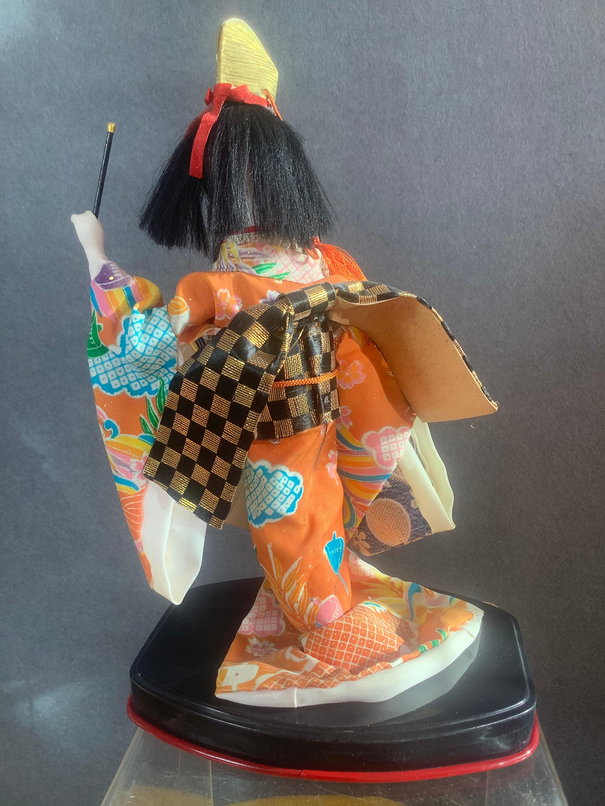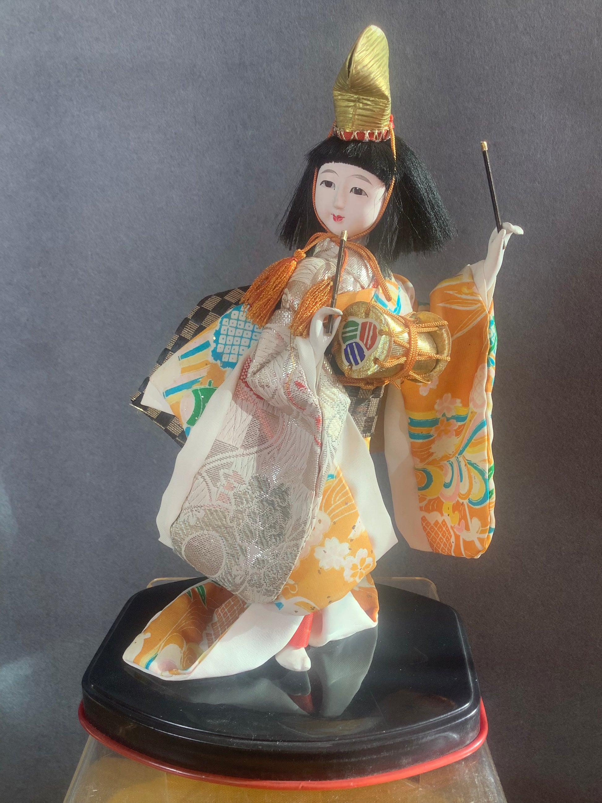 Gofun faced dancing doll with taiko drum. Some overall light fading. Base is plastic.