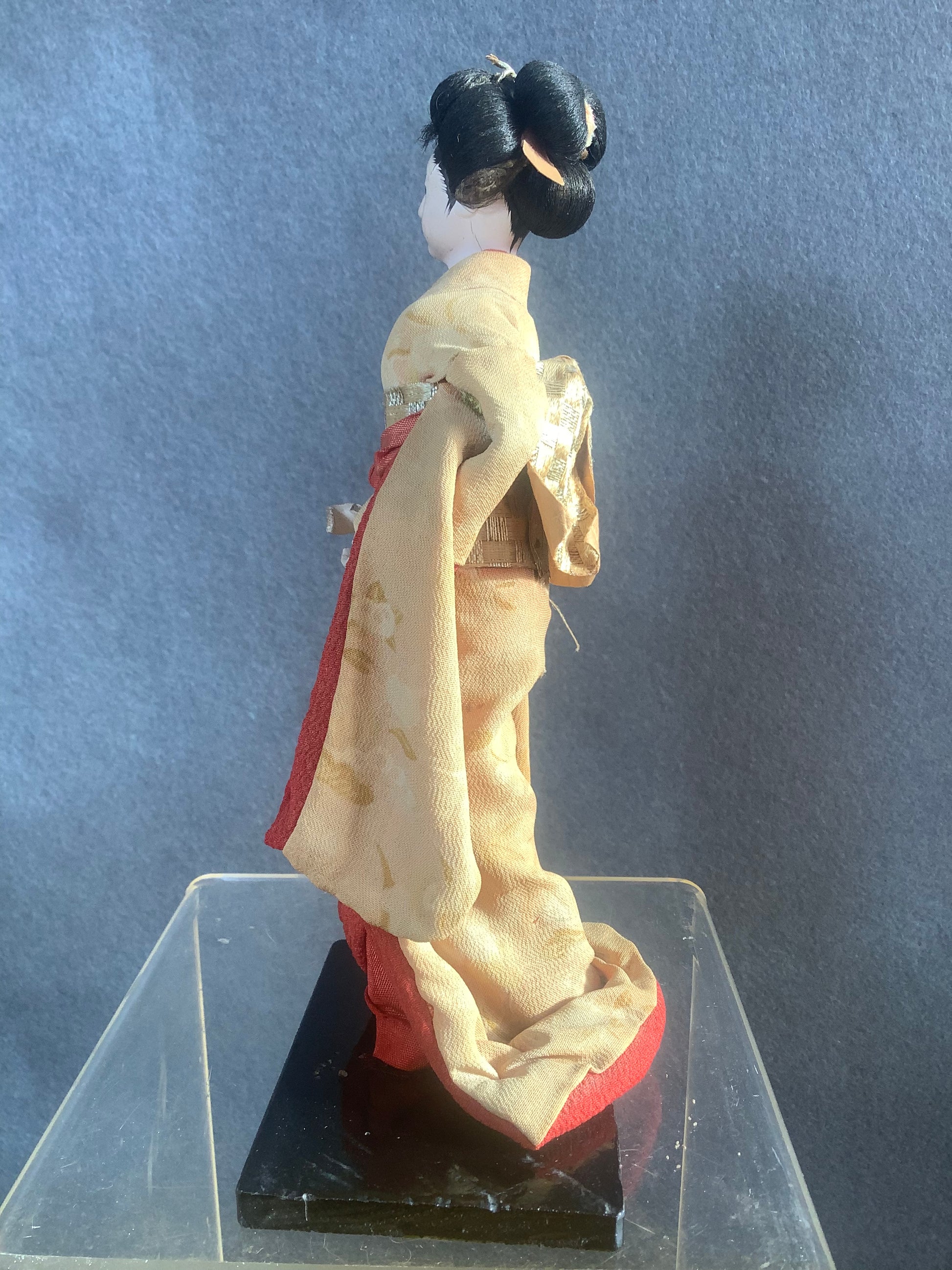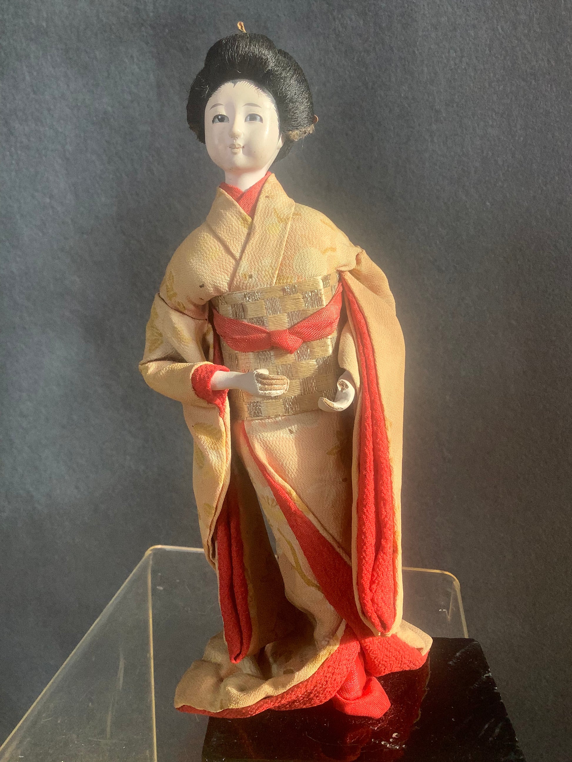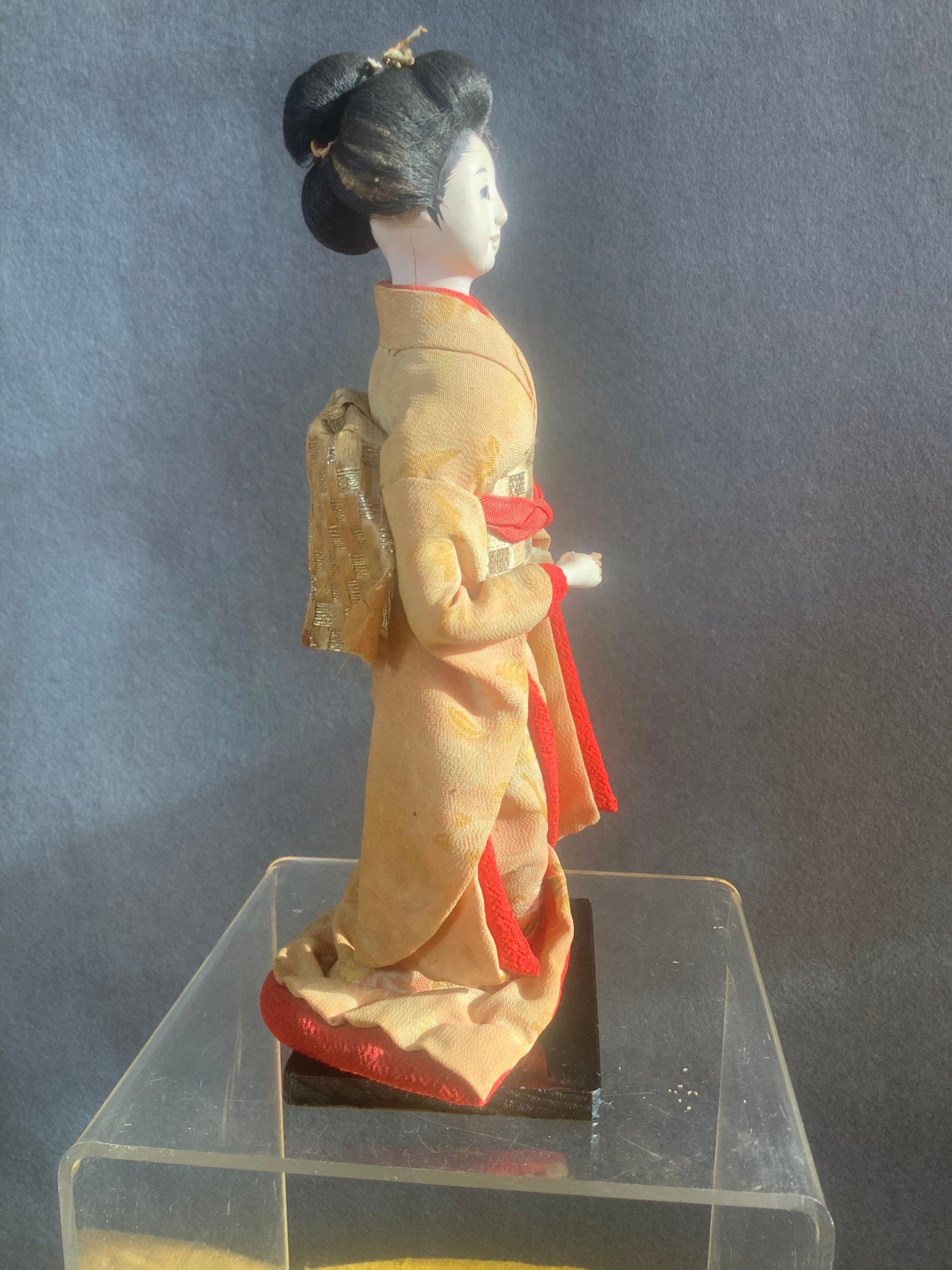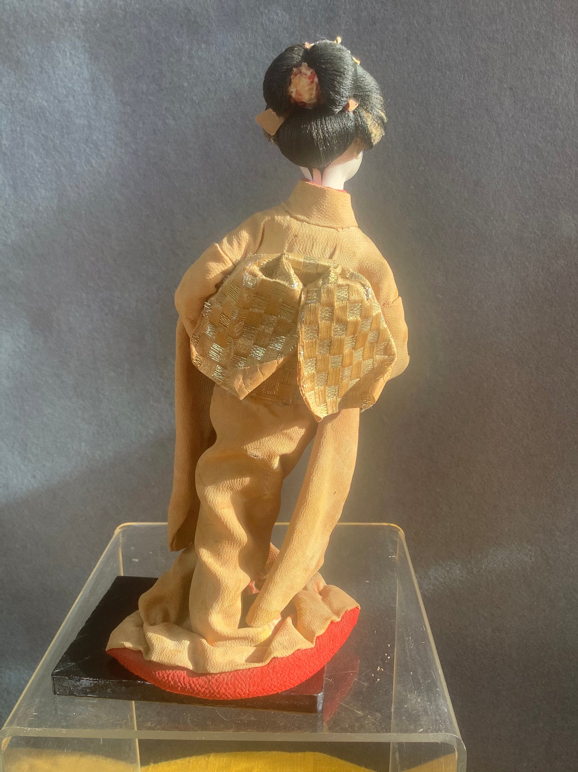 Small gofun doll with glass eyes and lacquered wooden base. Overall discolouration to silk clothing, damage to hands and feet. Condition okay. She will still display.