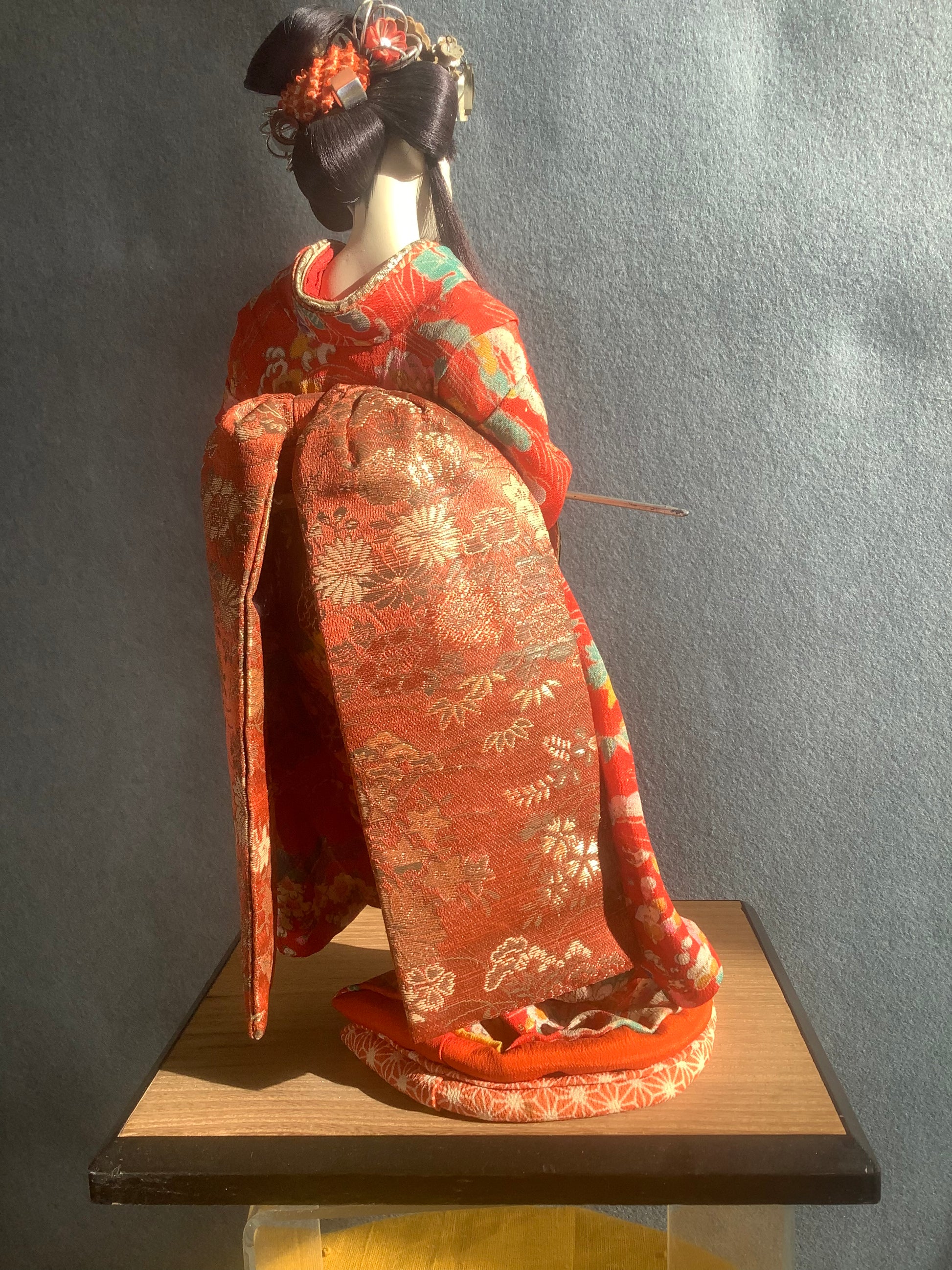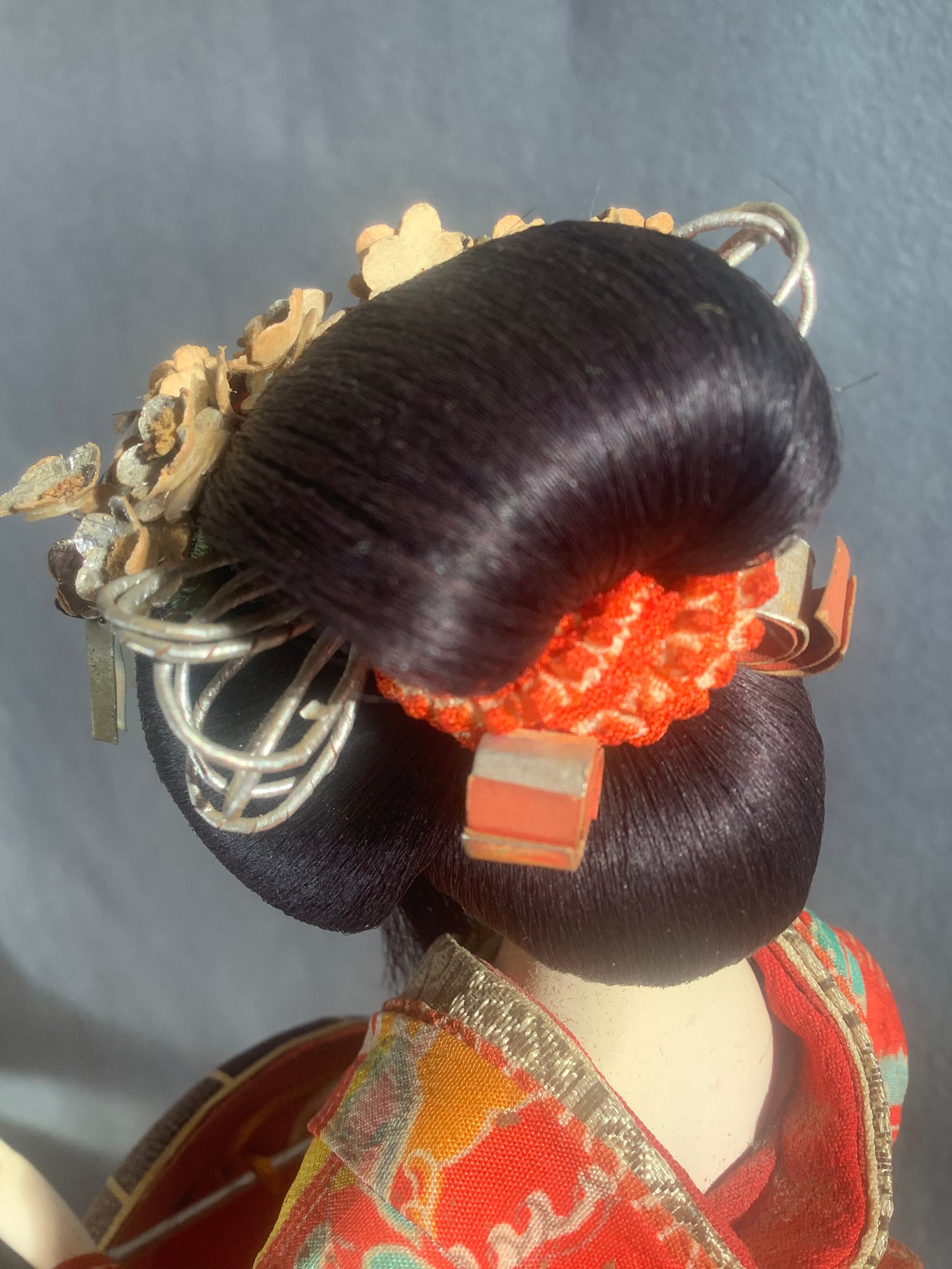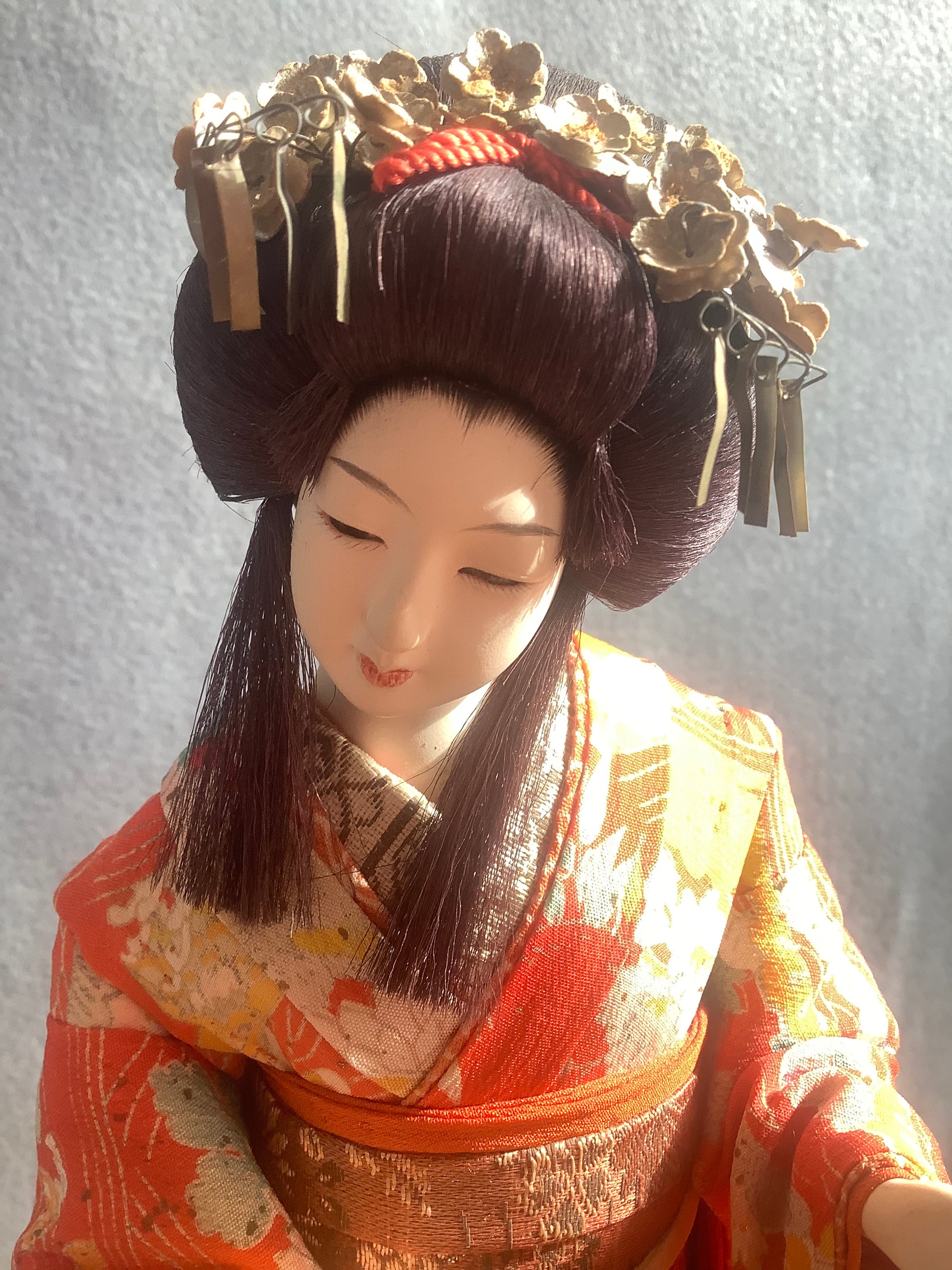 Hime, princess character doll. Silk kimono, flower kanzashi. Face and limbs are not gofun. Condition is excellent.
