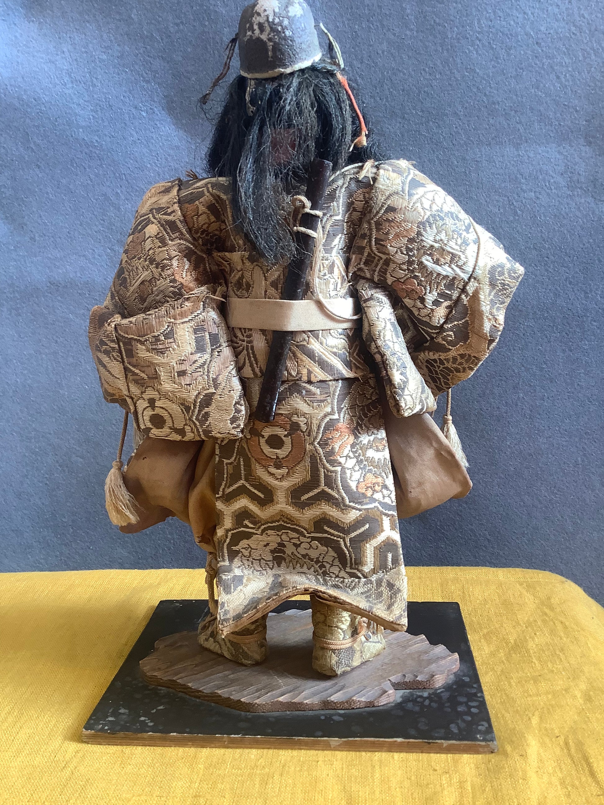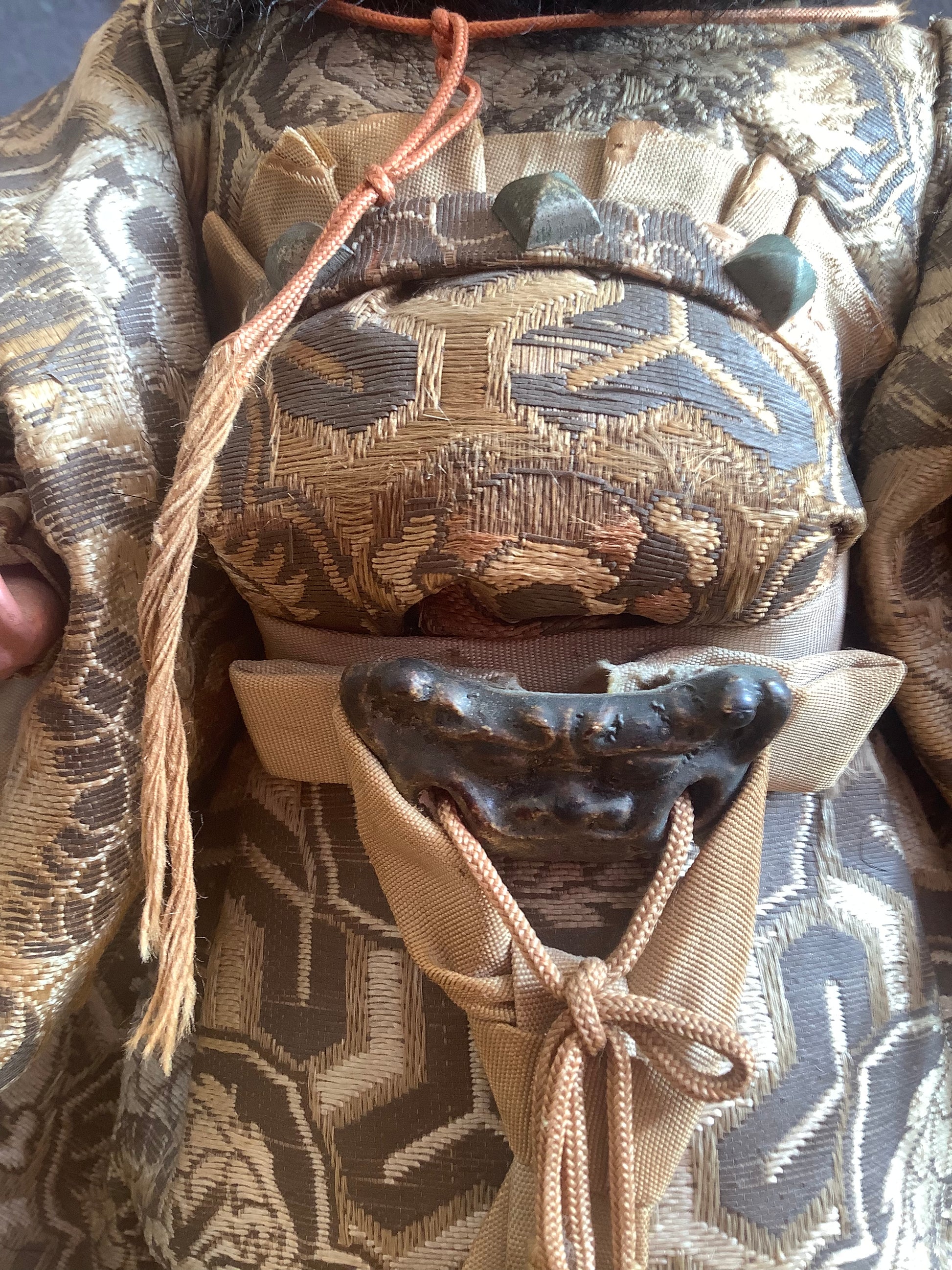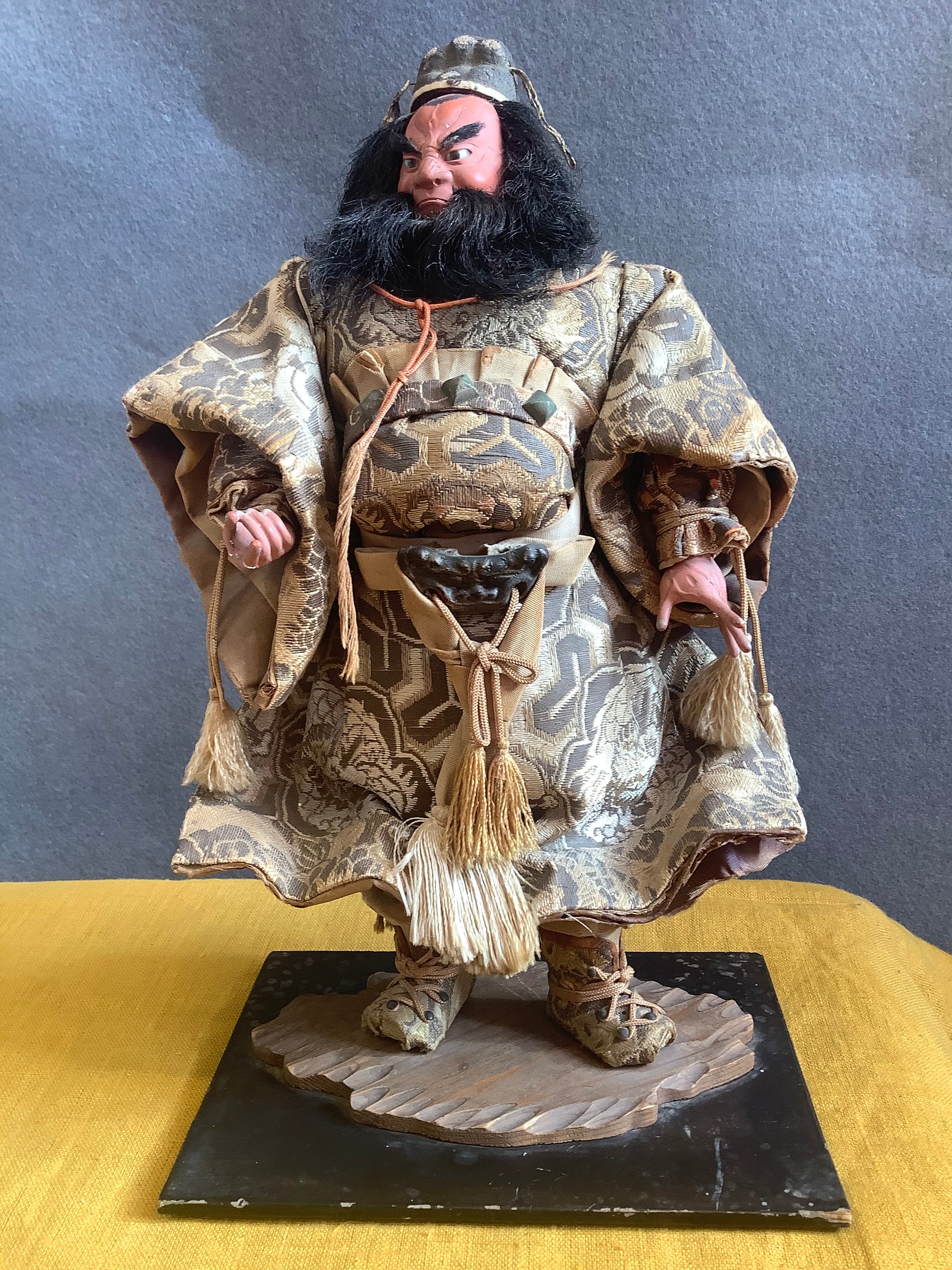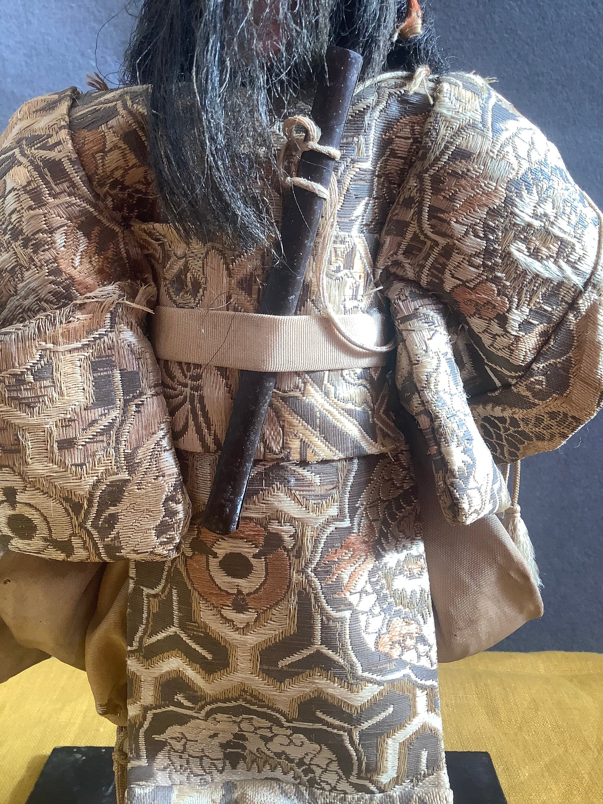 Meiji / late Edo period display doll for the boy’s festival. Gofun head and hands. Silk brocade costume with metal fittings. Glass eyes. Wooden and lacquered base.Overall fading of silks commensurate with age.