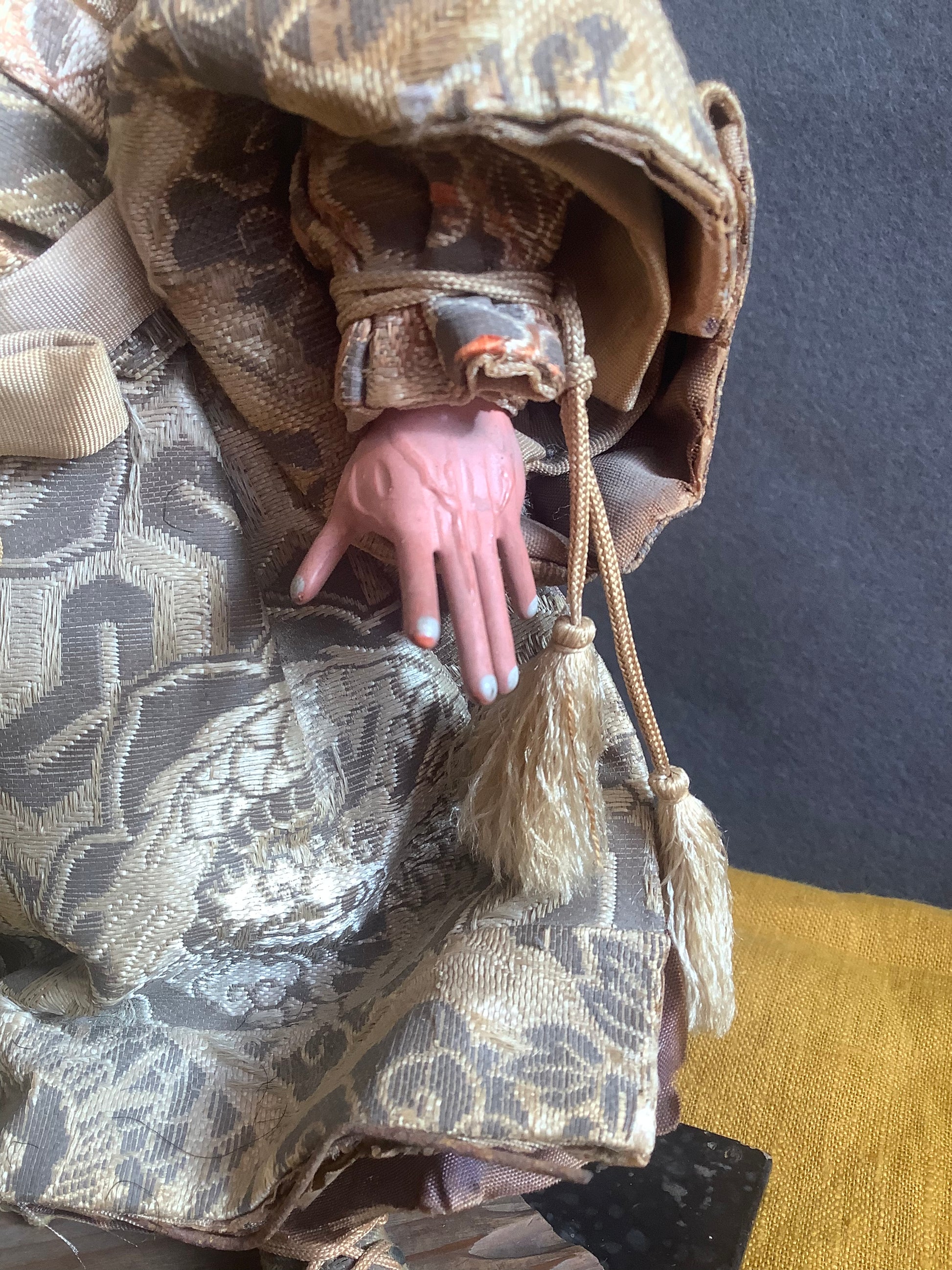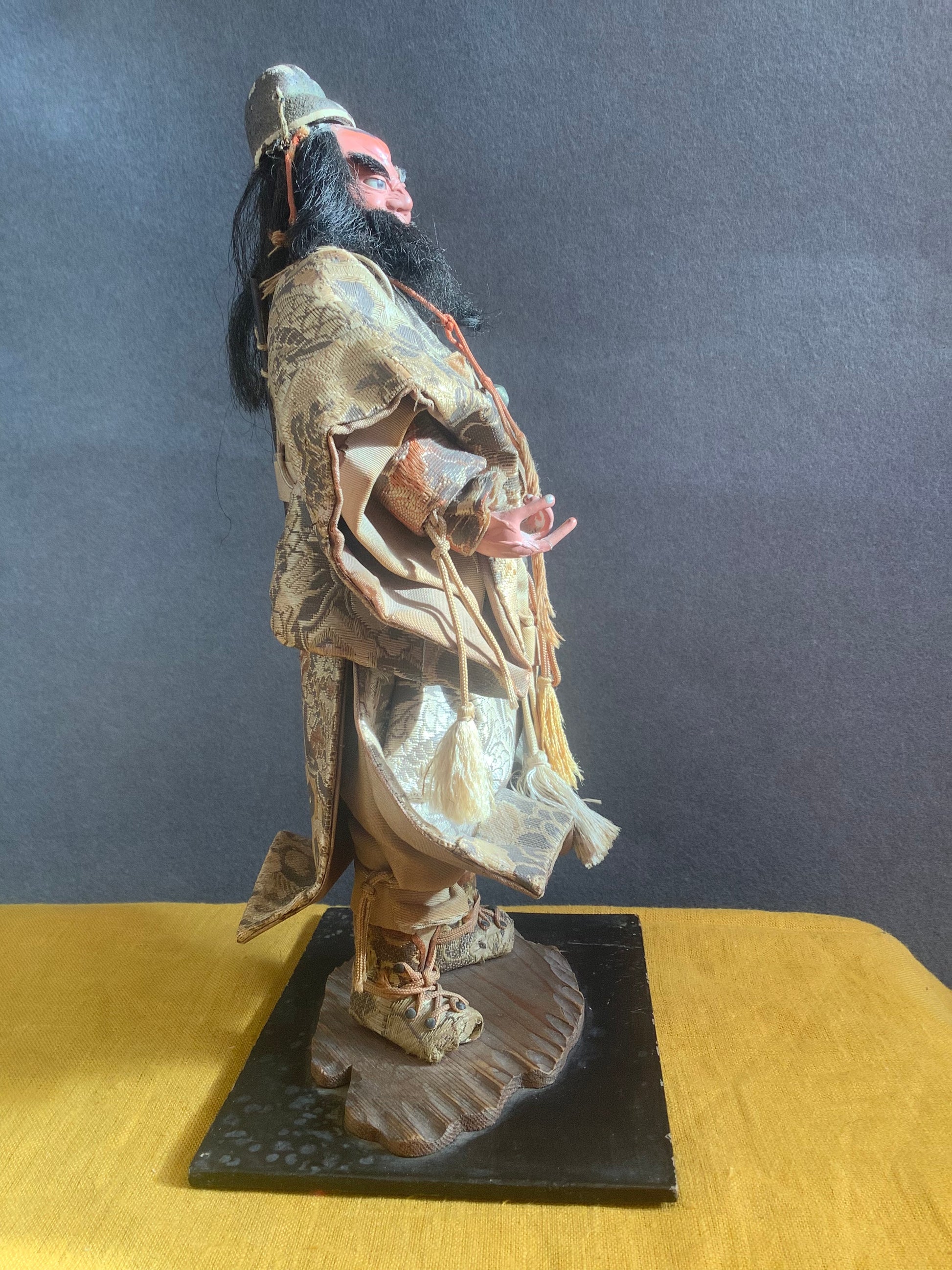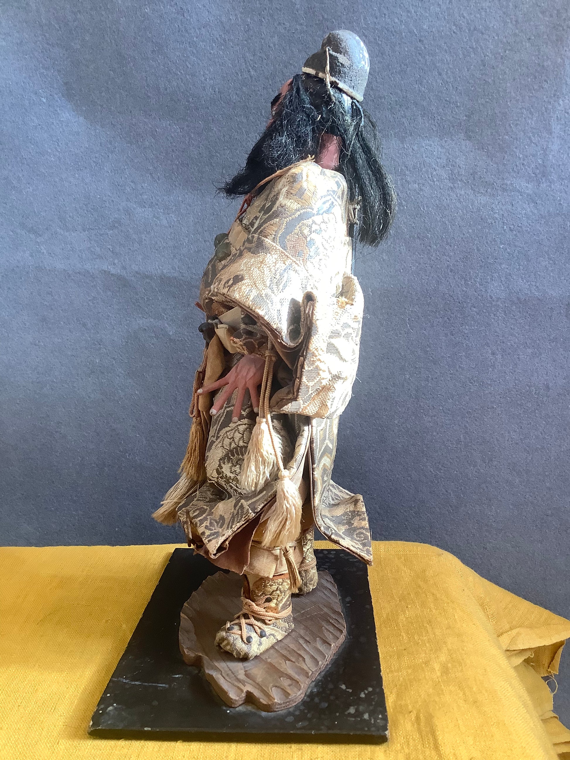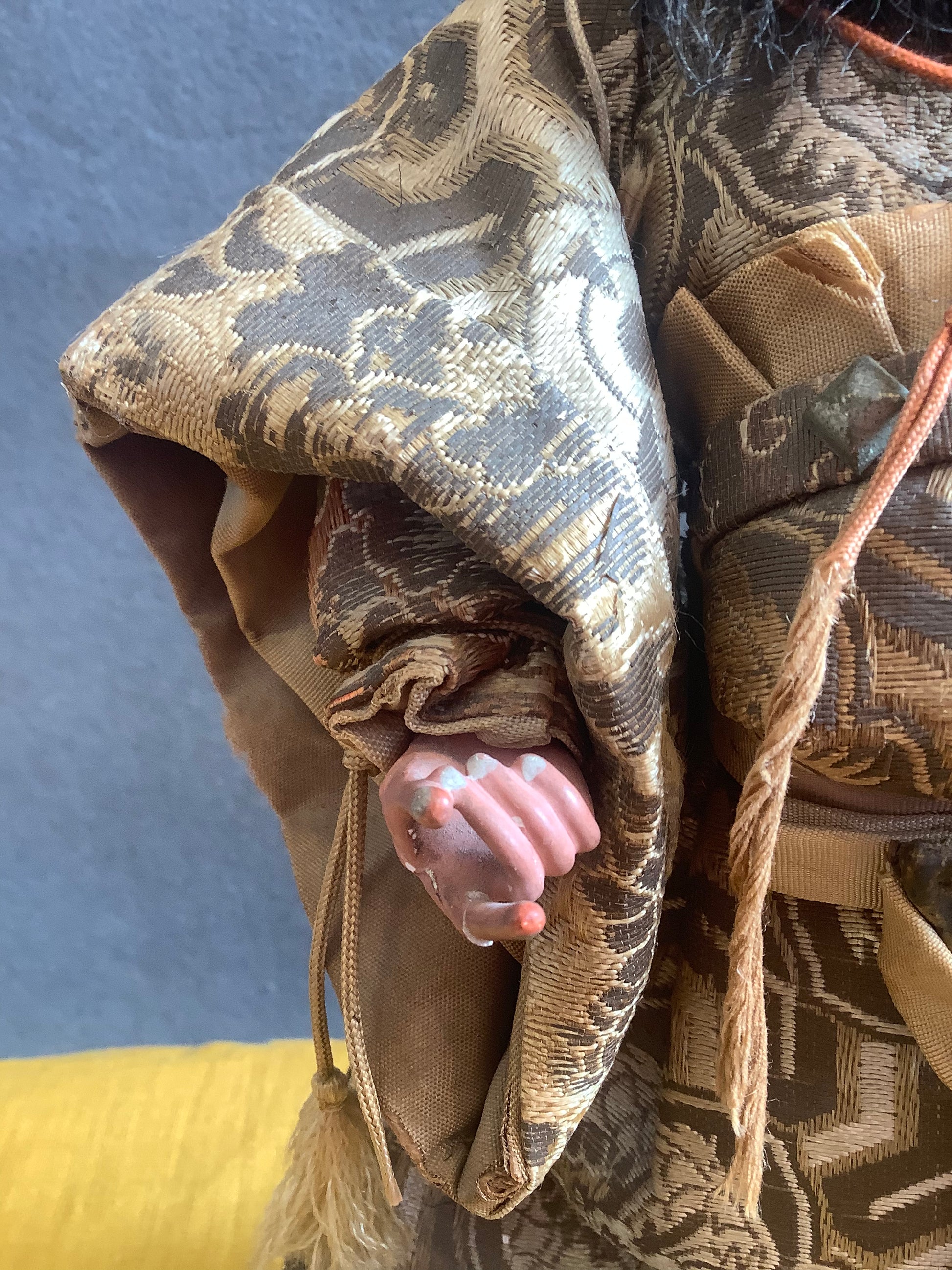 Meiji / late Edo period display doll for the boy’s festival. Gofun head and hands. Silk brocade costume with metal fittings. Glass eyes. Wooden and lacquered base.Overall fading of silks commensurate with age.