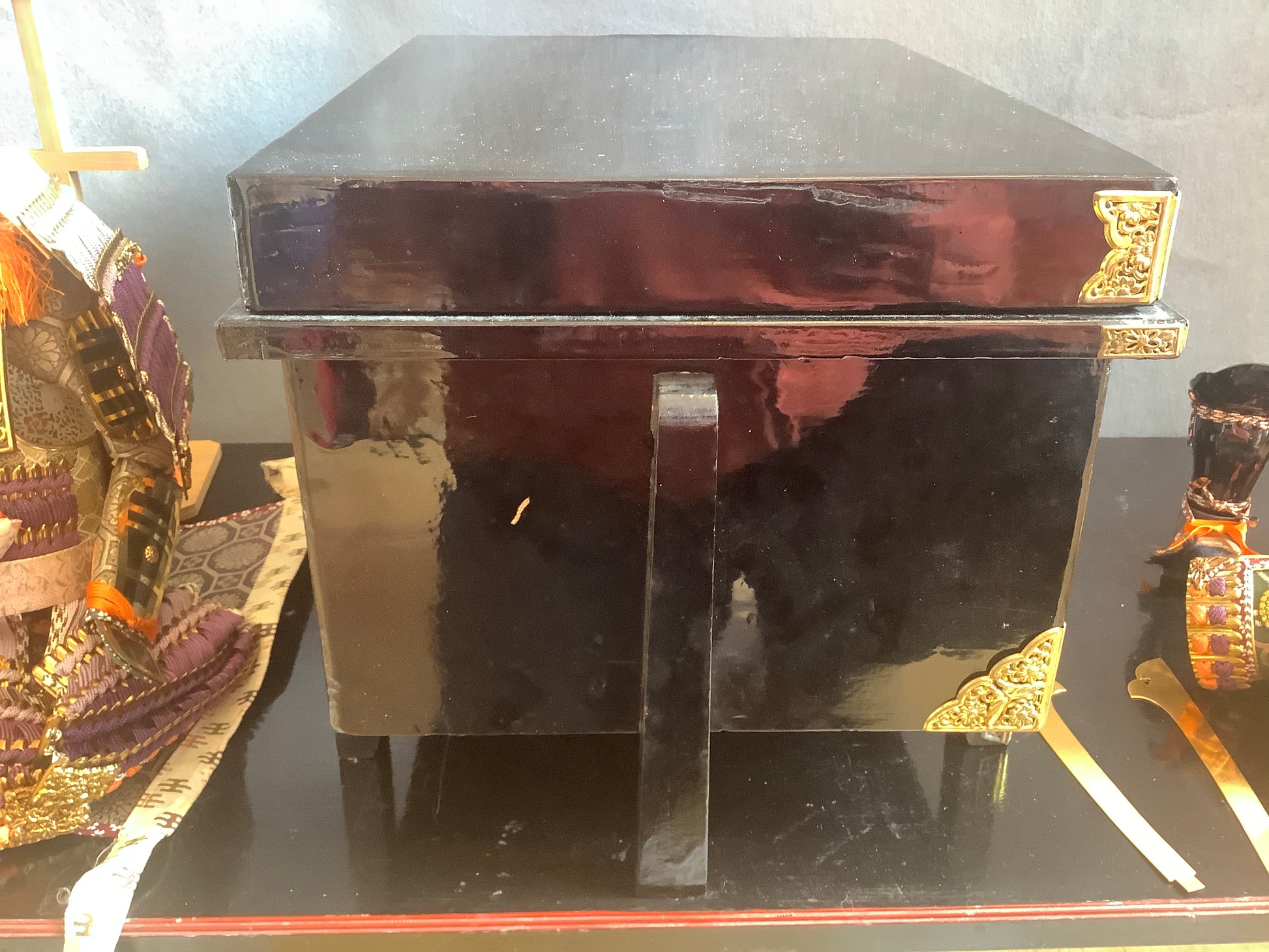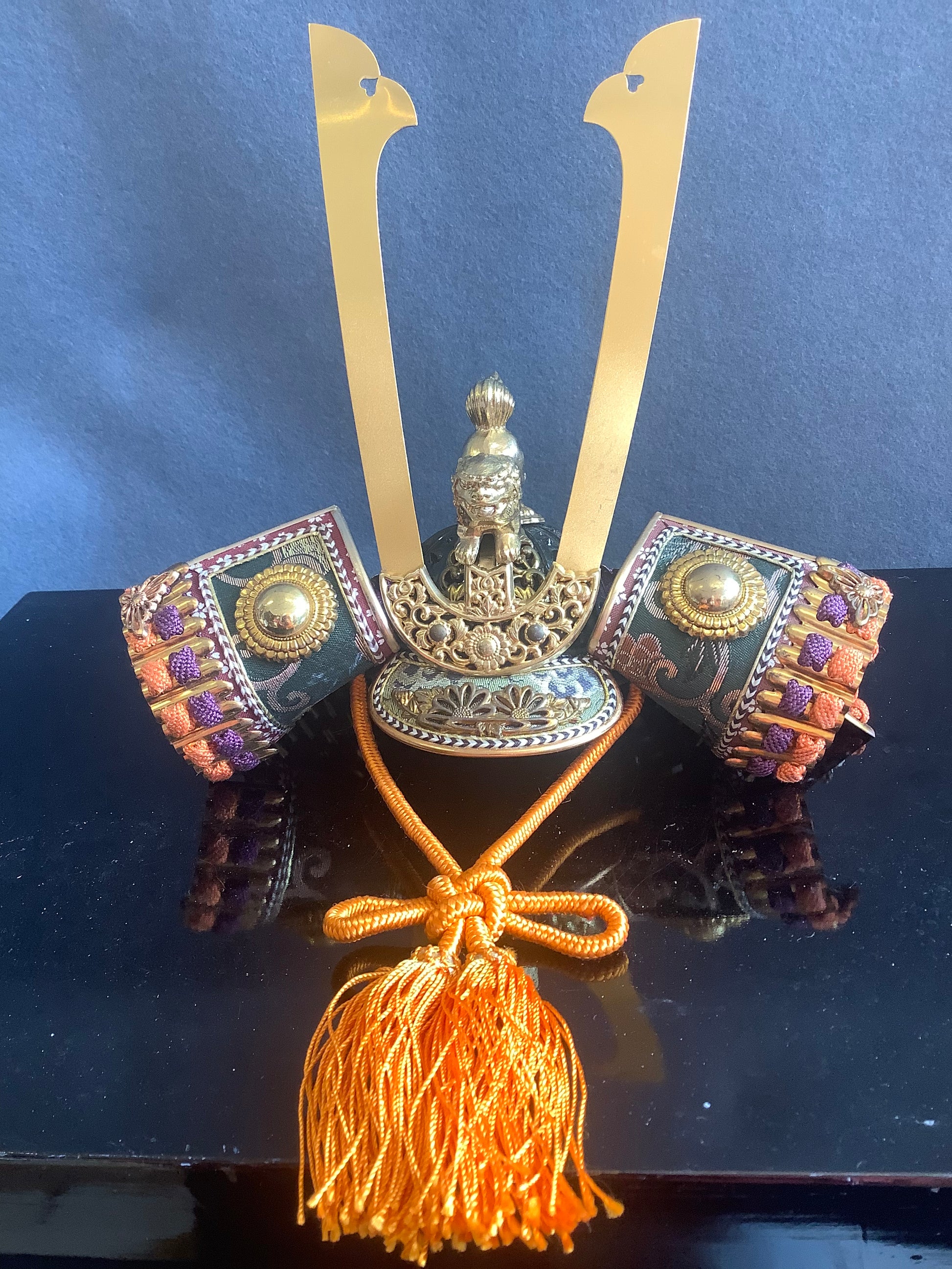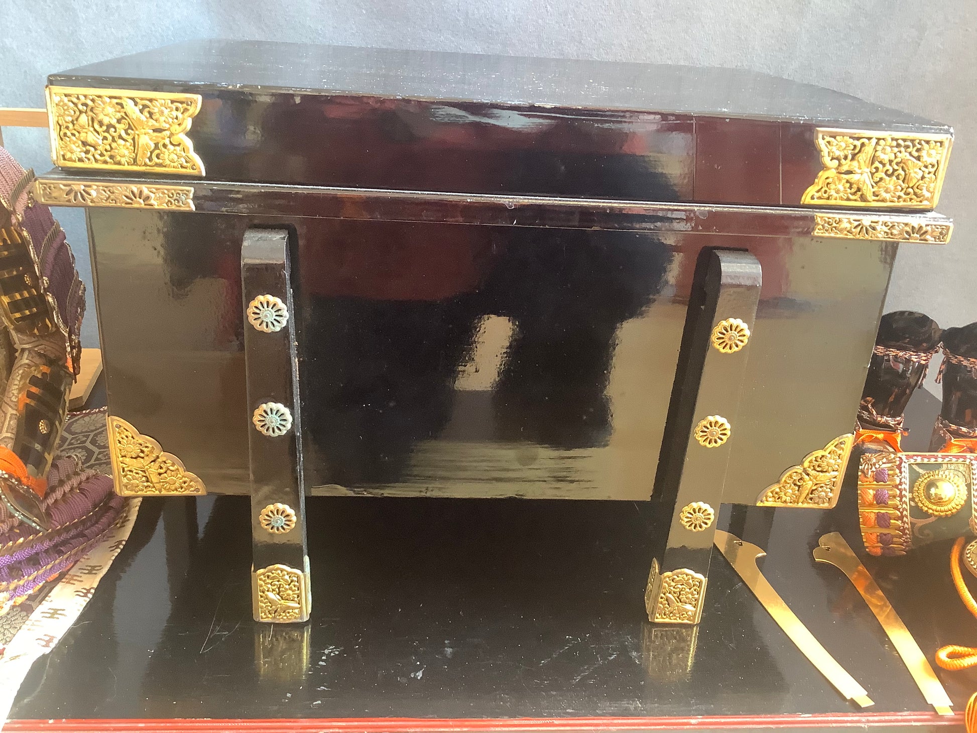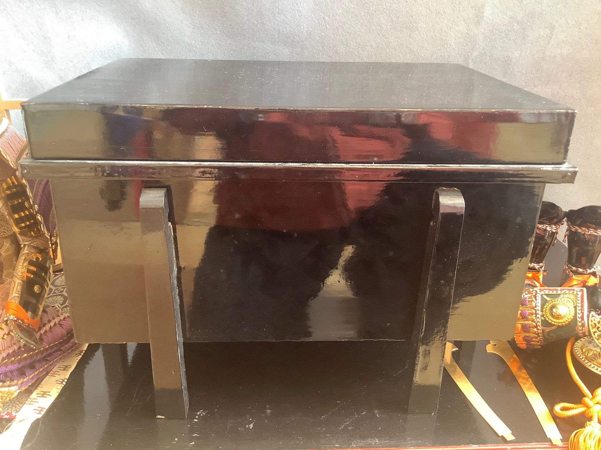 Vintage set of samurai armour for display. Used for display at the boy’s festival 5th may. Metal plates laced together with silk cords, metal fittings and silk brocade. The lacquered parts of the armour and face guard are plastic. It has it’s original lacquered wooden box, used for display, and storage. There is also a wooden stand that the armour is displayed on. Please note the lacquered table that the box is sat on is not part of it, and is not included.