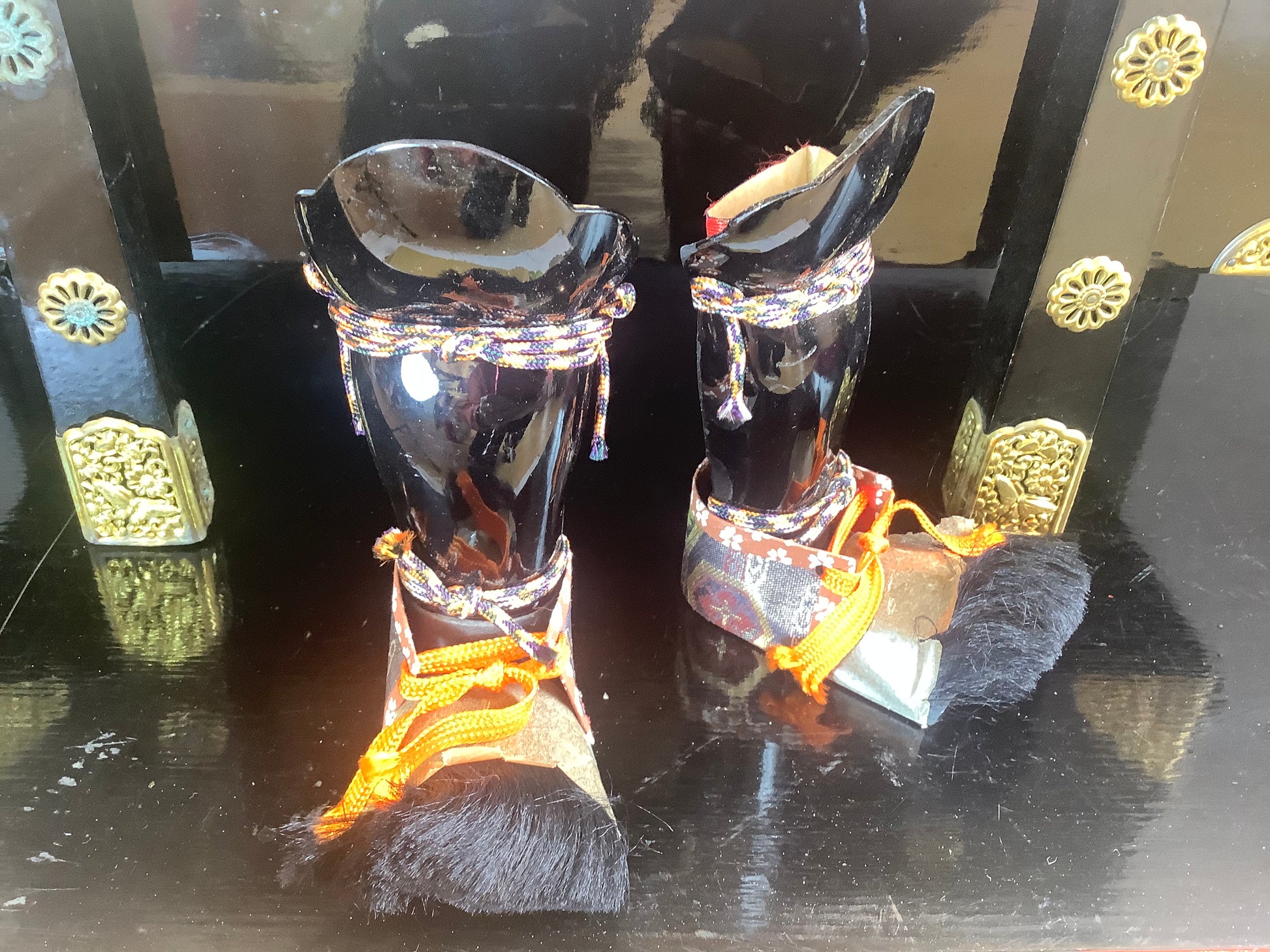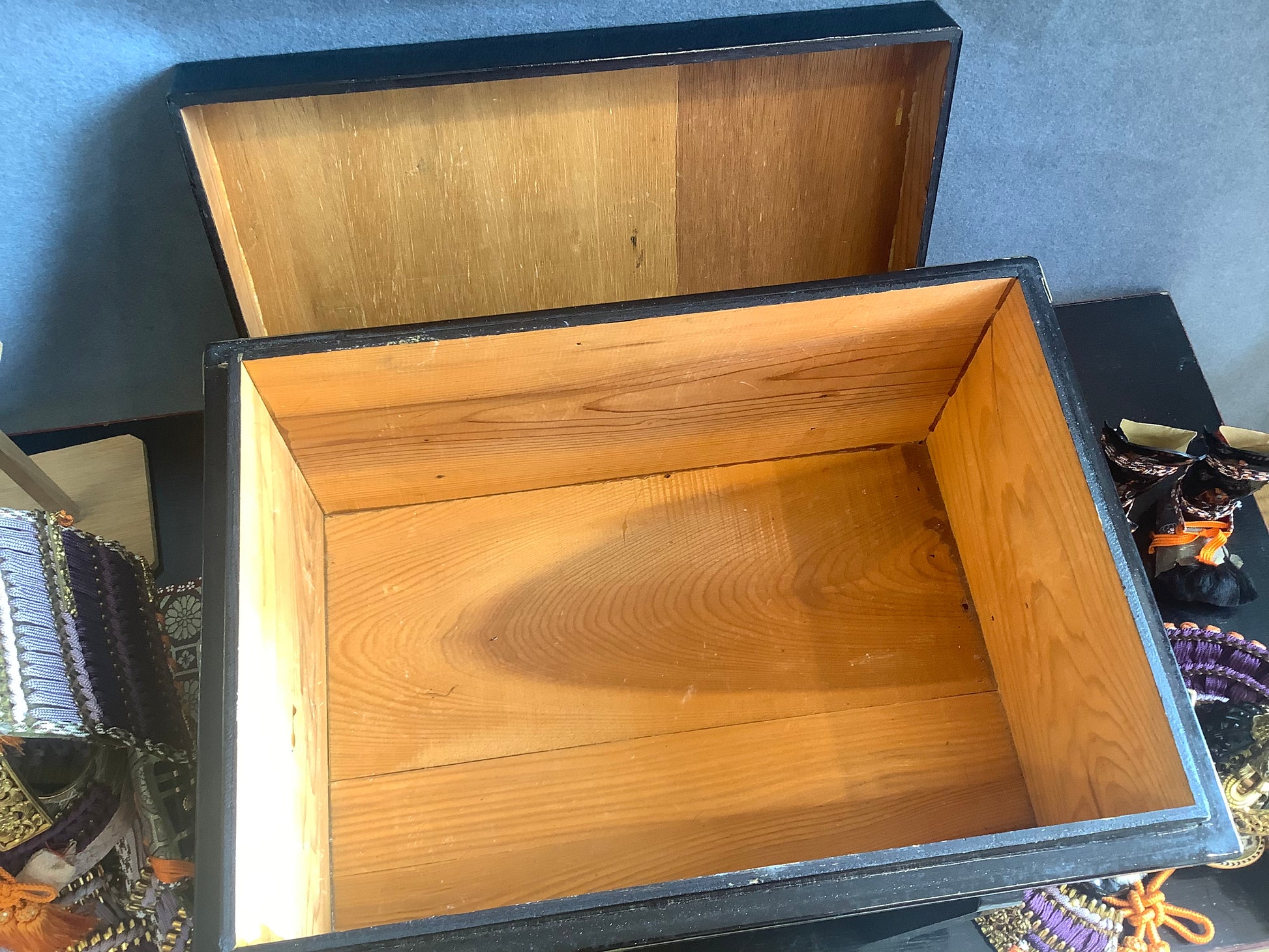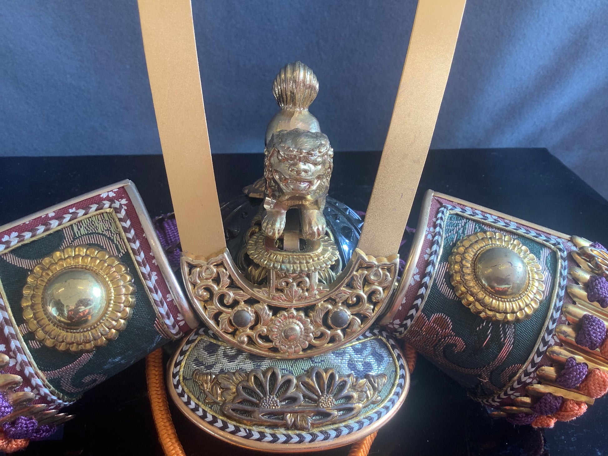 Vintage set of samurai armour for display. Used for display at the boy’s festival 5th may. Metal plates laced together with silk cords, metal fittings and silk brocade. The lacquered parts of the armour and face guard are plastic. It has it’s original lacquered wooden box, used for display, and storage. There is also a wooden stand that the armour is displayed on. Please note the lacquered table that the box is sat on is not part of it, and is not included.