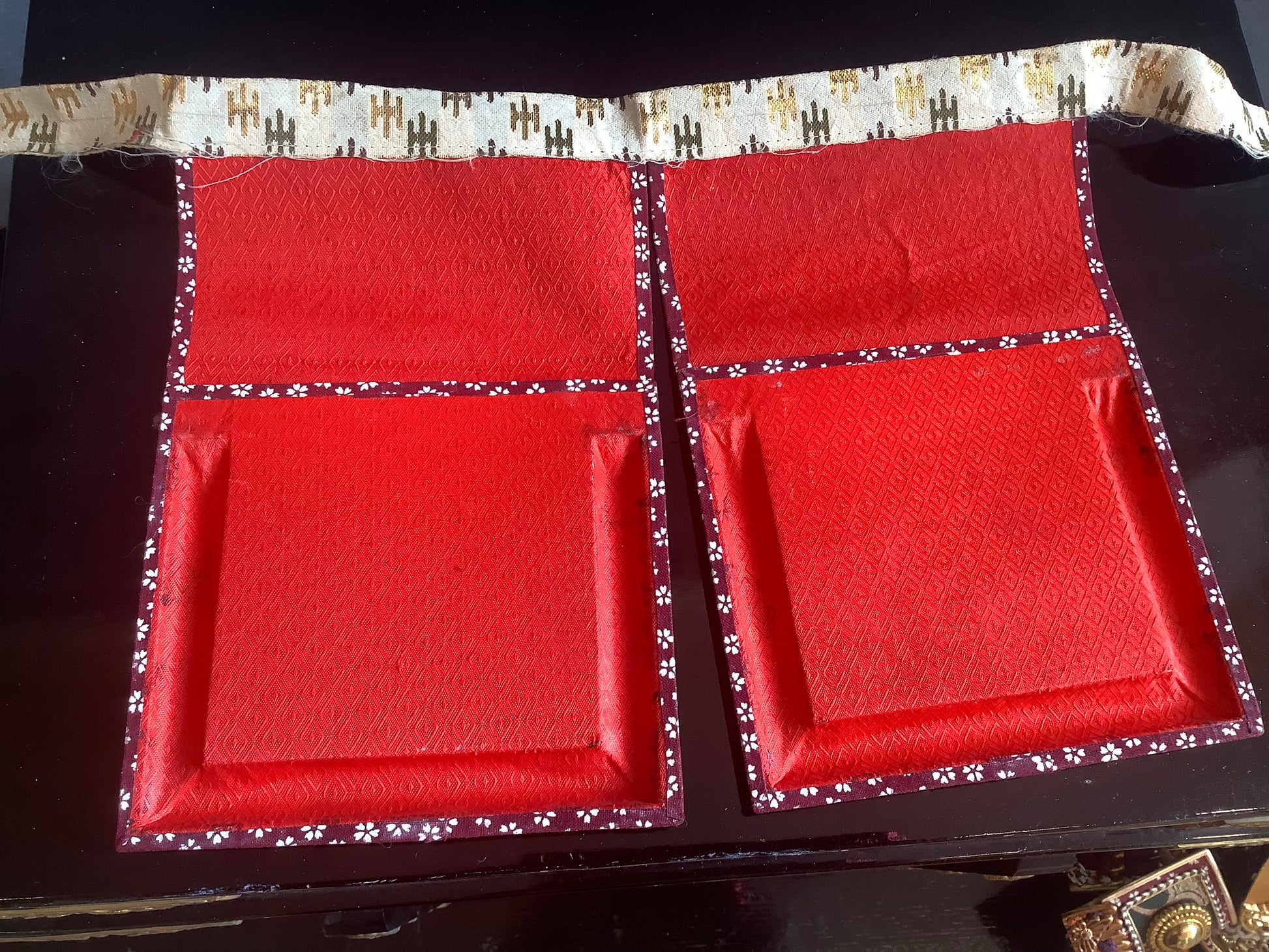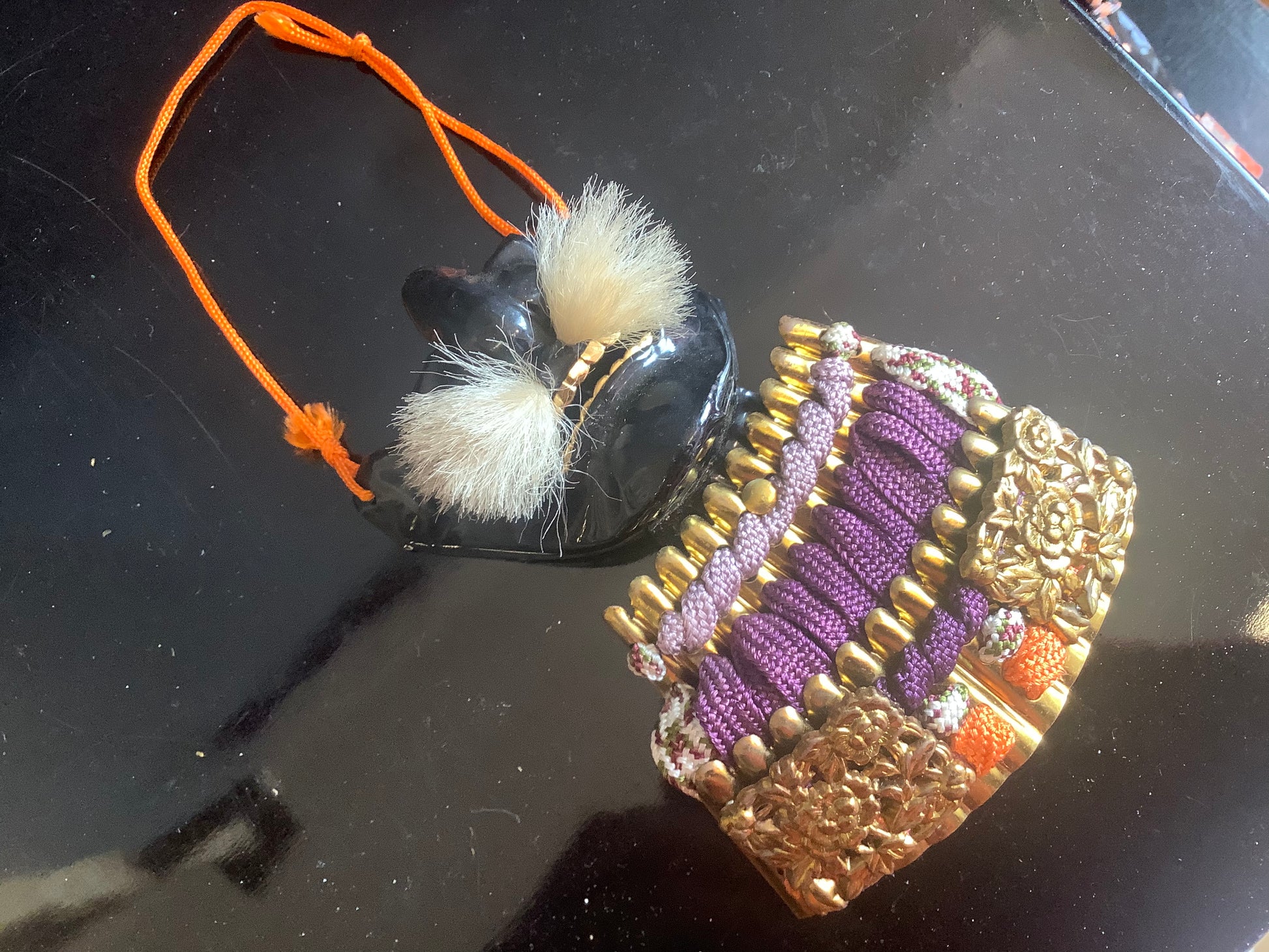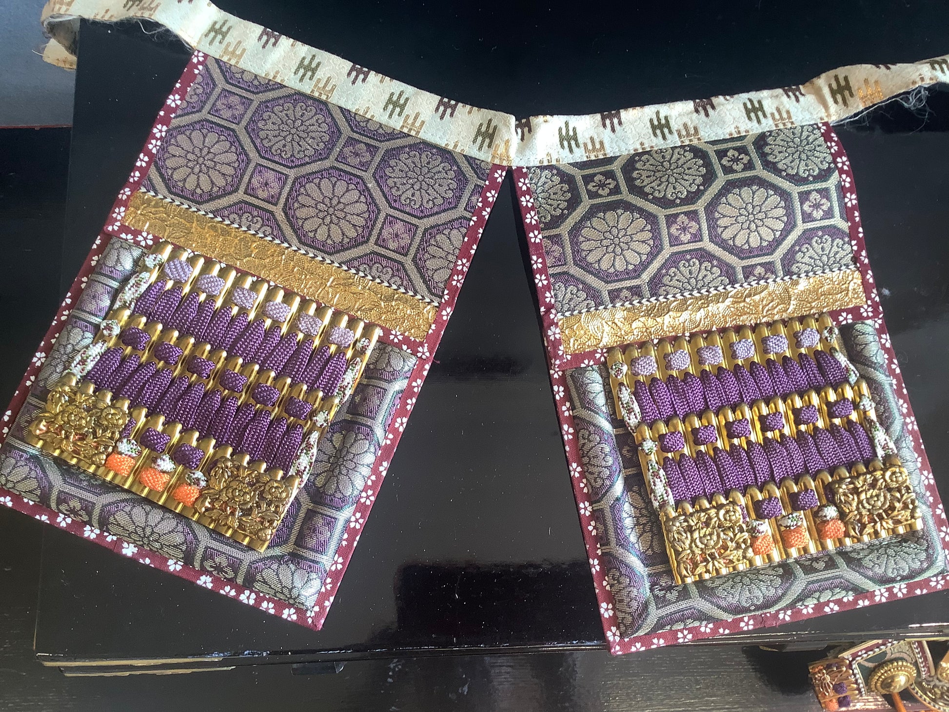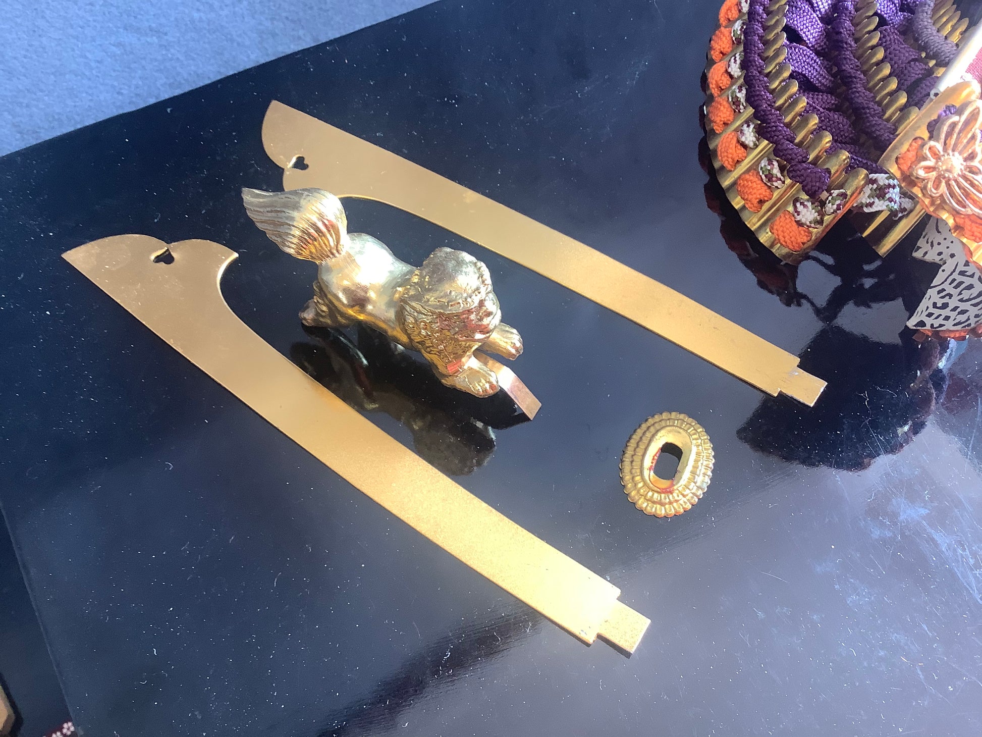 Vintage set of samurai armour for display. Used for display at the boy’s festival 5th may. Metal plates laced together with silk cords, metal fittings and silk brocade. The lacquered parts of the armour and face guard are plastic. It has it’s original lacquered wooden box, used for display, and storage. There is also a wooden stand that the armour is displayed on. Please note the lacquered table that the box is sat on is not part of it, and is not included.