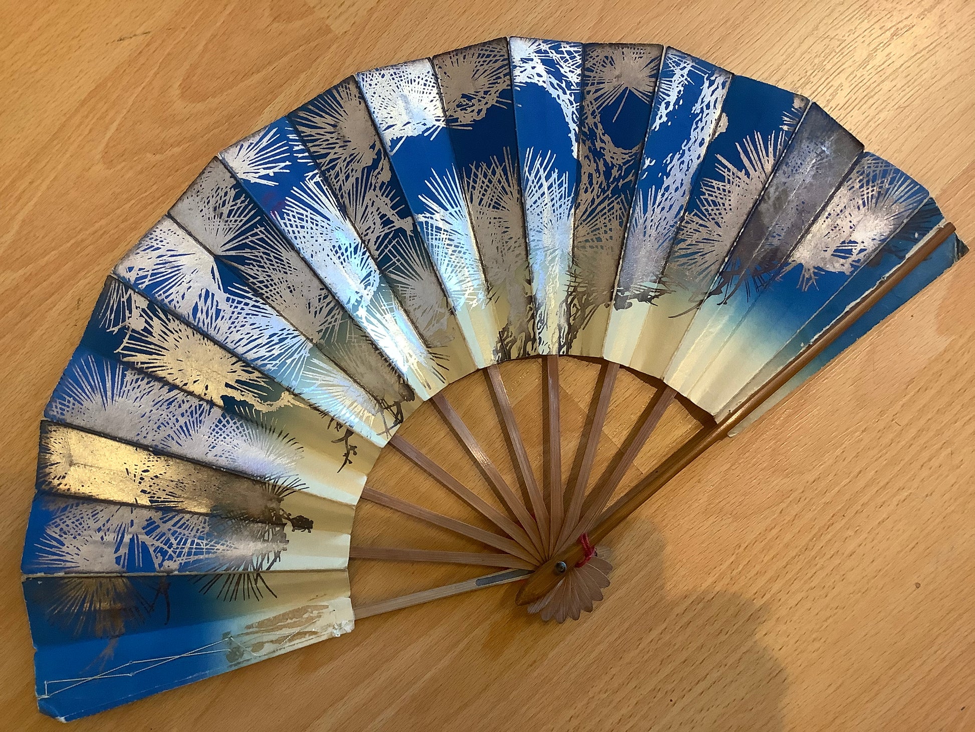Fan for dance, blue with silver pines. Worn and tarnished, but still good for display.