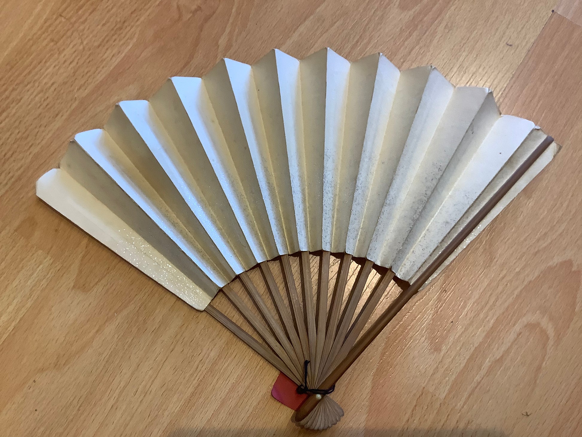 Simple fan with calligraphy and mon. Rather worn, but still good for display.