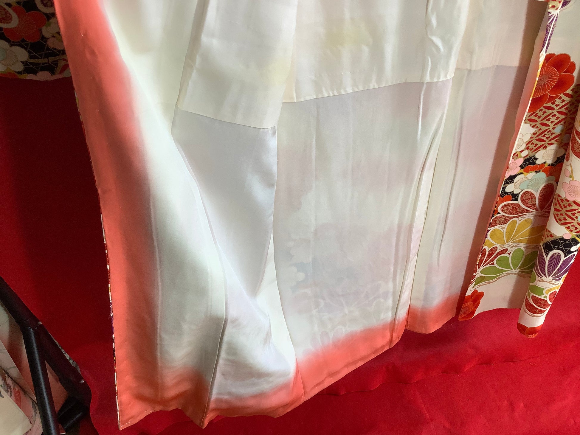 Colourful furisode of umi blossoms and pine branches. Silk furisode with silk ombré lining.This piece has previously had tucks in the shoulders. There is a pale mark on the right back, by the sleeve opening. Condition is excellent.
