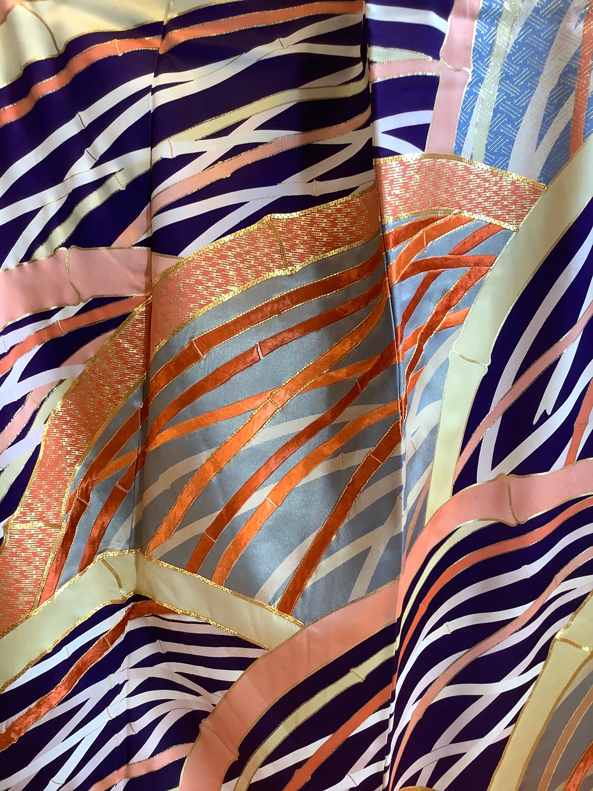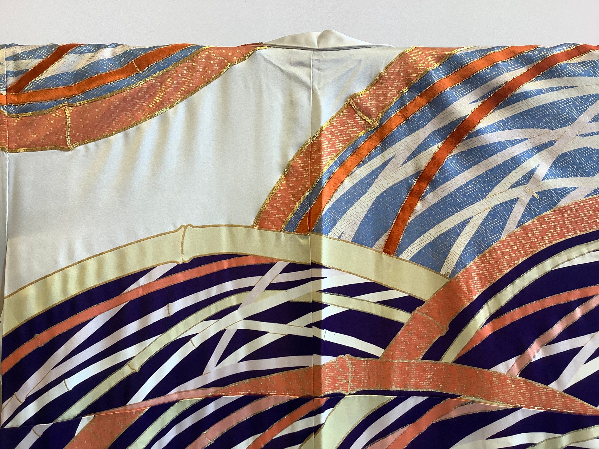 Bamboo bending in the wind to form waves. Embroidered kinkoma highlights. Silk furisode with ombré lining. Condition is excellent.