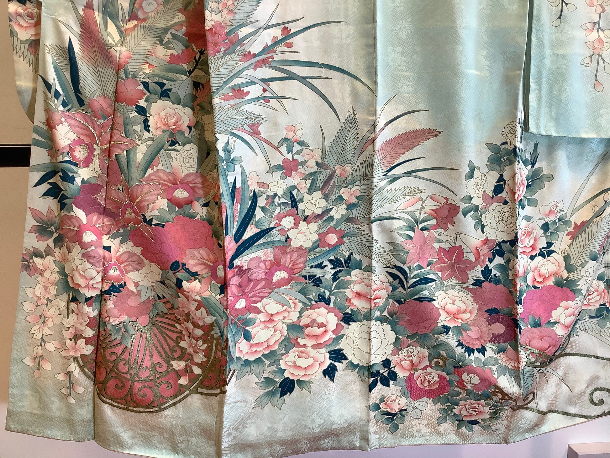 Flower cart and flower basket inshades of piks and blue against a pale blue rinzu silk background. The lining is palest sugar pink. Condition is excellent.