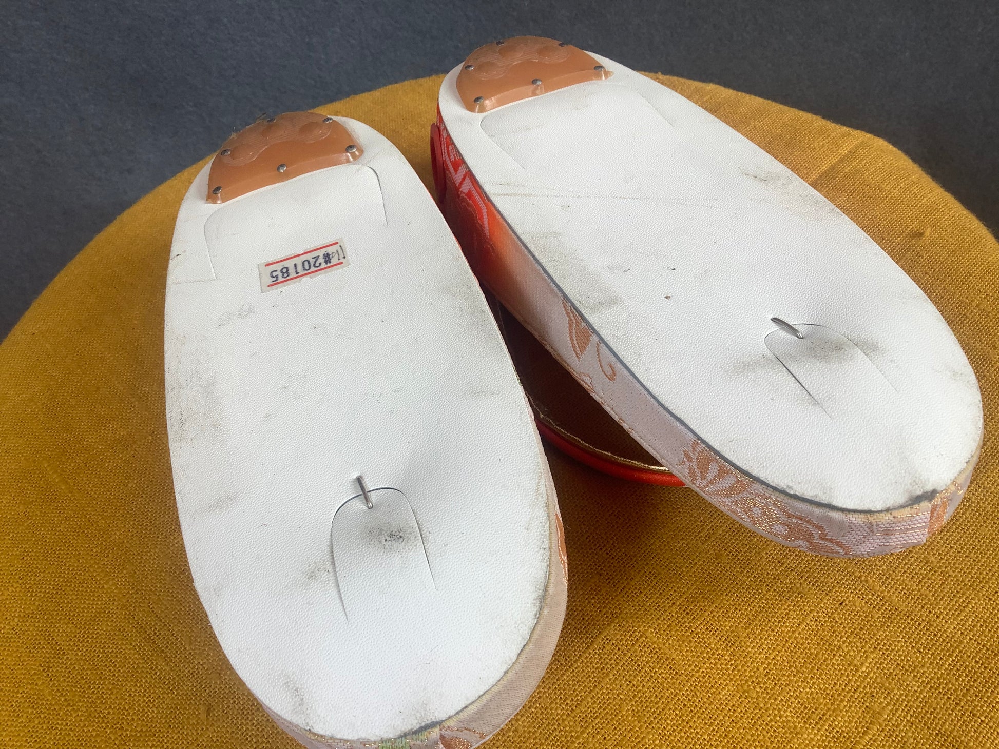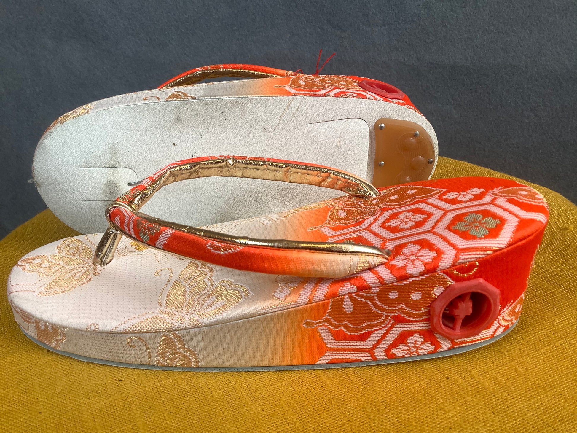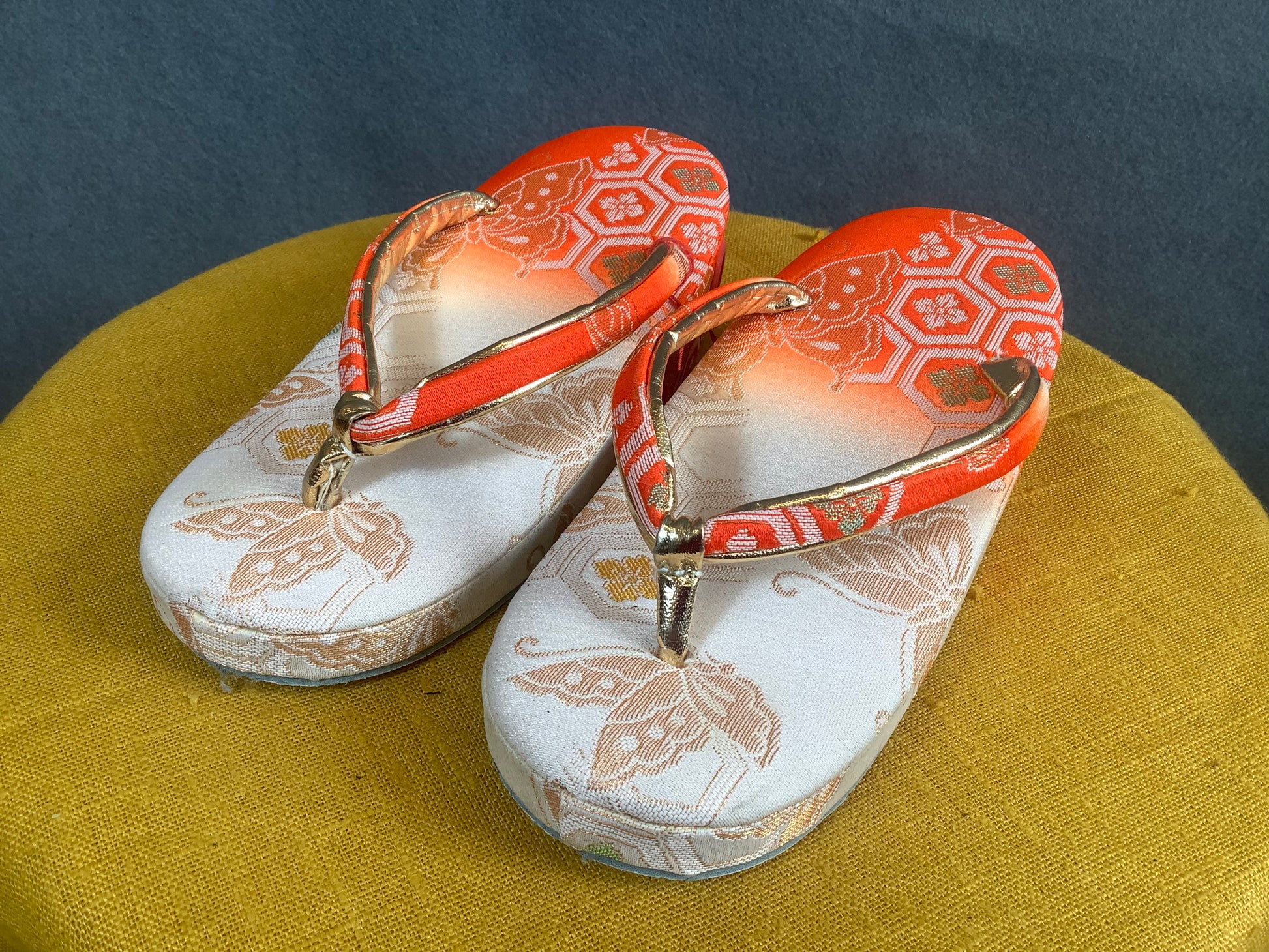 Orange and cream girls brocade zori with butterflies. There are bells embedded in the heals.