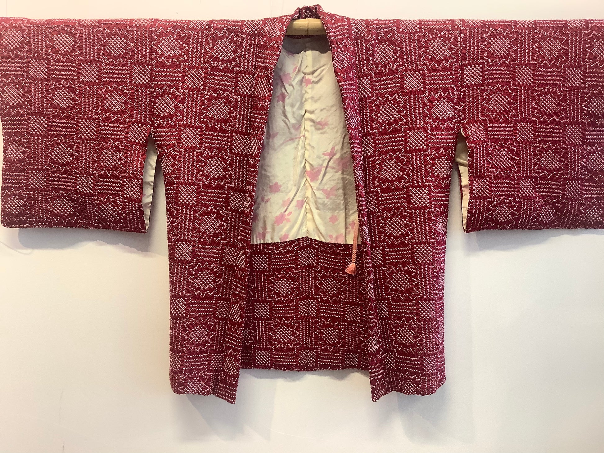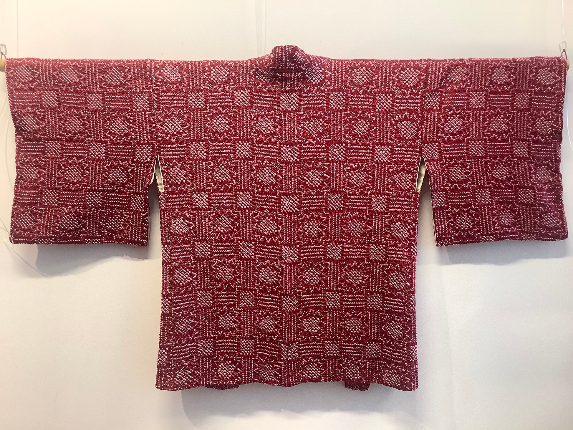 Full shibori , deep red , silk haori with geometric design.