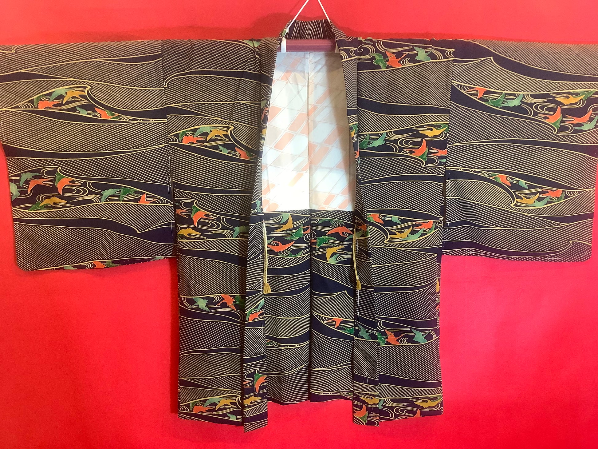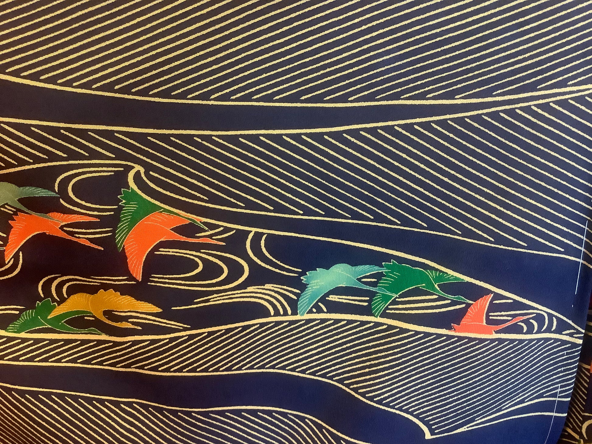 Small flocks of colourful cranes fly over deep blue water. Basting stitches are still in place . Material silk, condition is excellent.