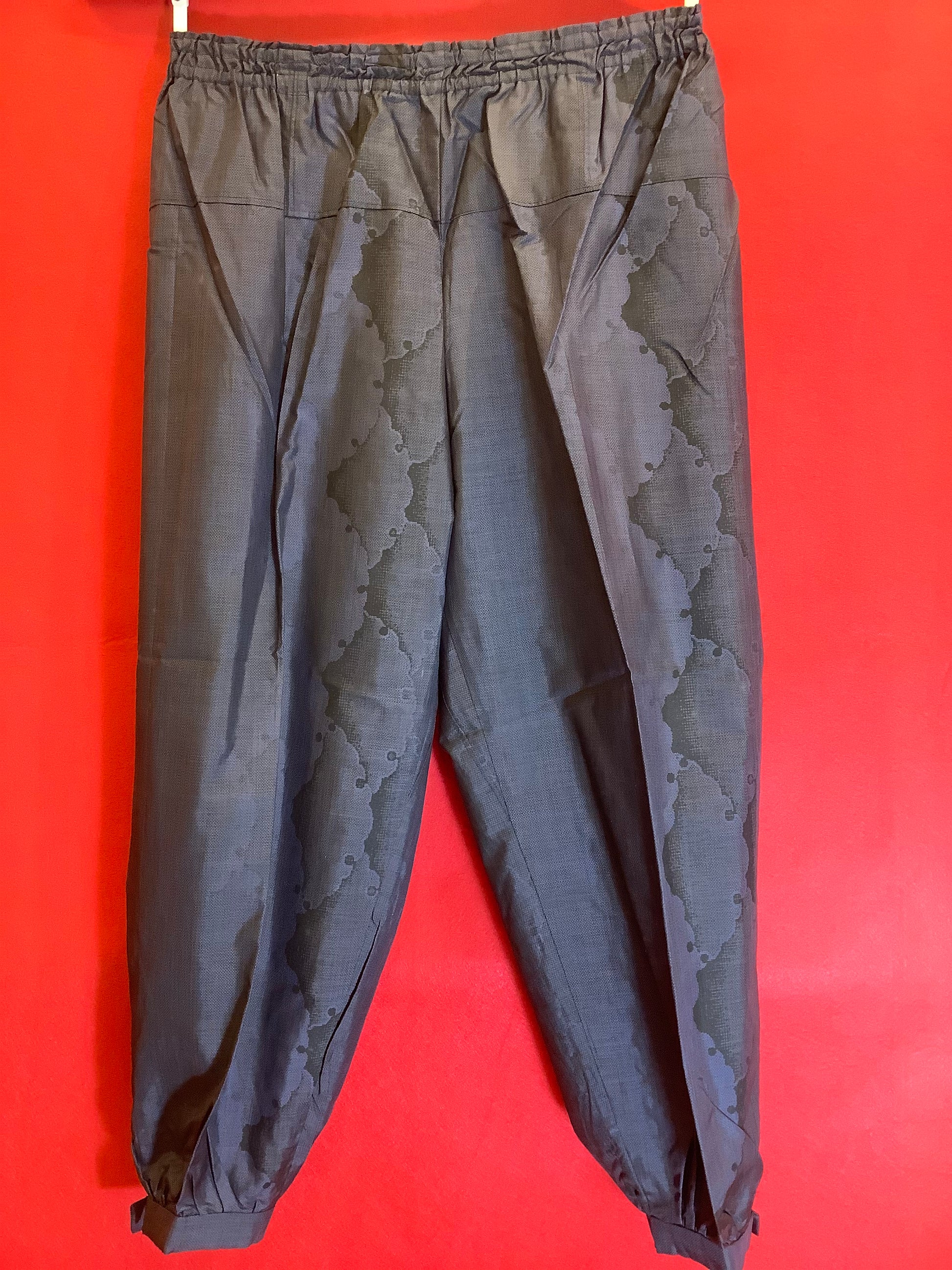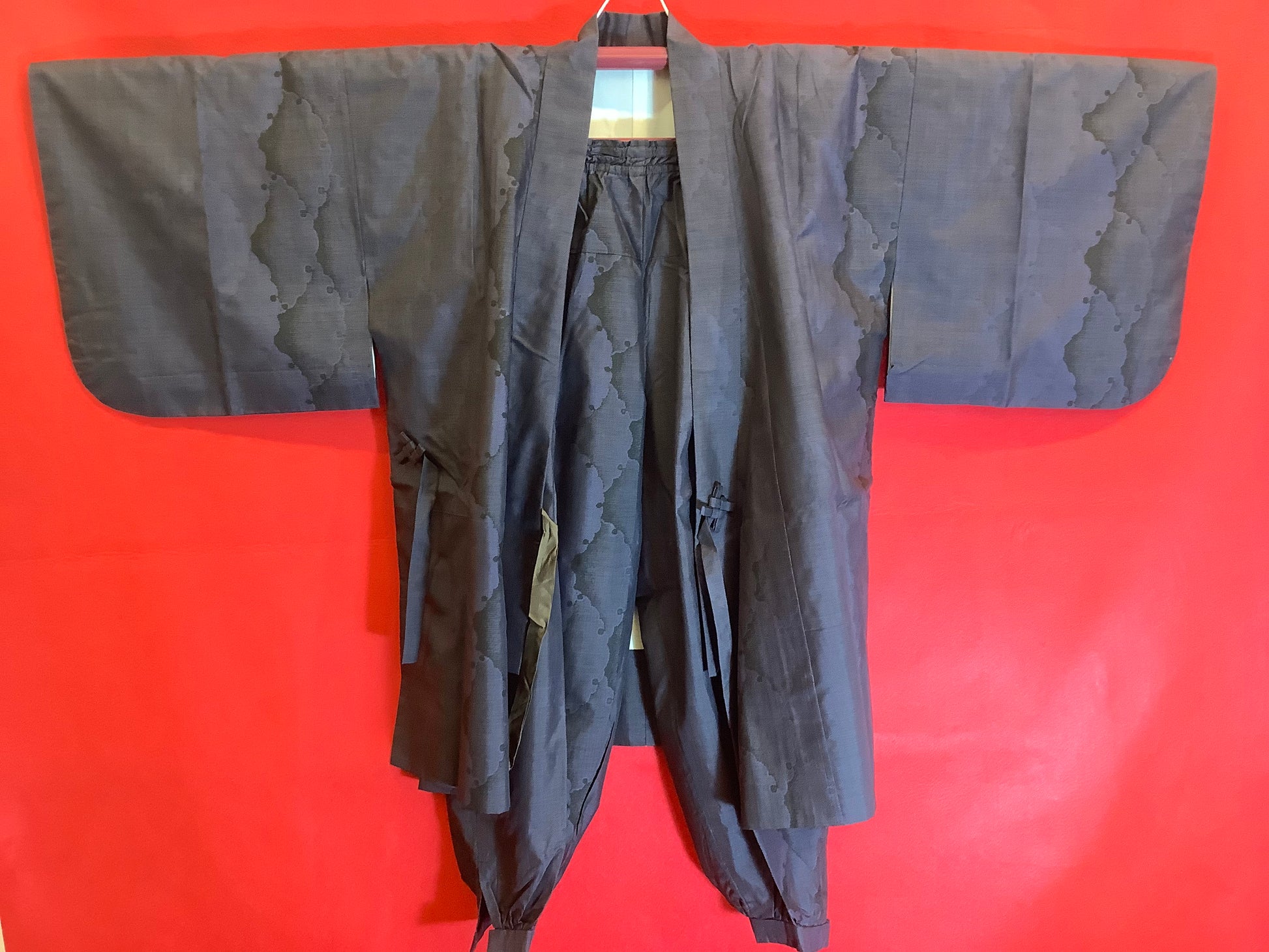 A rare set of omeshi silk samue. Side fastening jacket and trousers with elasticated waist. The colour is blue black. Condition is excellent.
