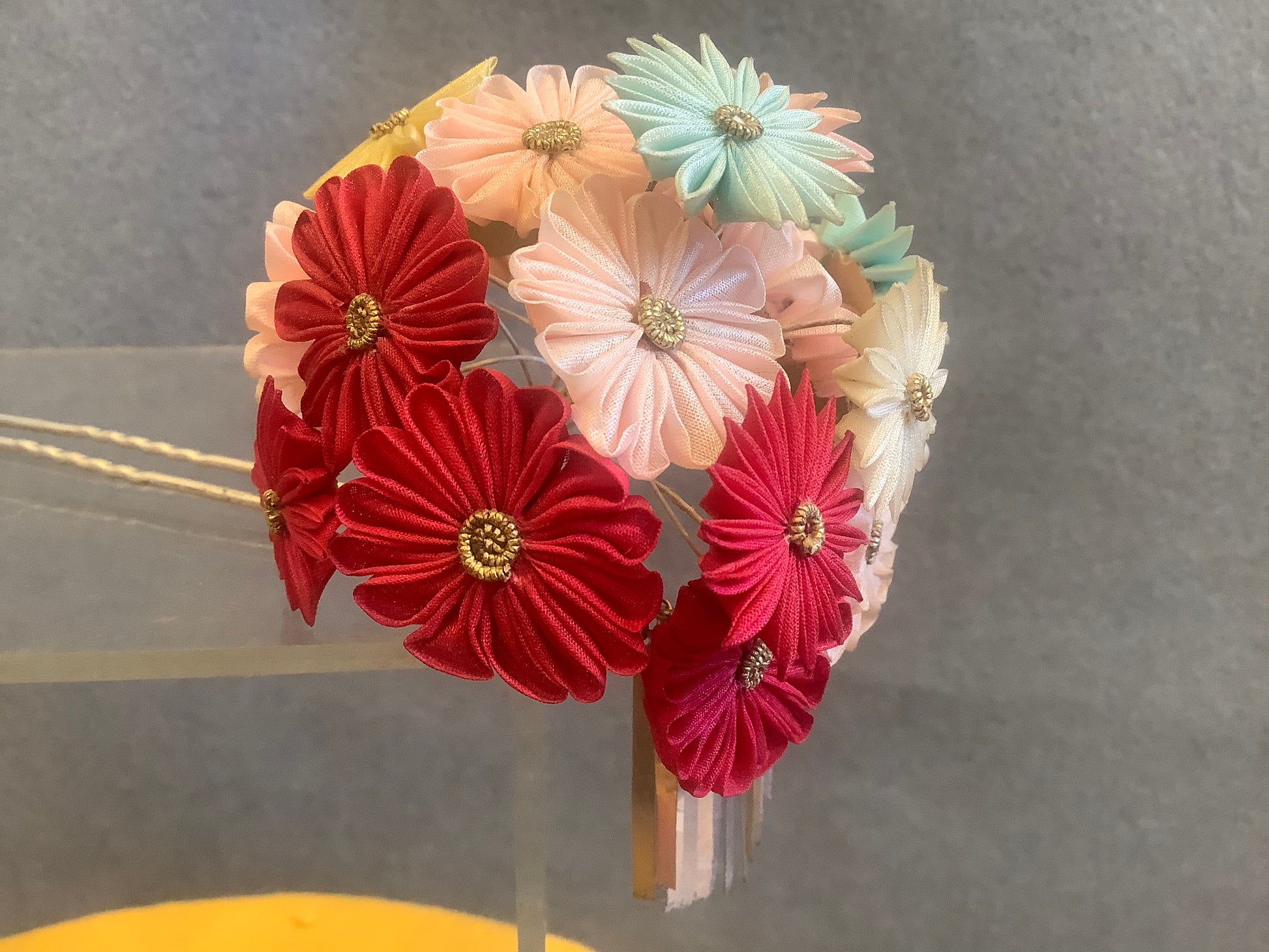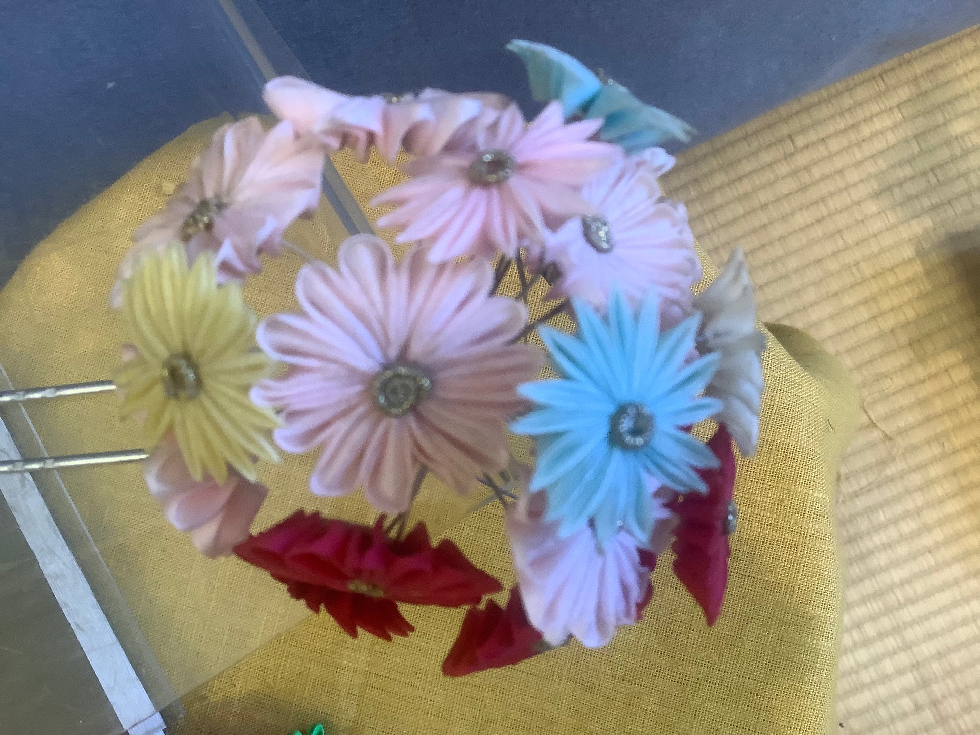 Multi coloured silk kanzashi with bira bira. Slight discolouration from age. Condition is excellent.