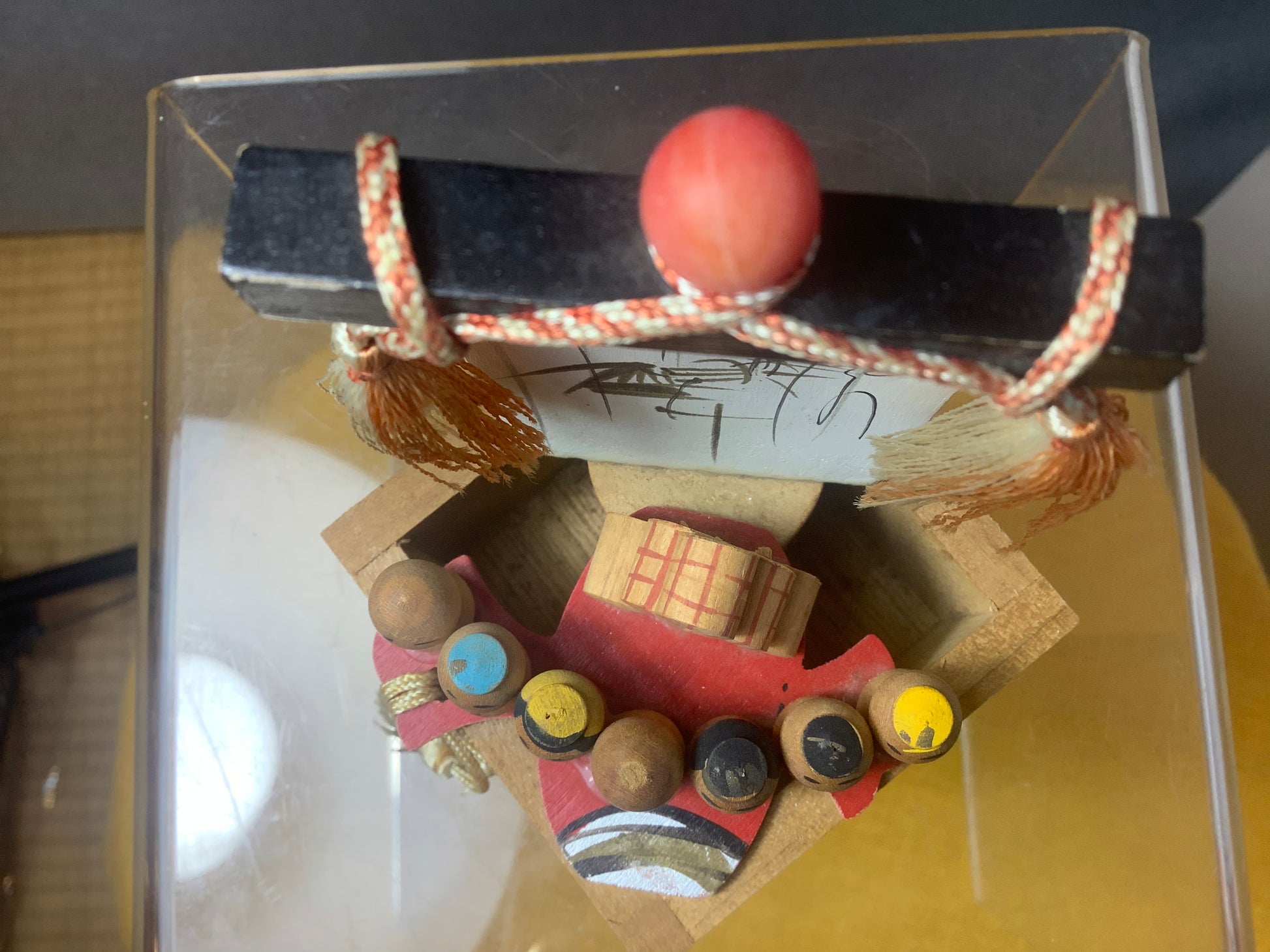 A treasure ship in the form of a wooden saki cup, with a cargo of saki barrels and the seven gods of fortune sat on the silhouette of a lucky mallet. Signed on one side.