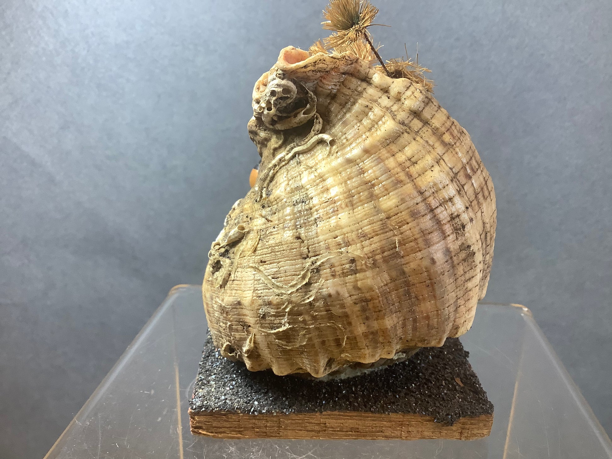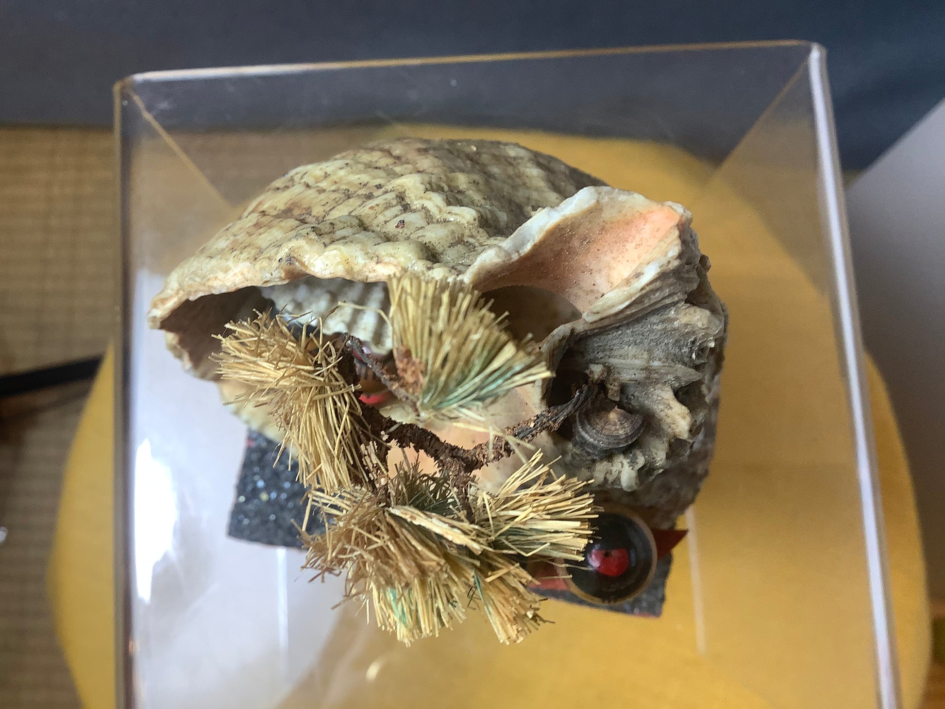 Kokeshi diorama with two pairs of kokeshi and natural sea shells.