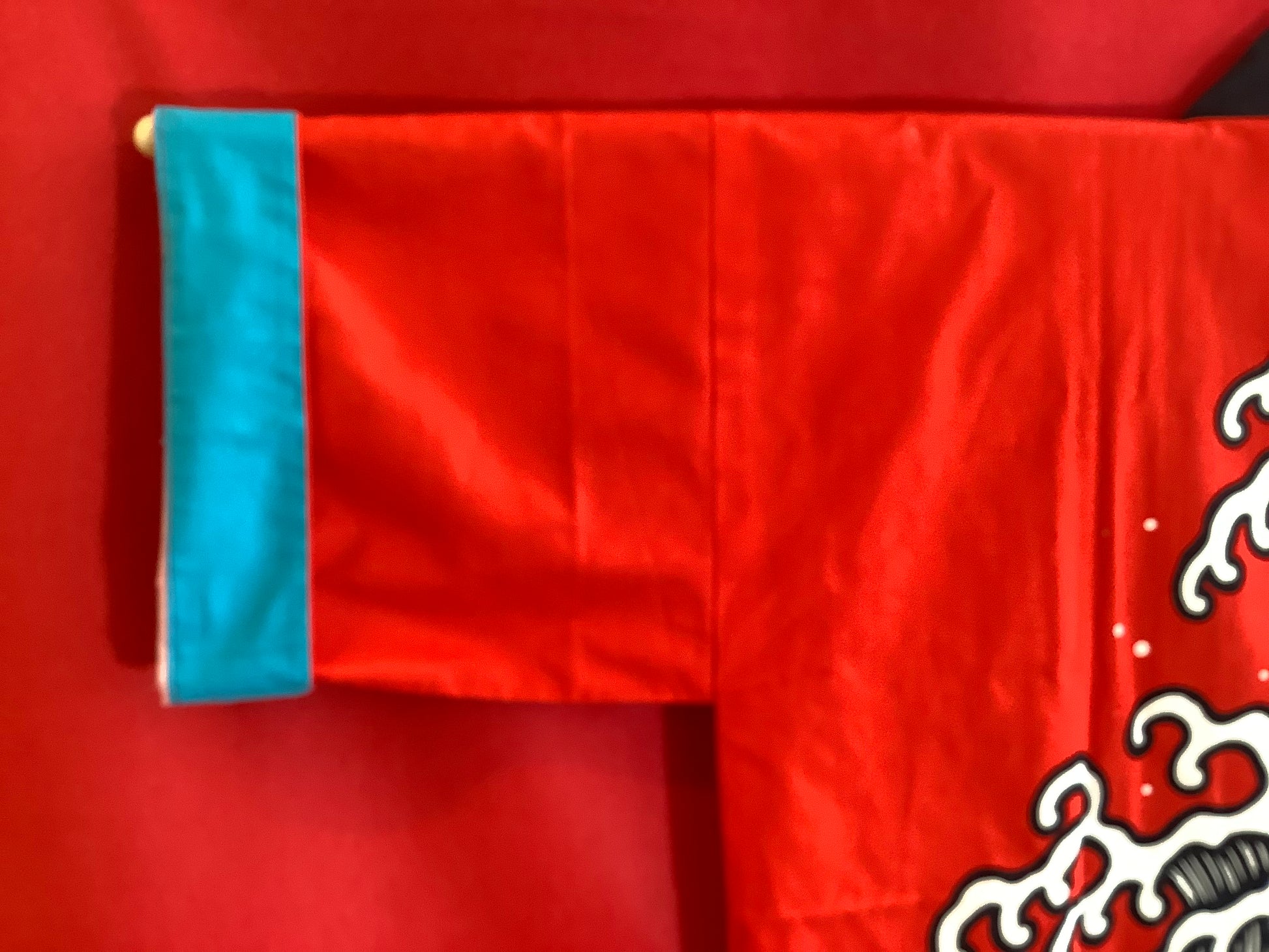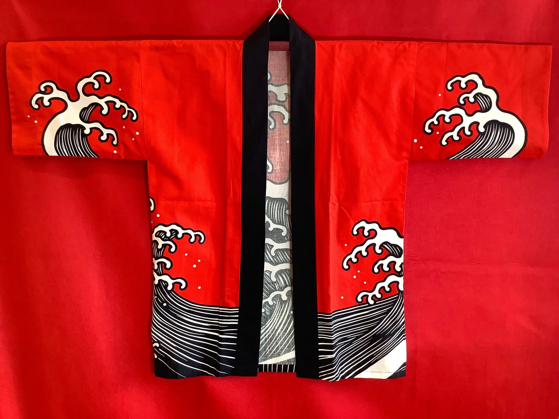 Fairly thick cotton adult matsuri jacket in red, with a graphic wave pattern. Sky blue contrast cuff facings. Condition is excellent.