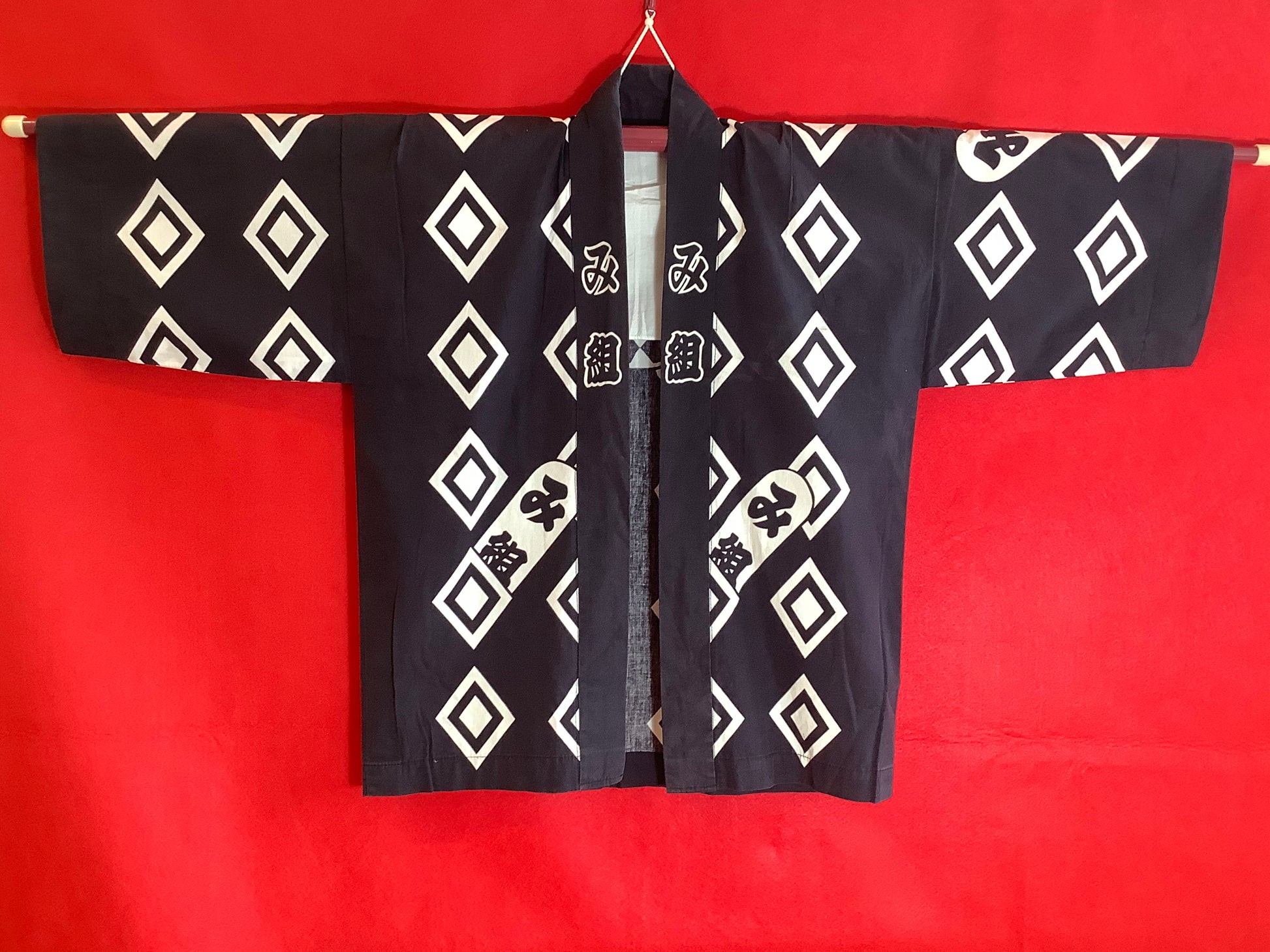 A soft cotton matsuri jacket in navy blue with sky blue cuff facings. A pattern of repeated diamond shapes, with calligraphy cartouches, and a red central character. Condition is very good, with slight starch spotting.