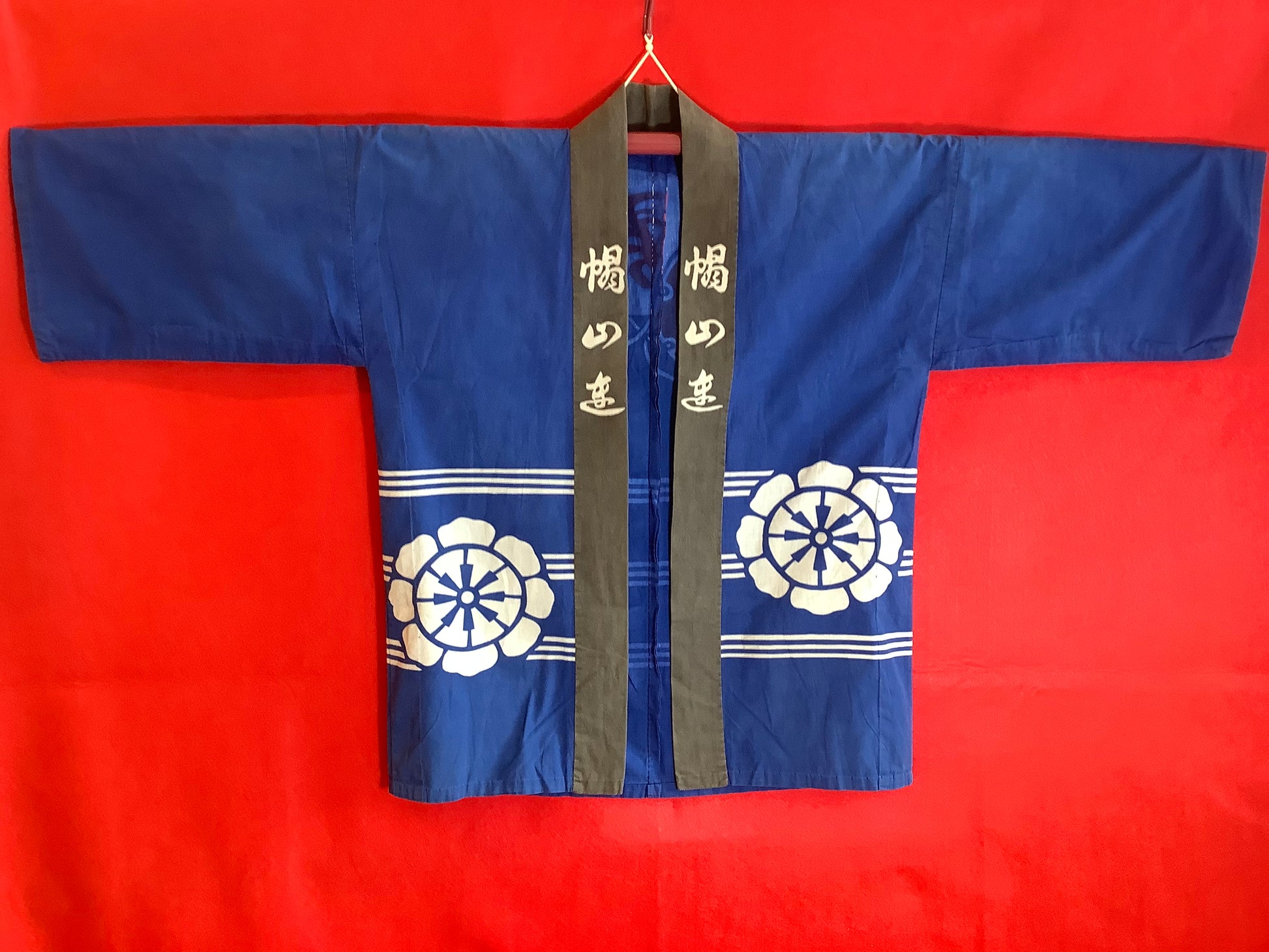 A light weight cotton matsuri jacket in mid blue , with genji wheels within lotus flowers. Condition is excellent.