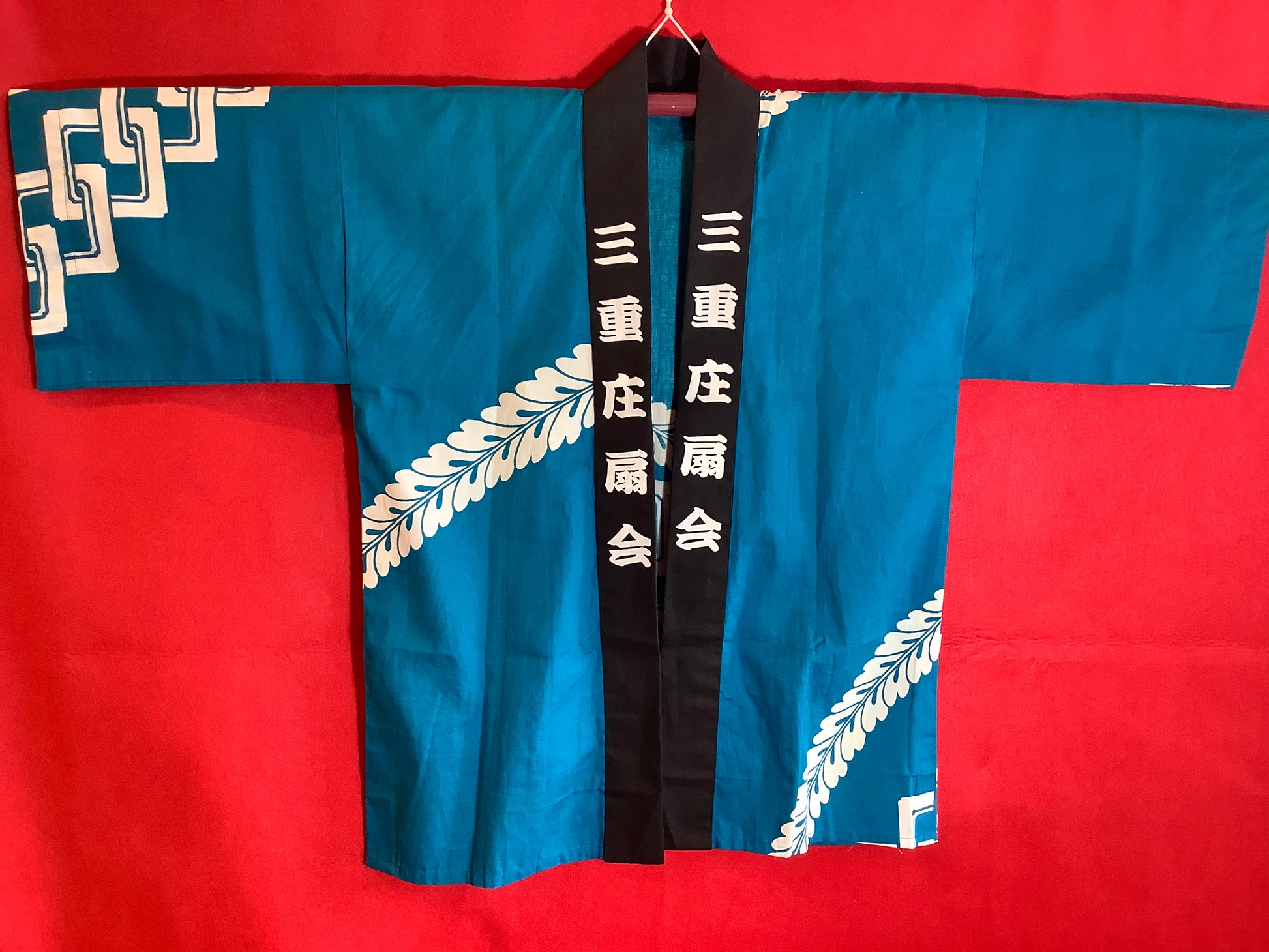 Sky blue matsuri jacket with diagonal chain and wisteria pattern. Medium weight cotton in excellent condition.