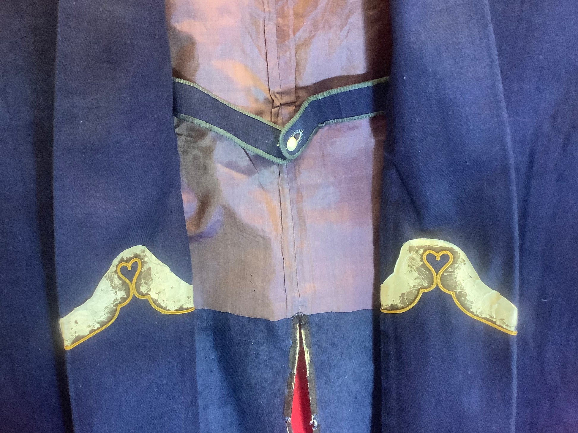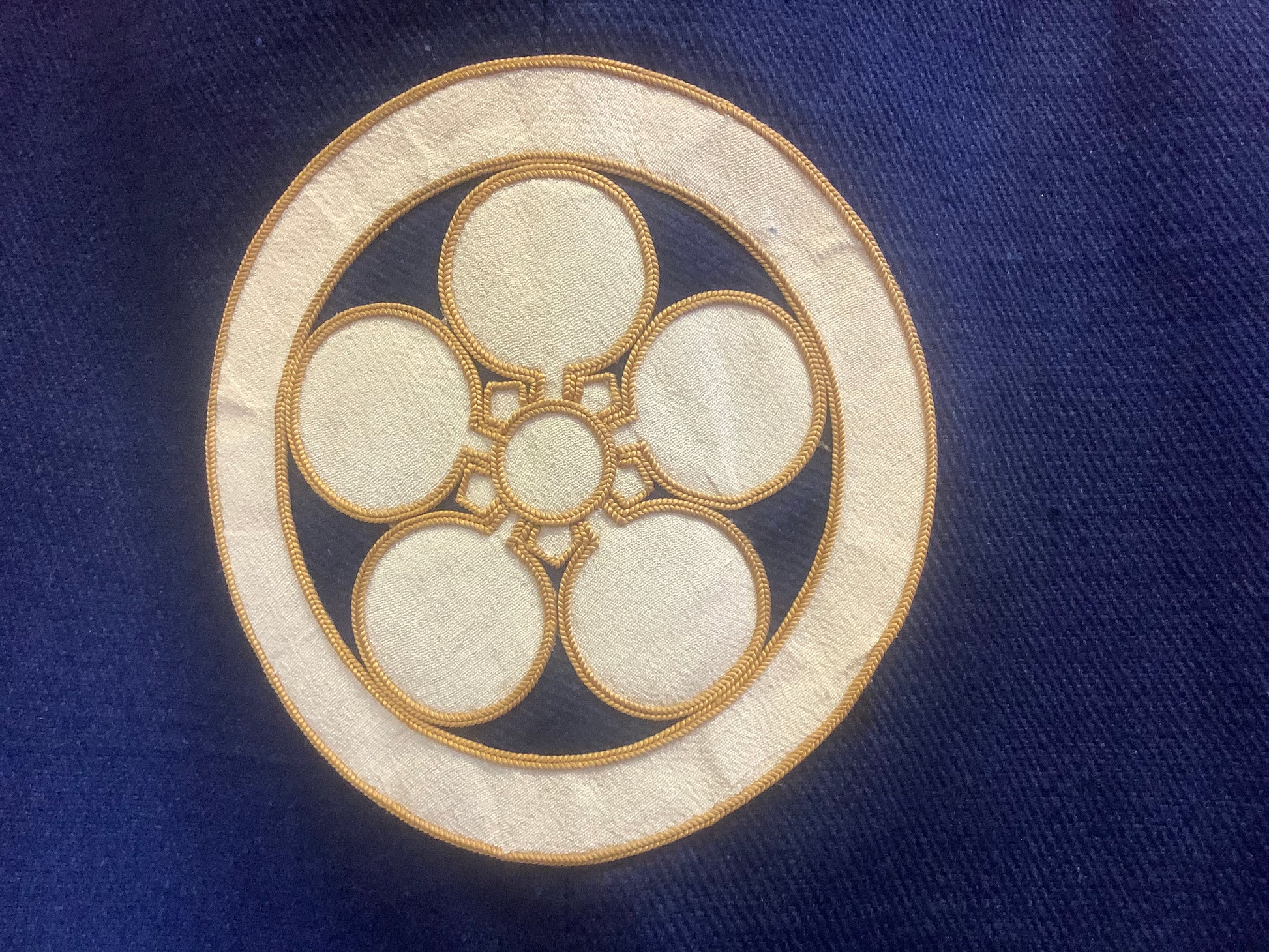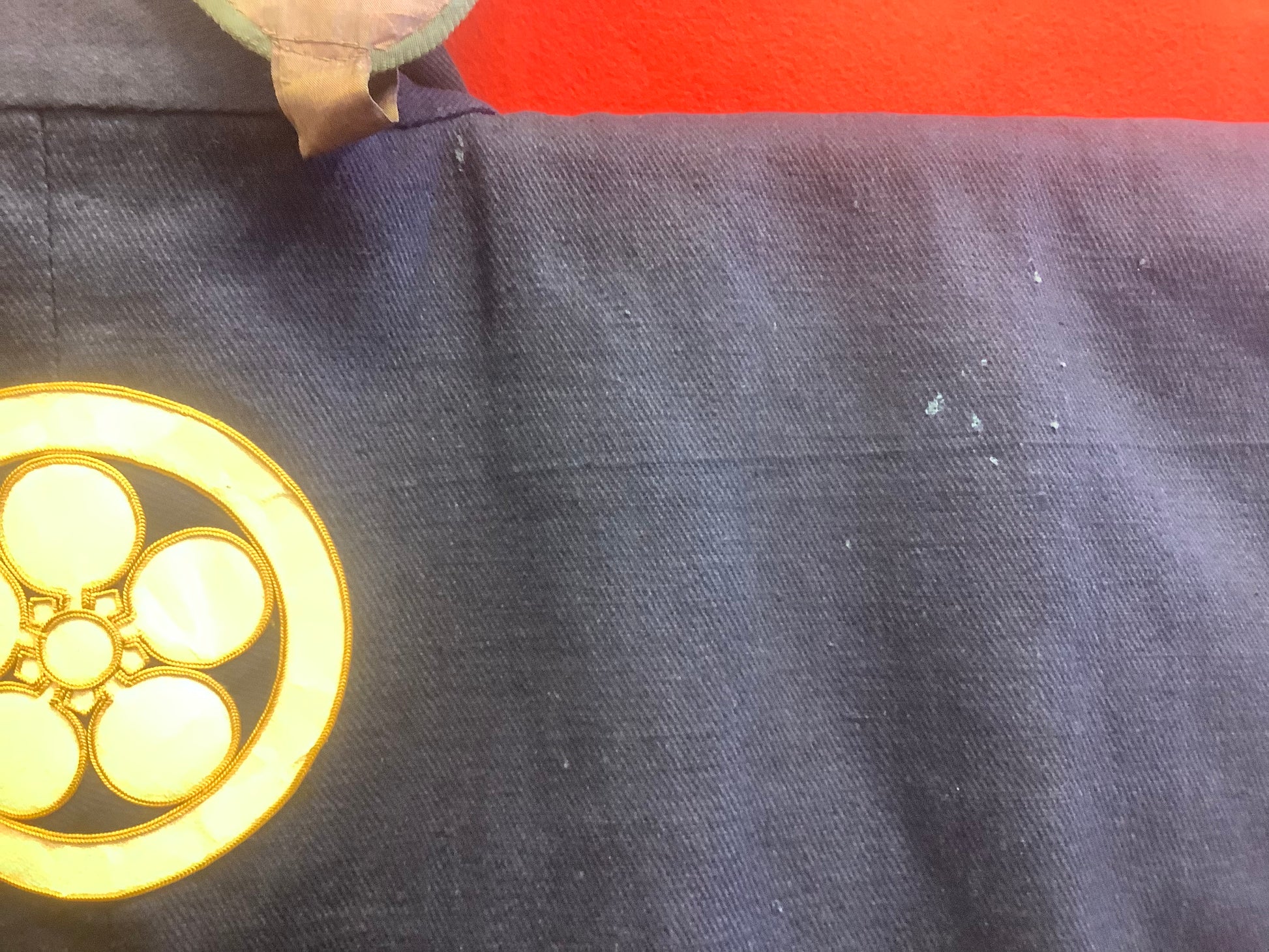 Very rare samurai livery. Hanten, breast bib and head band. Thick cotton drill weave with appliqué and embroidery. It is dated to the Meji period. There are abrasions and a few tiny holes. One cut to the left of the back mon. Overall condition is very good.