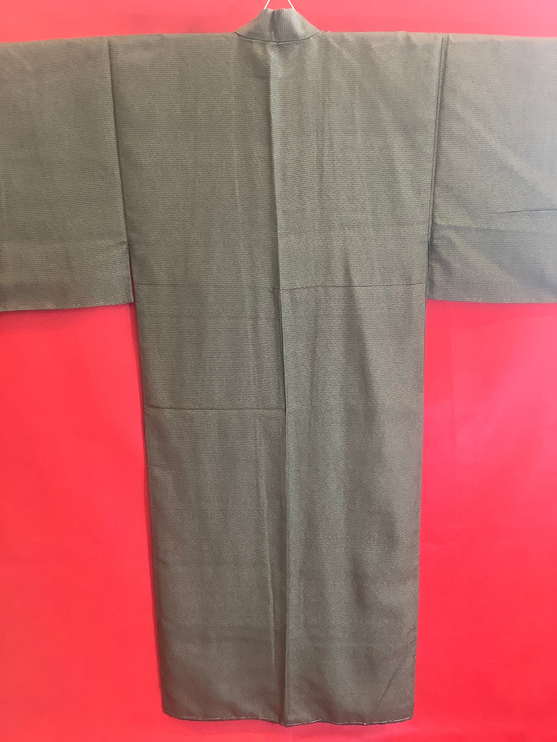Fine wool kimono, light weight. Basting stitches still in place. Khaki brown stripe. Condition is excellent.