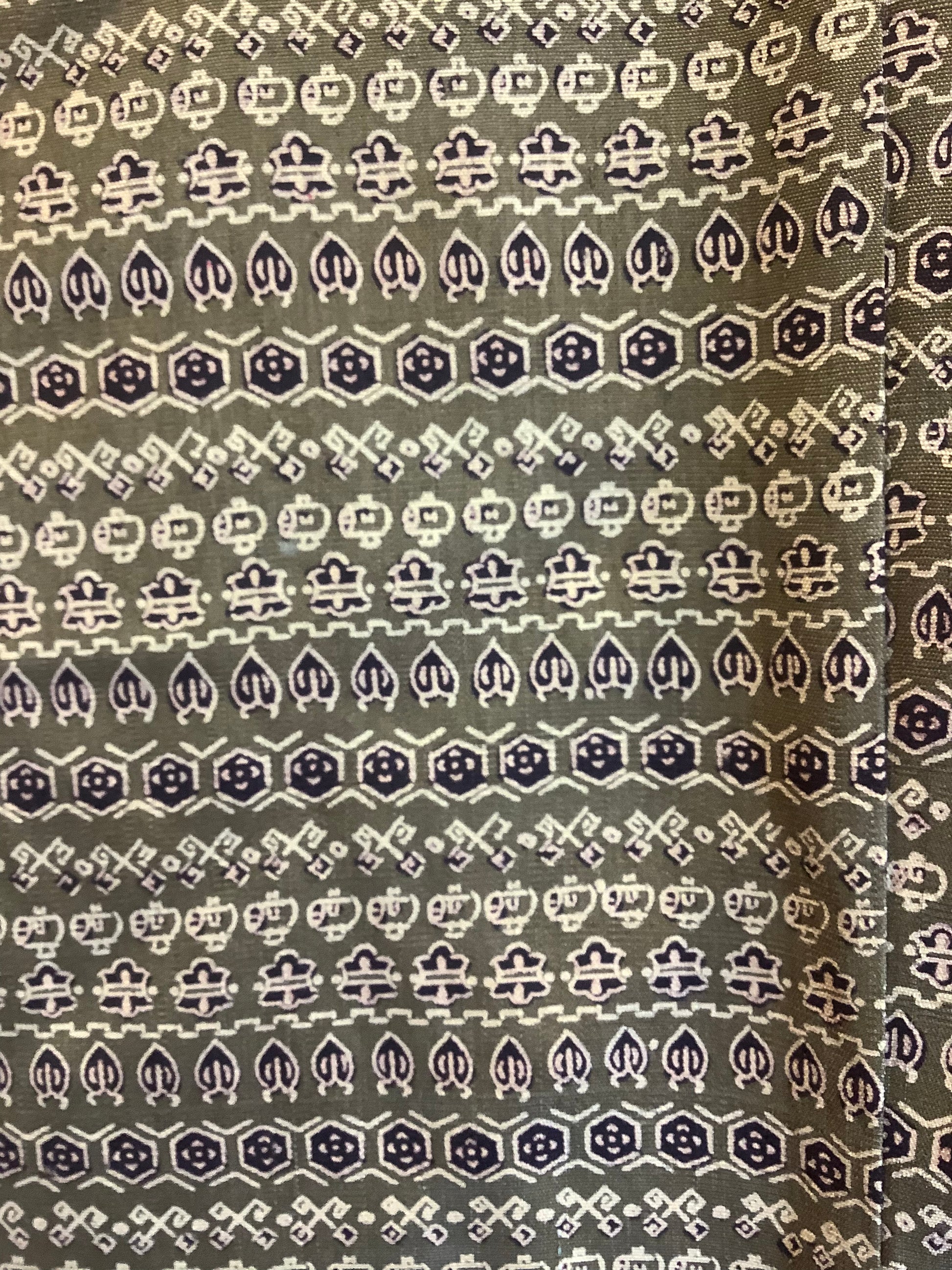 Olive green/ brown silk kimono with small patterns in horizontal stripes. Condition is excellent.