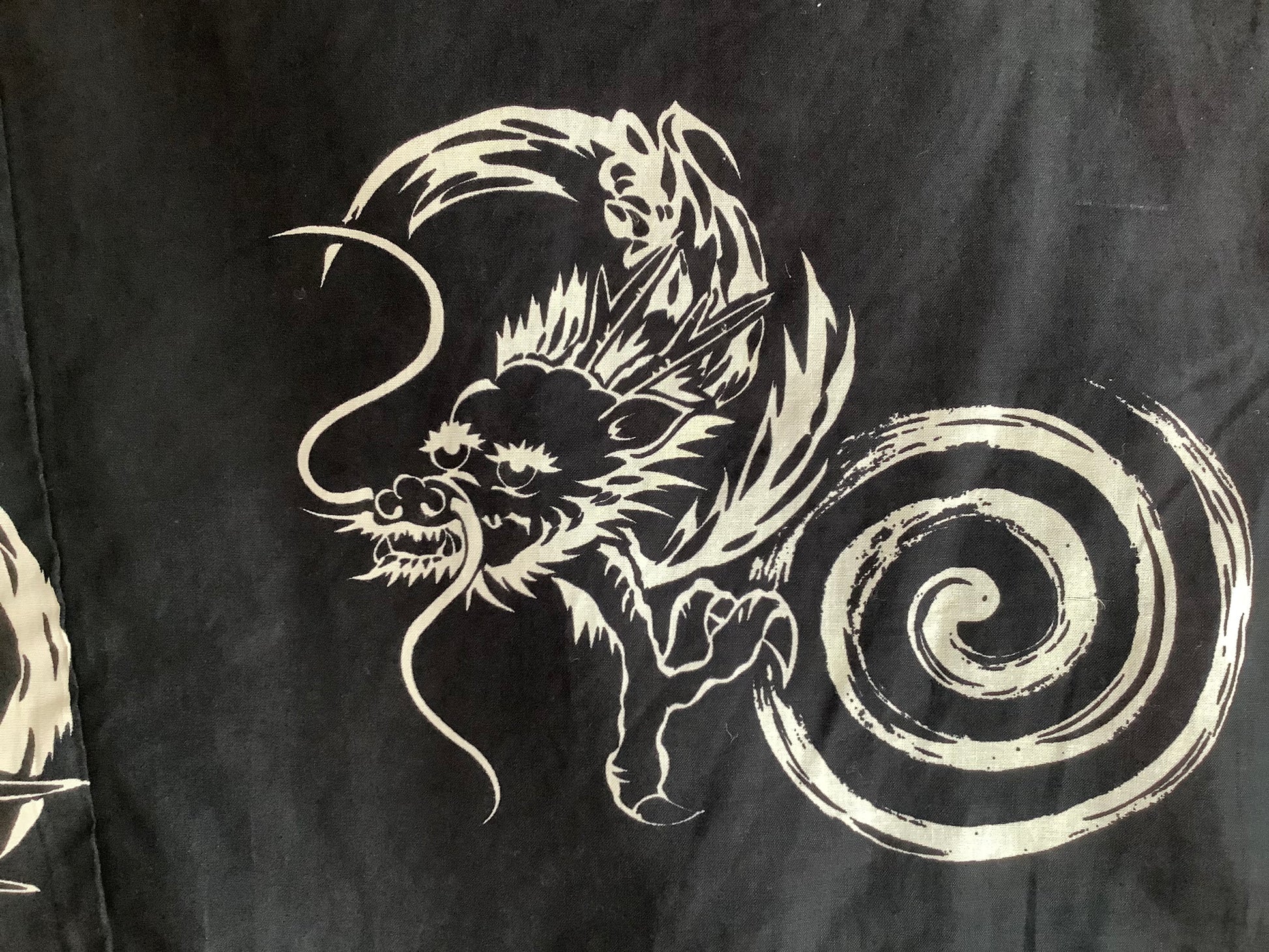 Fantastic thunder dragons writhe in an ink black sky. Material is cotton, and condition is excellent.