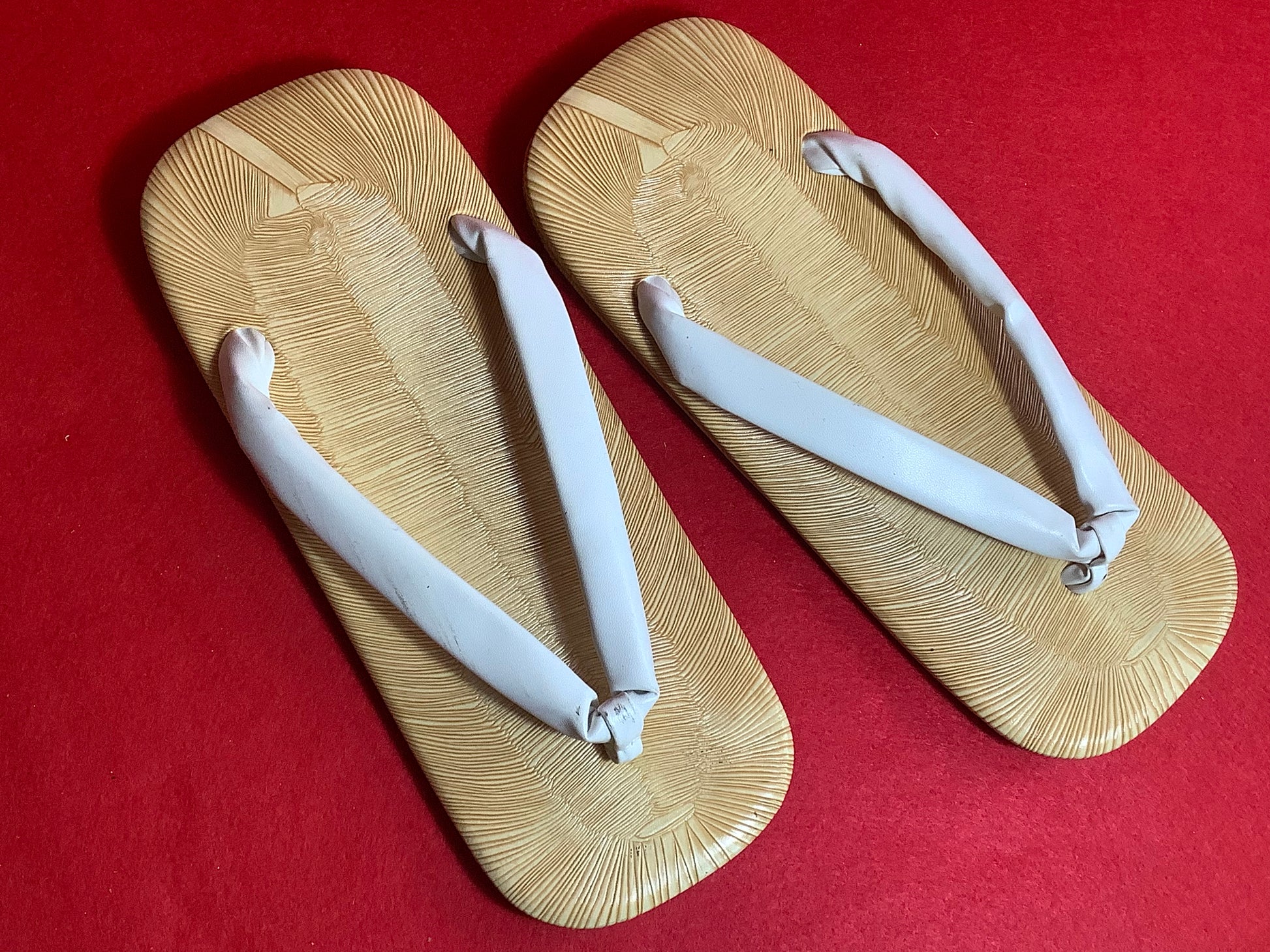 A pair of mens zori. Imitation tatami with white plastic straps. Condition is very good, lightly used.