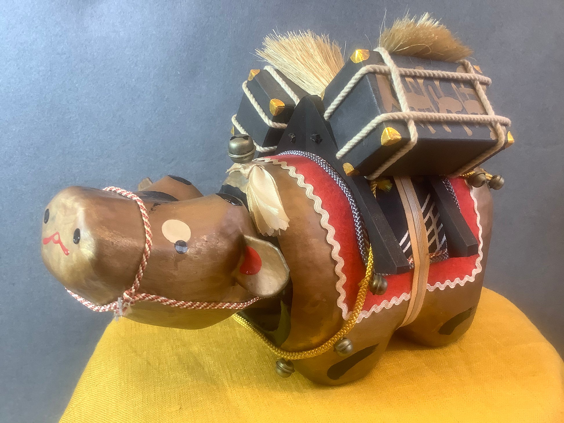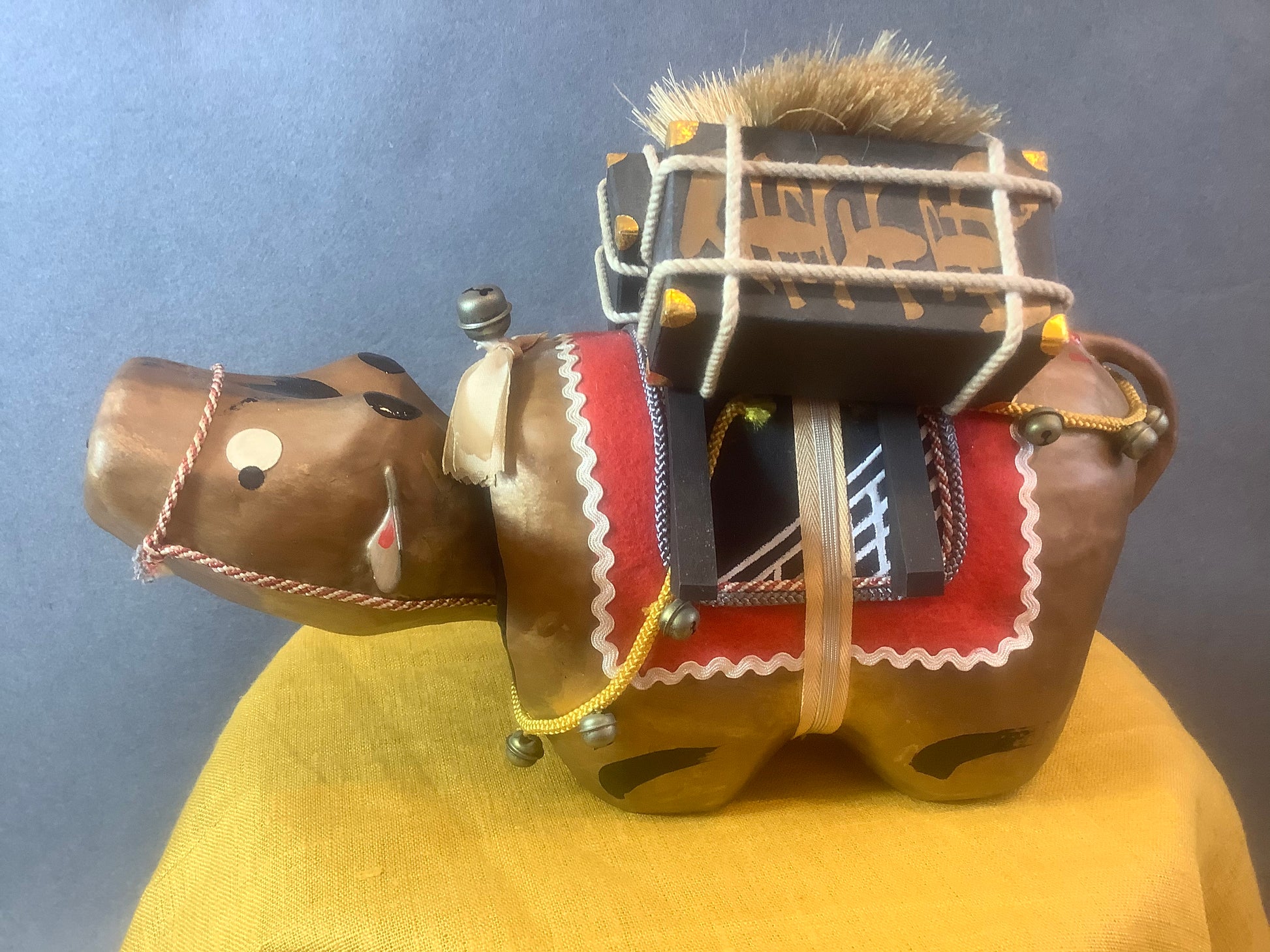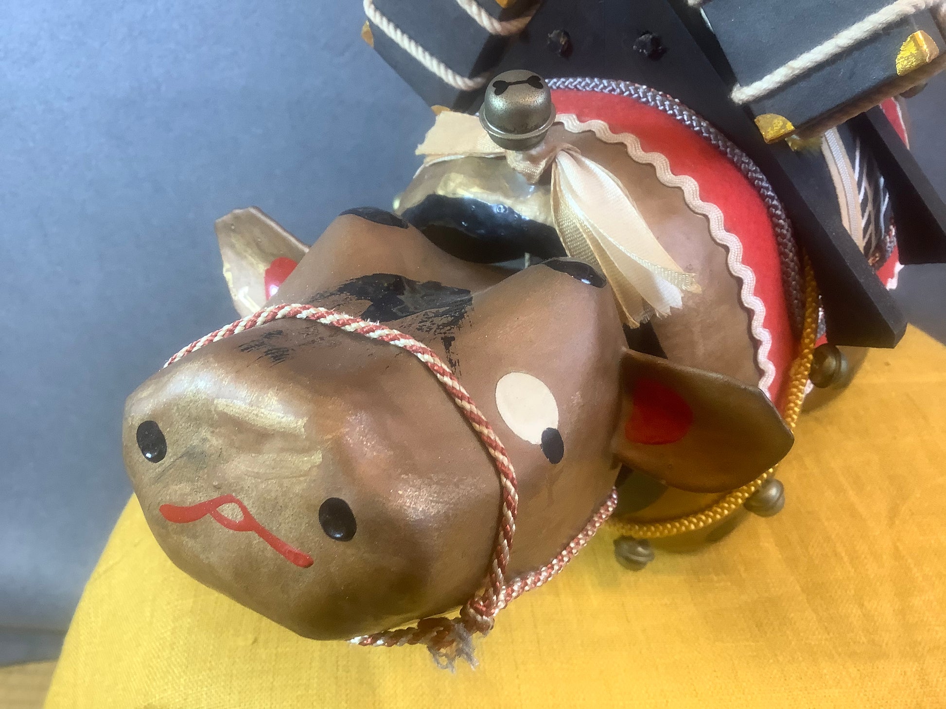Lovely Mid Showa lucky cow, loaded with it’s treasure chests. Made of papier-mâché it has a wooden frame for chests, and fabric and silk harness, decorated with bells. Condition is excellent.