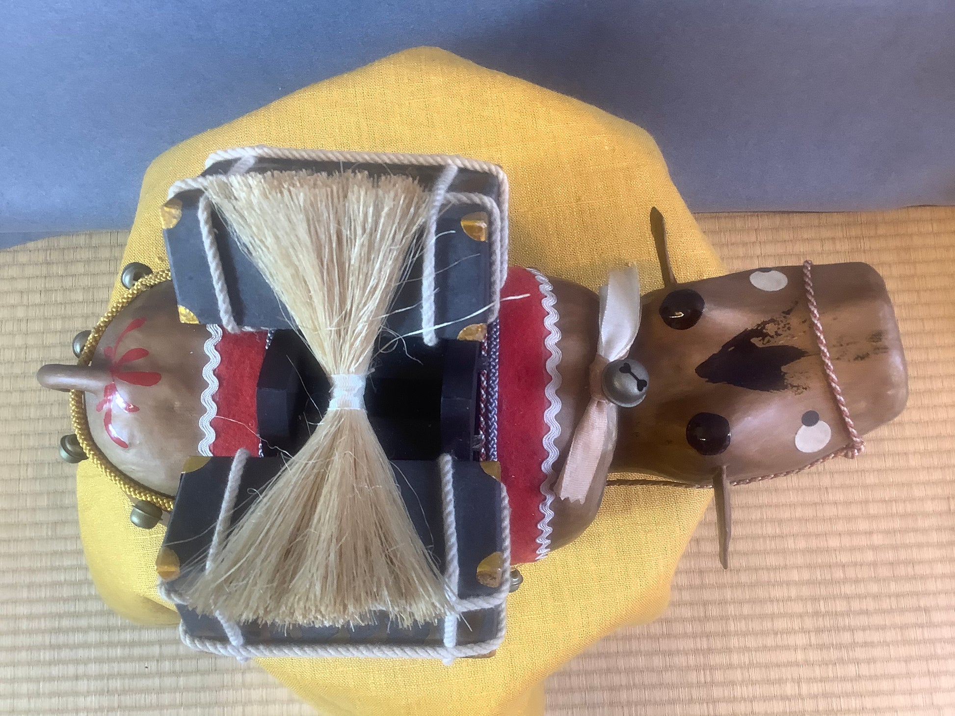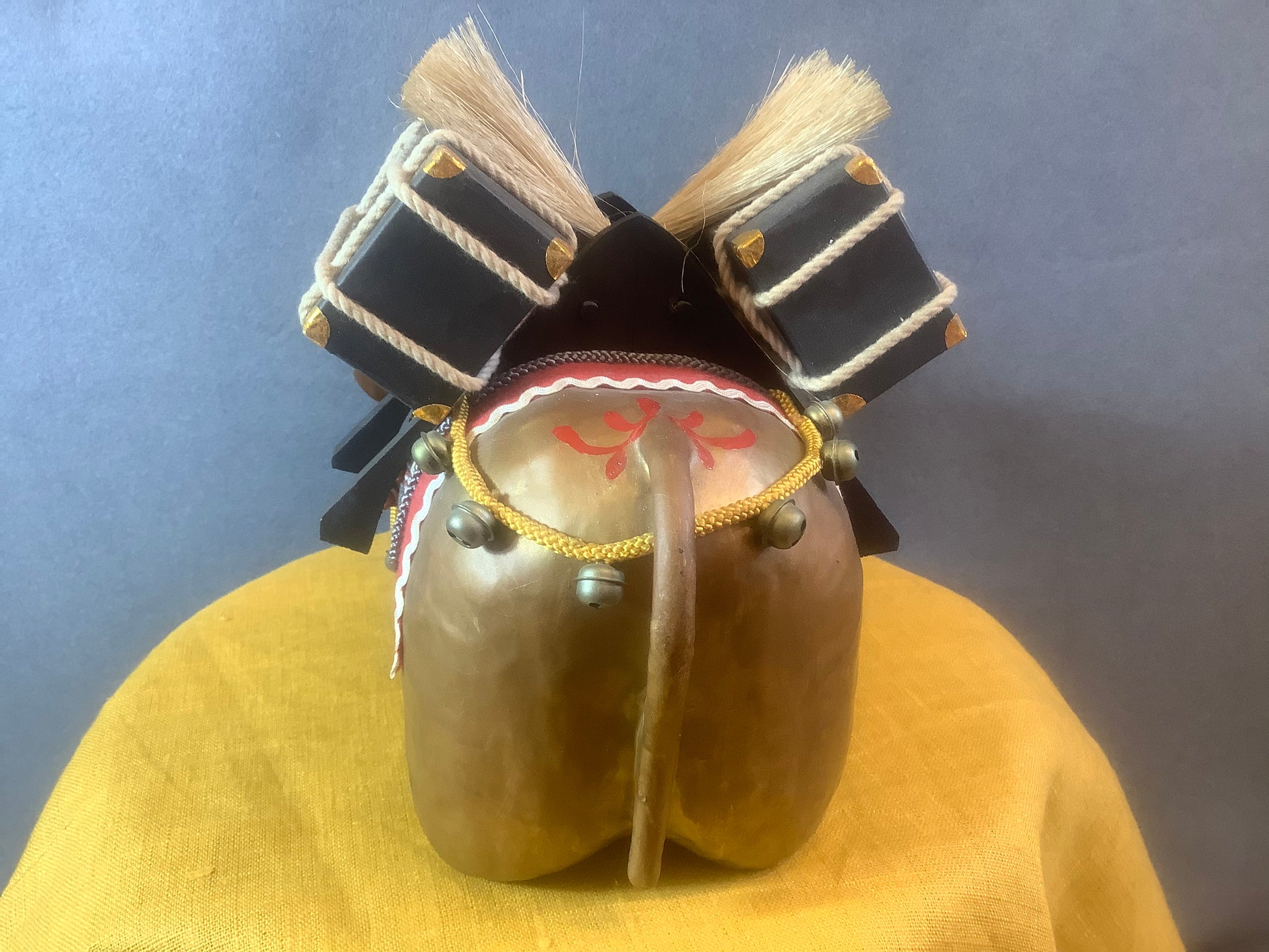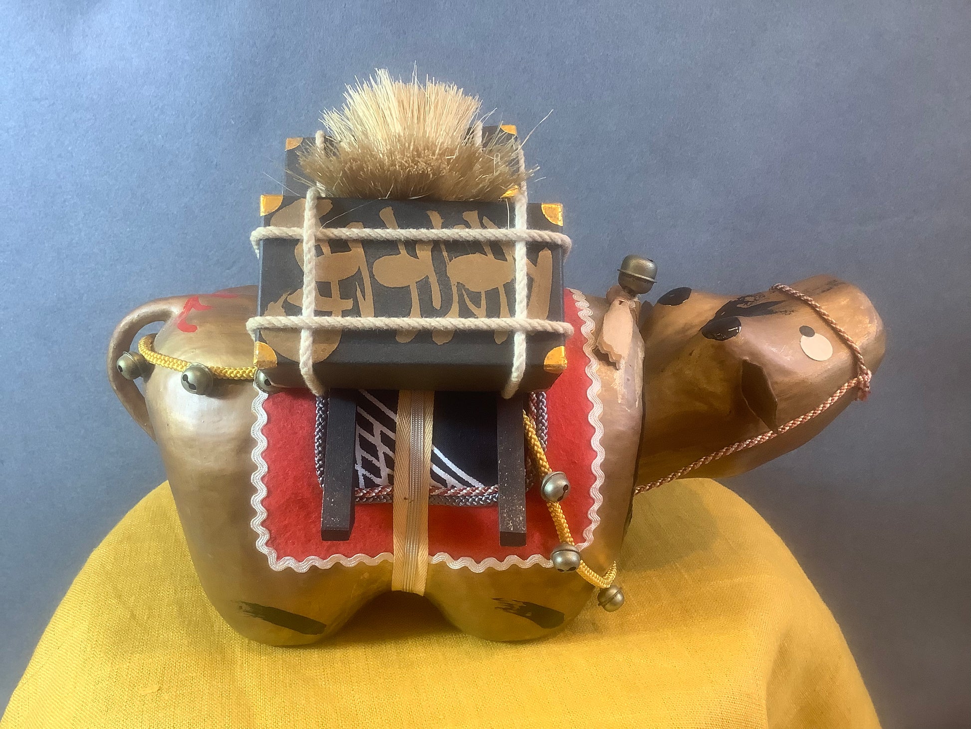 Lovely Mid Showa lucky cow, loaded with it’s treasure chests. Made of papier-mâché it has a wooden frame for chests, and fabric and silk harness, decorated with bells. Condition is excellent.