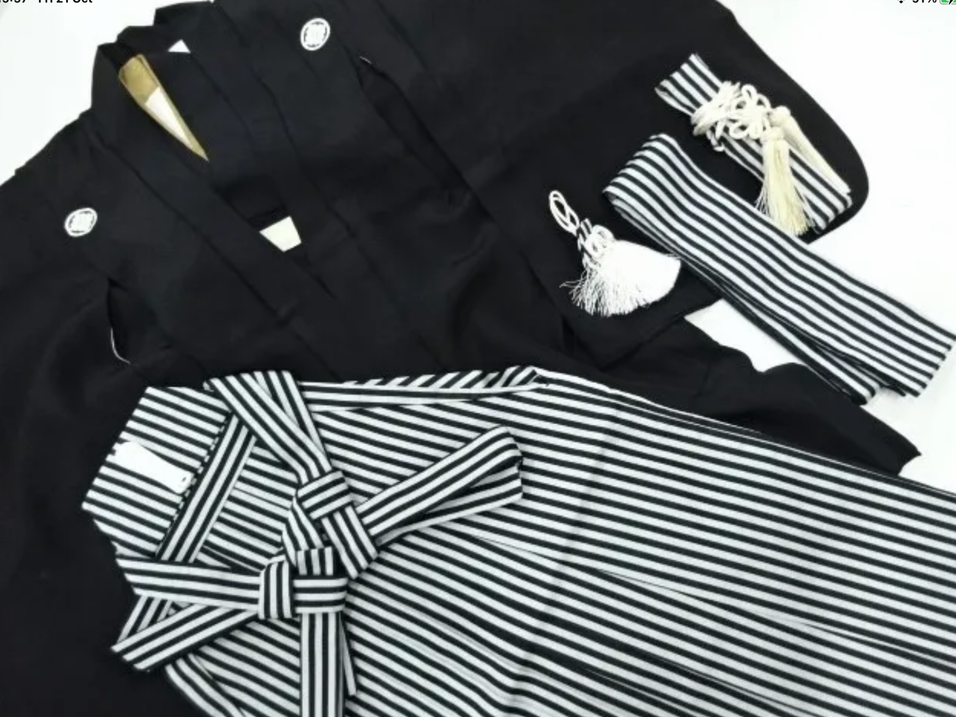 Six piece Shichi-go-san set. Plain black kimono with tucks at the waist and shoulders. Haori with five mon and tucks at the shoulders. Hakama, obi, kaiken and amulet. Materials are synthetic and condition is excellent.