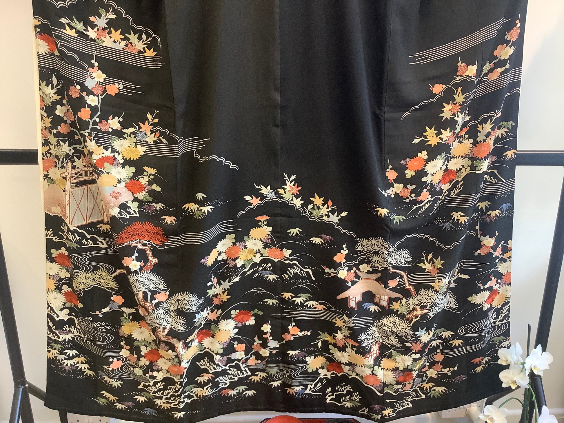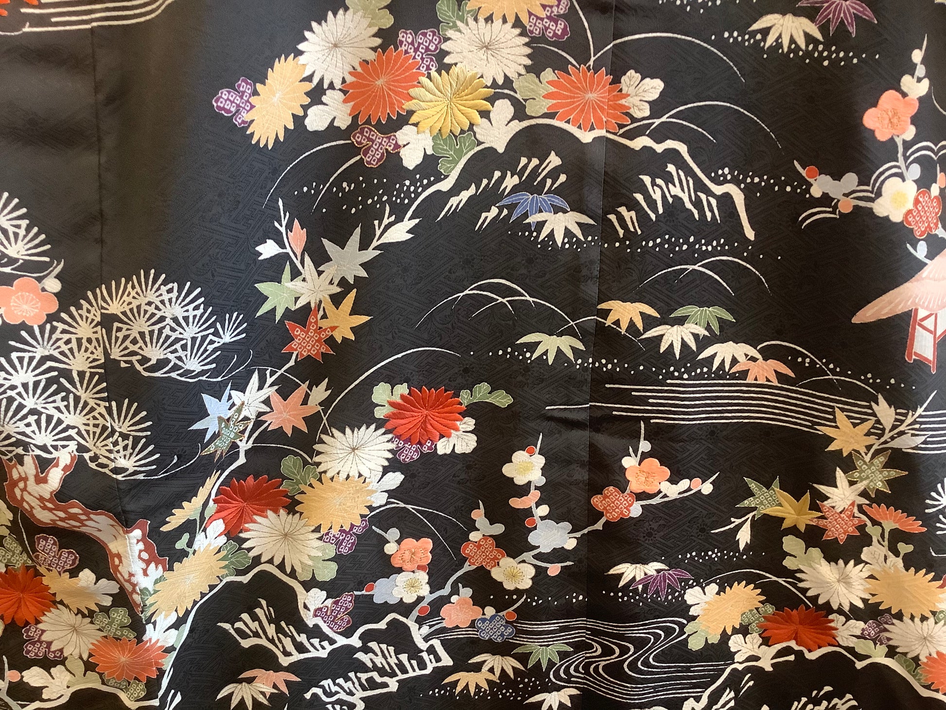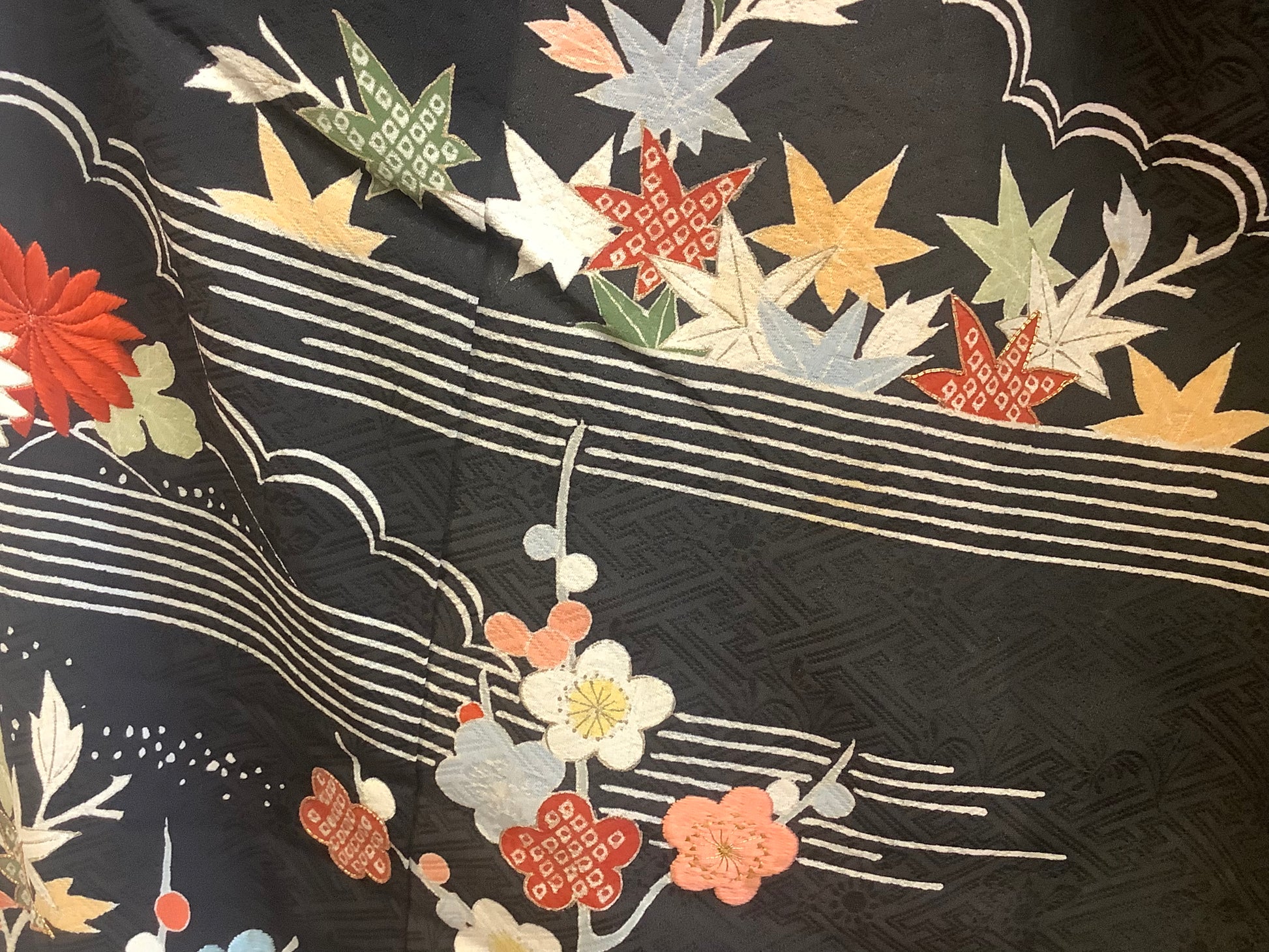 This was a geiko piece and is of the finest work. Yuzen dyed with many silk embroidered highlights.It has a pattern of a garden seen through the mist. It is a finely figured silk with lightly padded sleeve openings and hems.