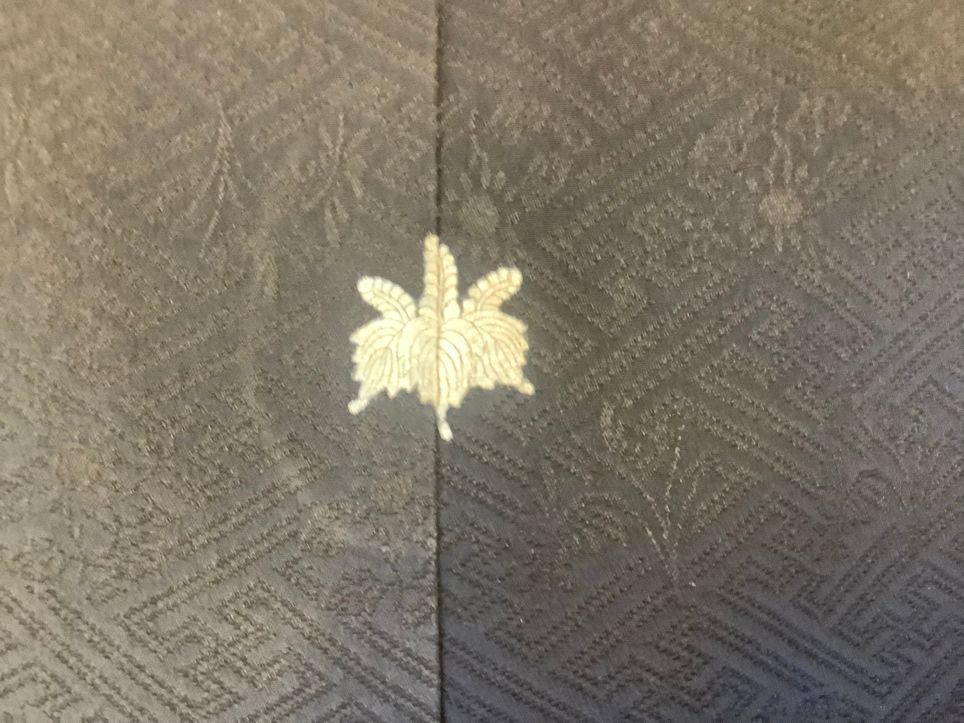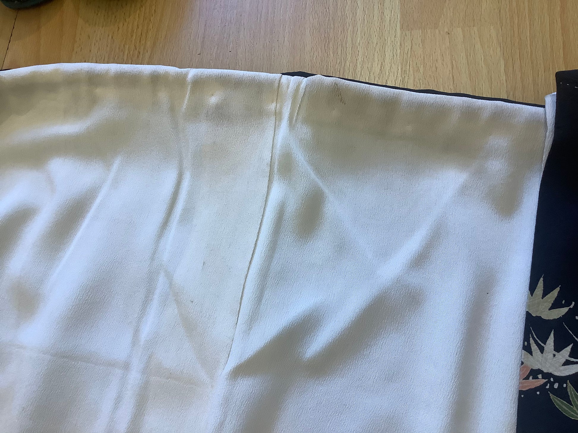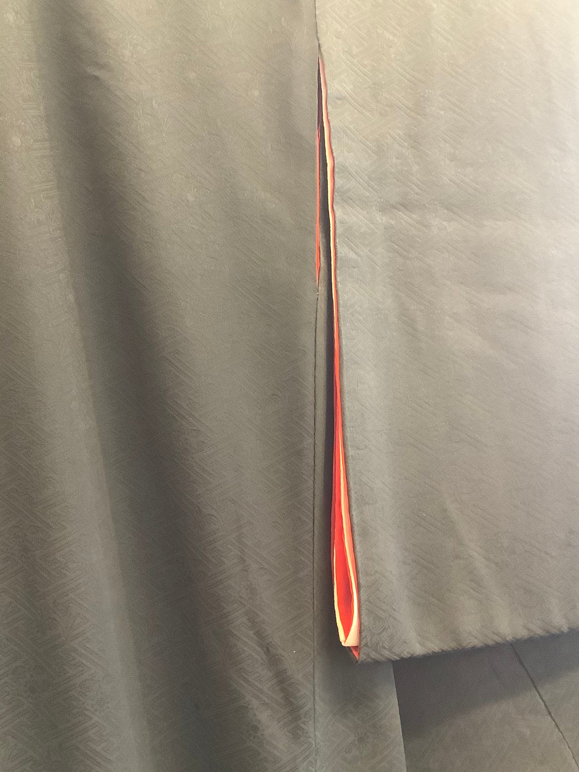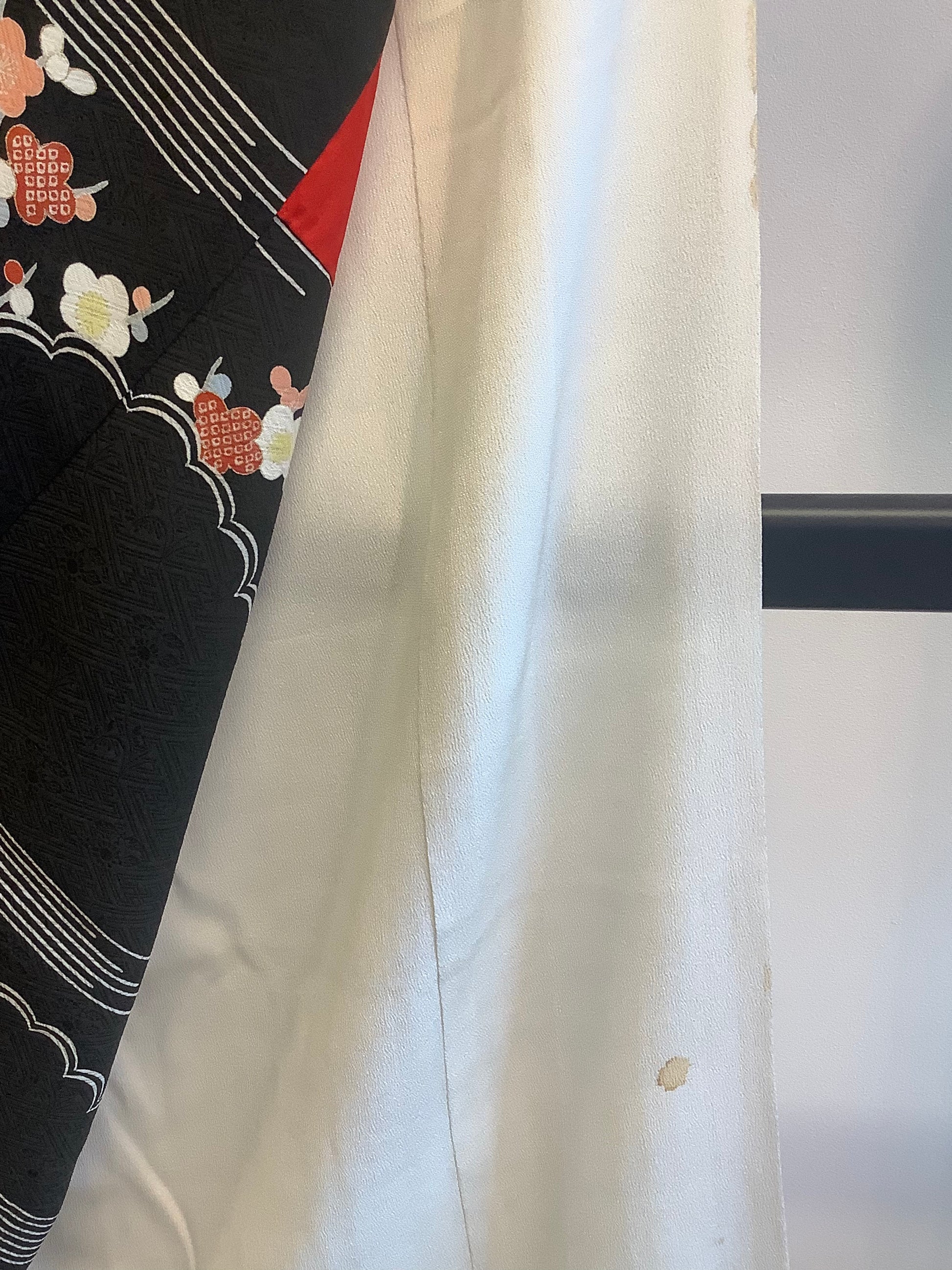 The pattern continues around the lower part inside the kimono as well. The primary lining is of fine red silk habotai.There is a secondary fine chiramon lining which is attached at the upper body inside. The secondary lining has a few stains on the edges as seen in the photographs. There is also a slight stain on the upper right front pattern.It is normal for Maiko and Geiko pieces to be stained, due to their use. The left hand back panel has a colour difference in the black dye.