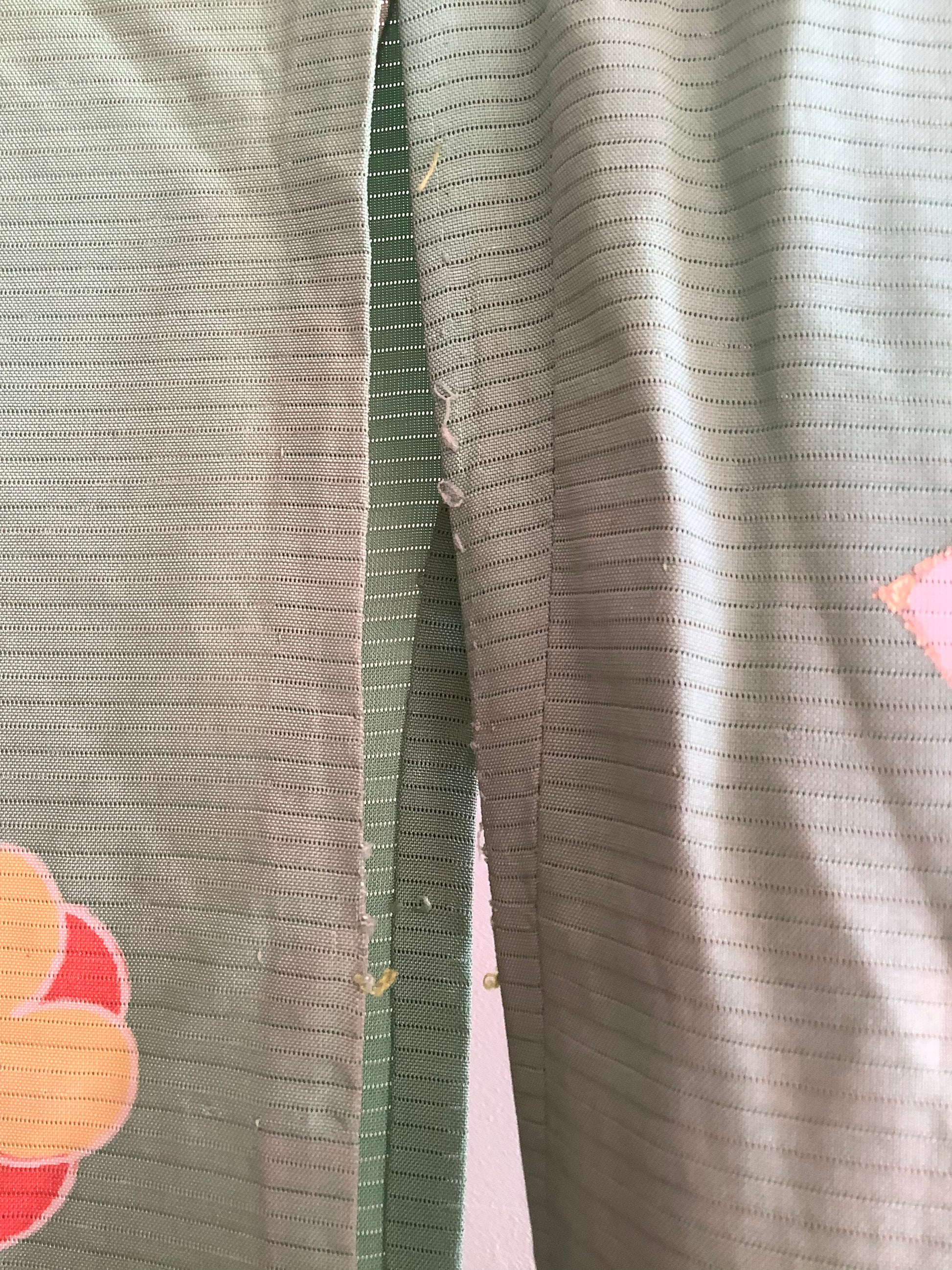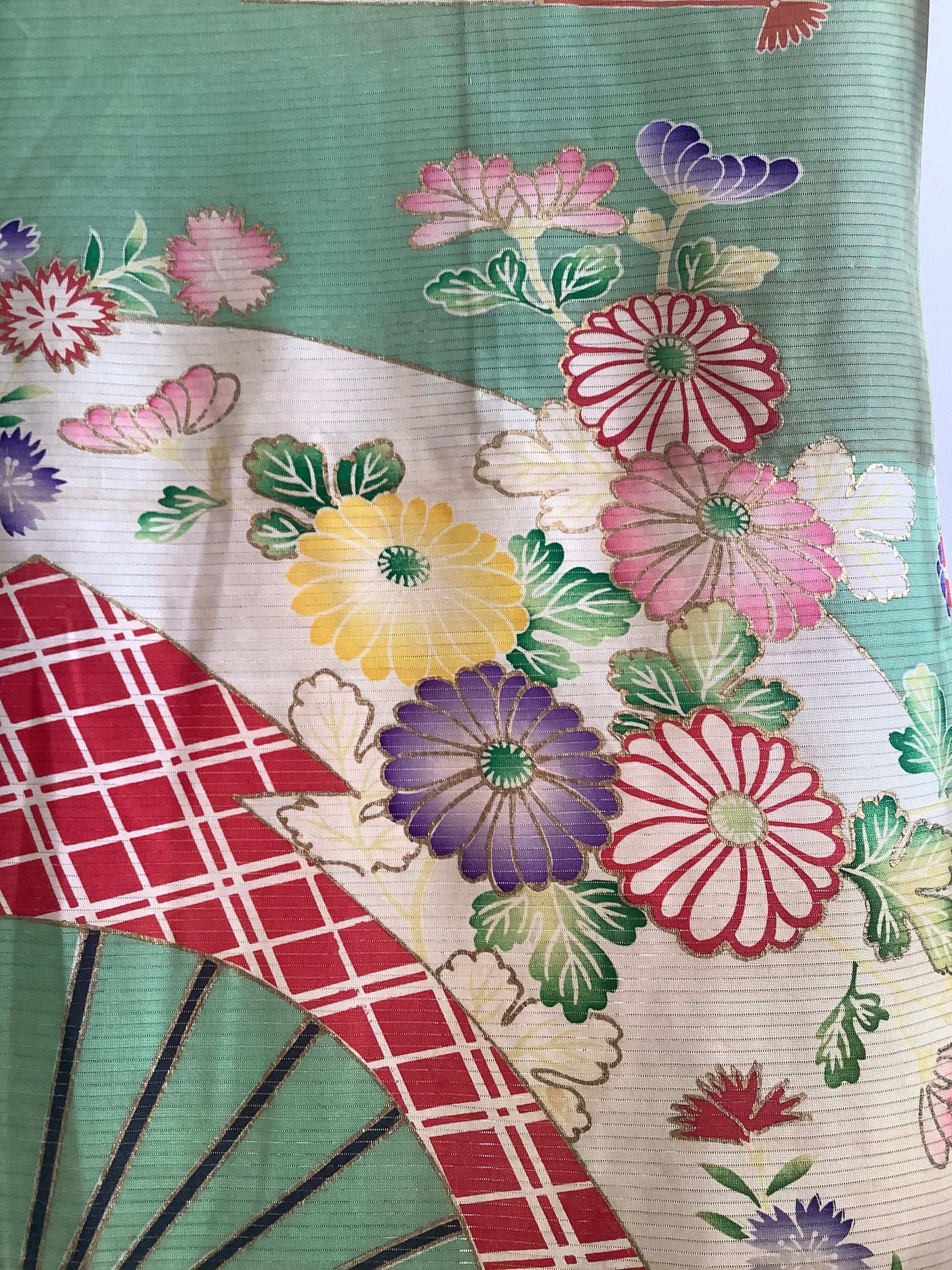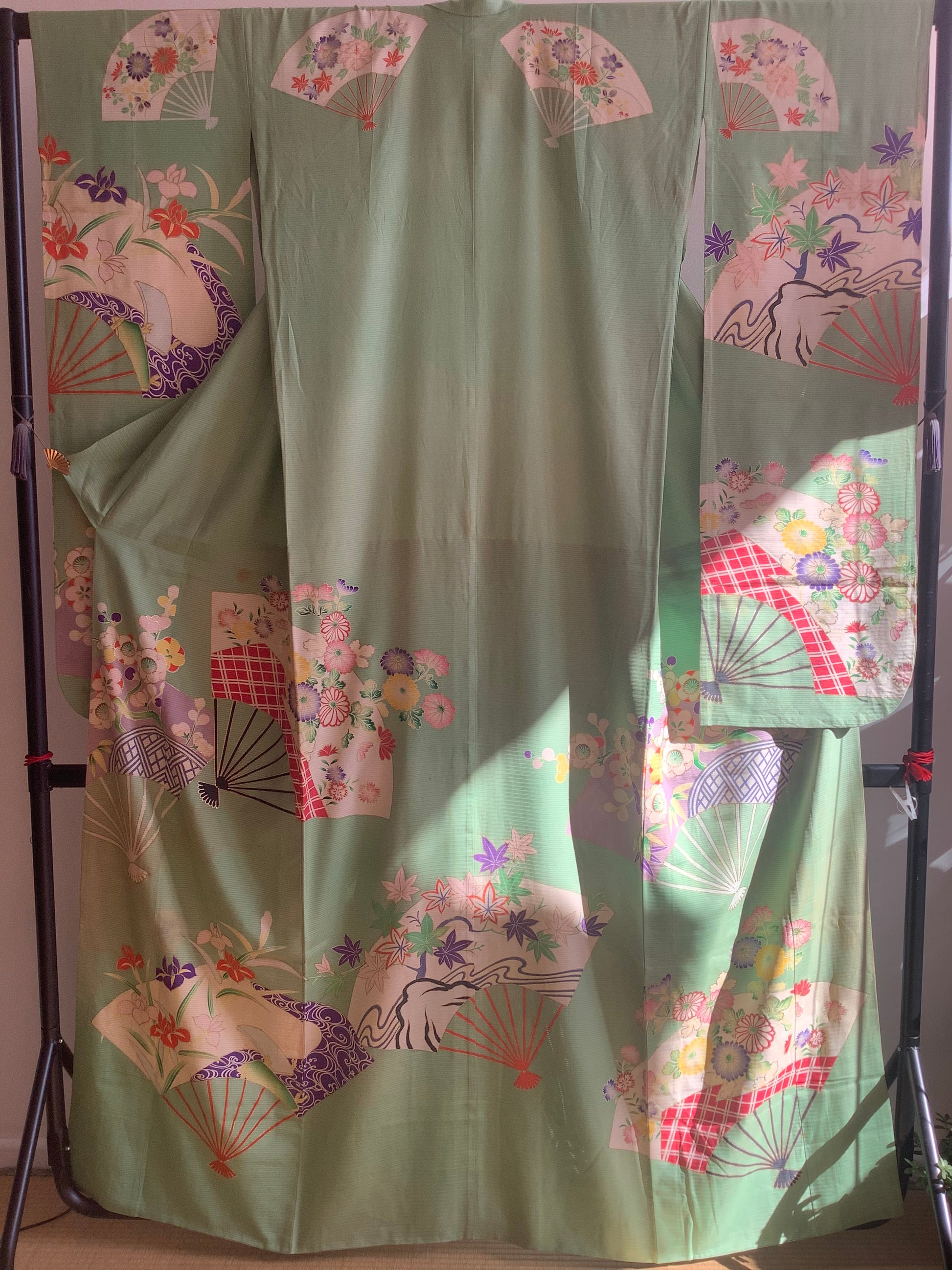 Ro silk gauze Taisho Era Maiko Suzahiki . Light green and decorated with yuzen dyed fans with floral motifs for all seasons. The tacking from the shoulders and sleeves has been removed, but crease lines are still visible. The stitching is coming away between the body and the right sleeve. There is dirt and many stains as is expected on such a garment from use. It still displays well, and is a rare addition for collectors. Condition is fair.