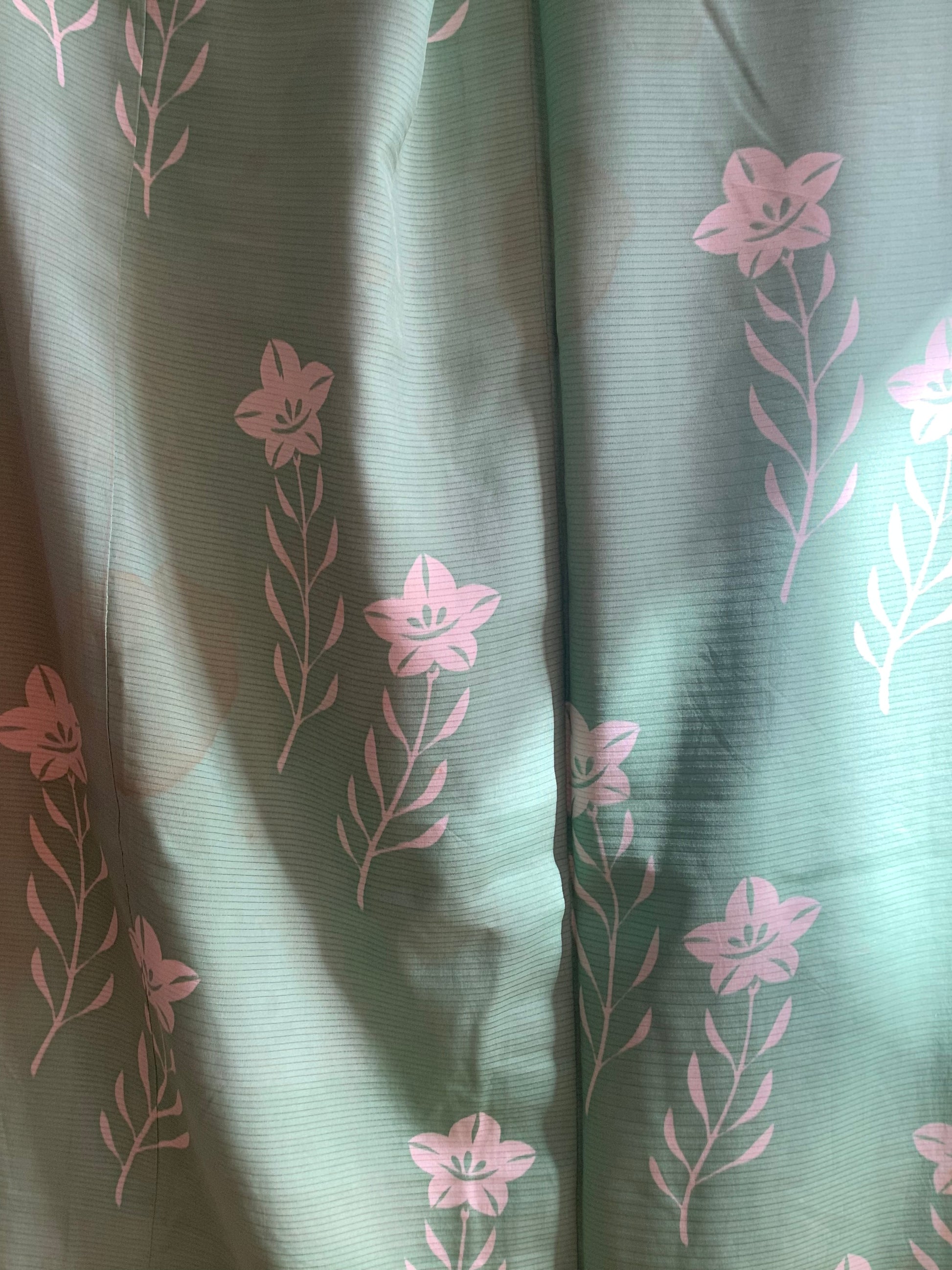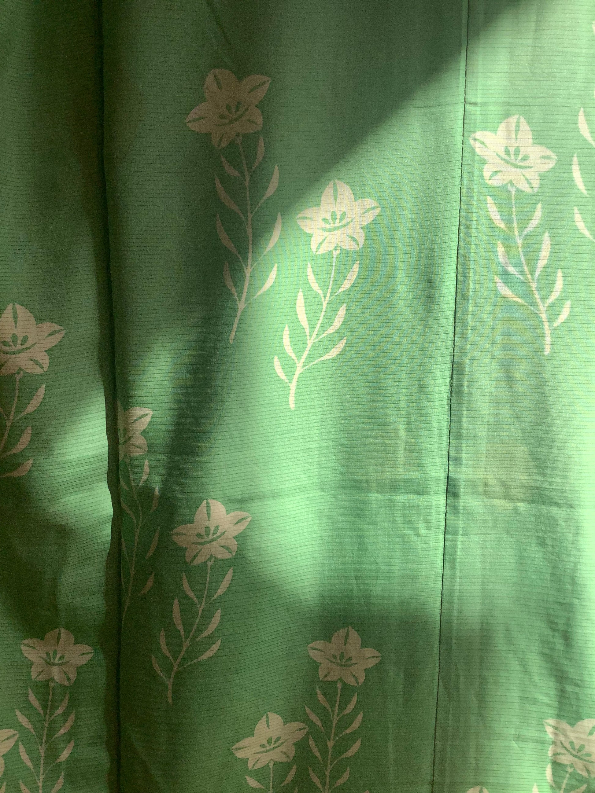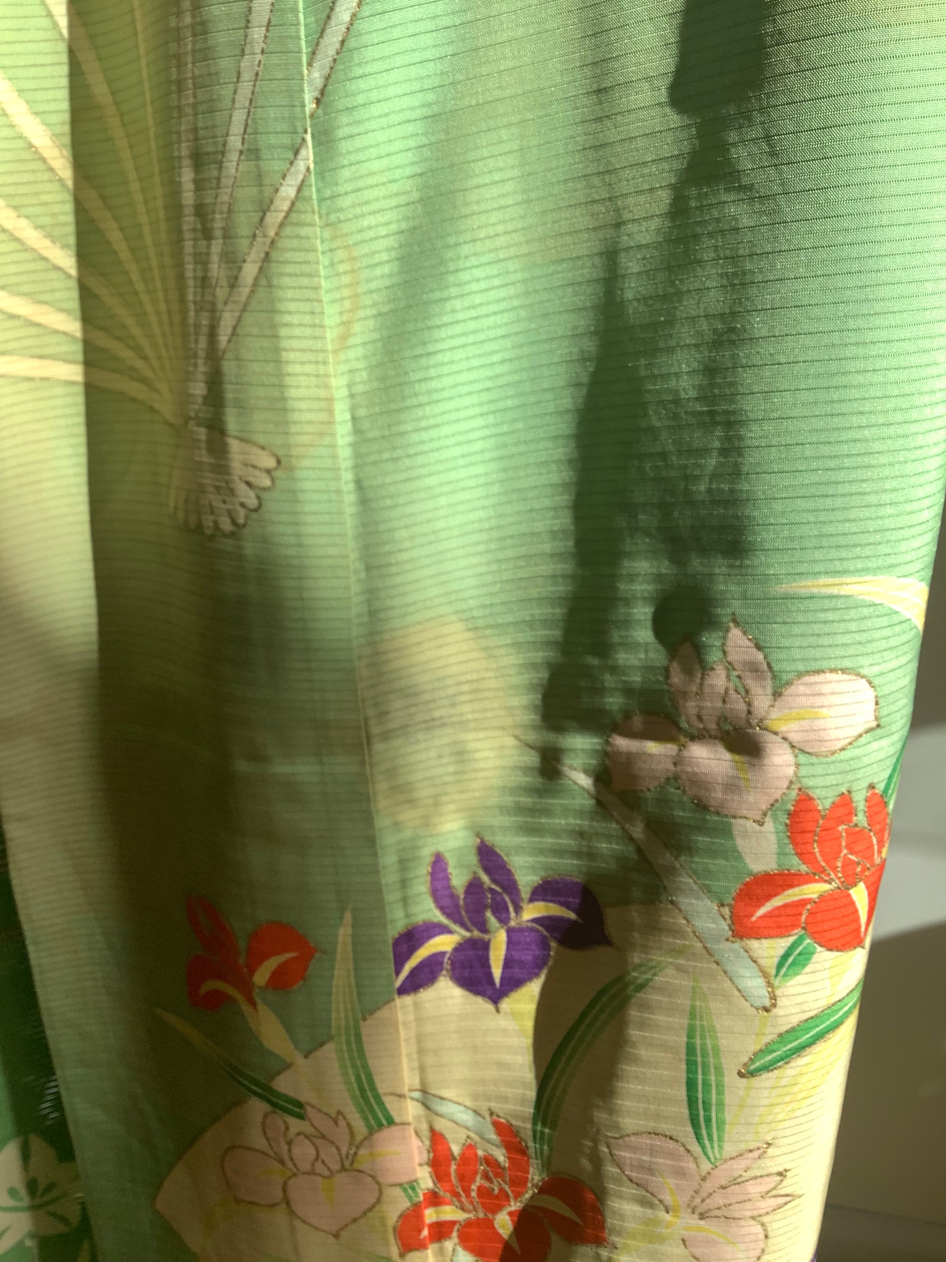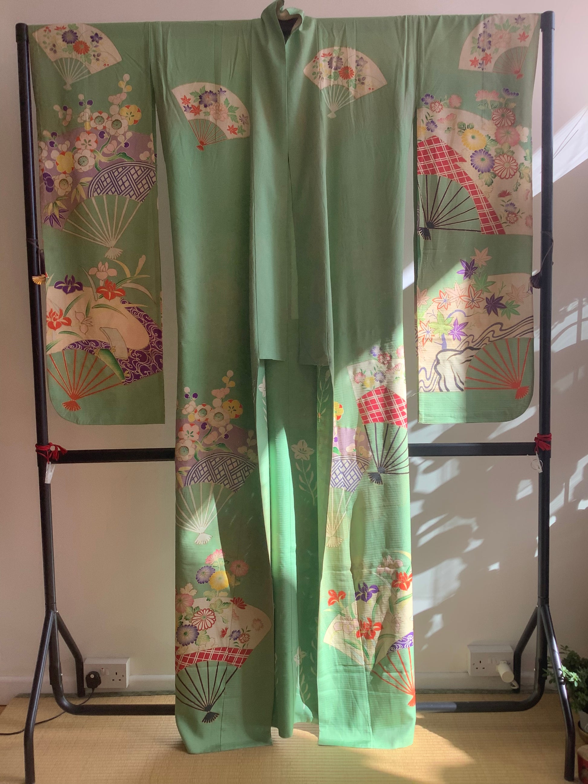 Ro silk gauze Taisho Era Maiko Suzahiki . Light green and decorated with yuzen dyed fans with floral motifs for all seasons. The tacking from the shoulders and sleeves has been removed, but crease lines are still visible. The stitching is coming away between the body and the right sleeve. There is dirt and many stains as is expected on such a garment from use. It still displays well, and is a rare addition for collectors. Condition is fair.