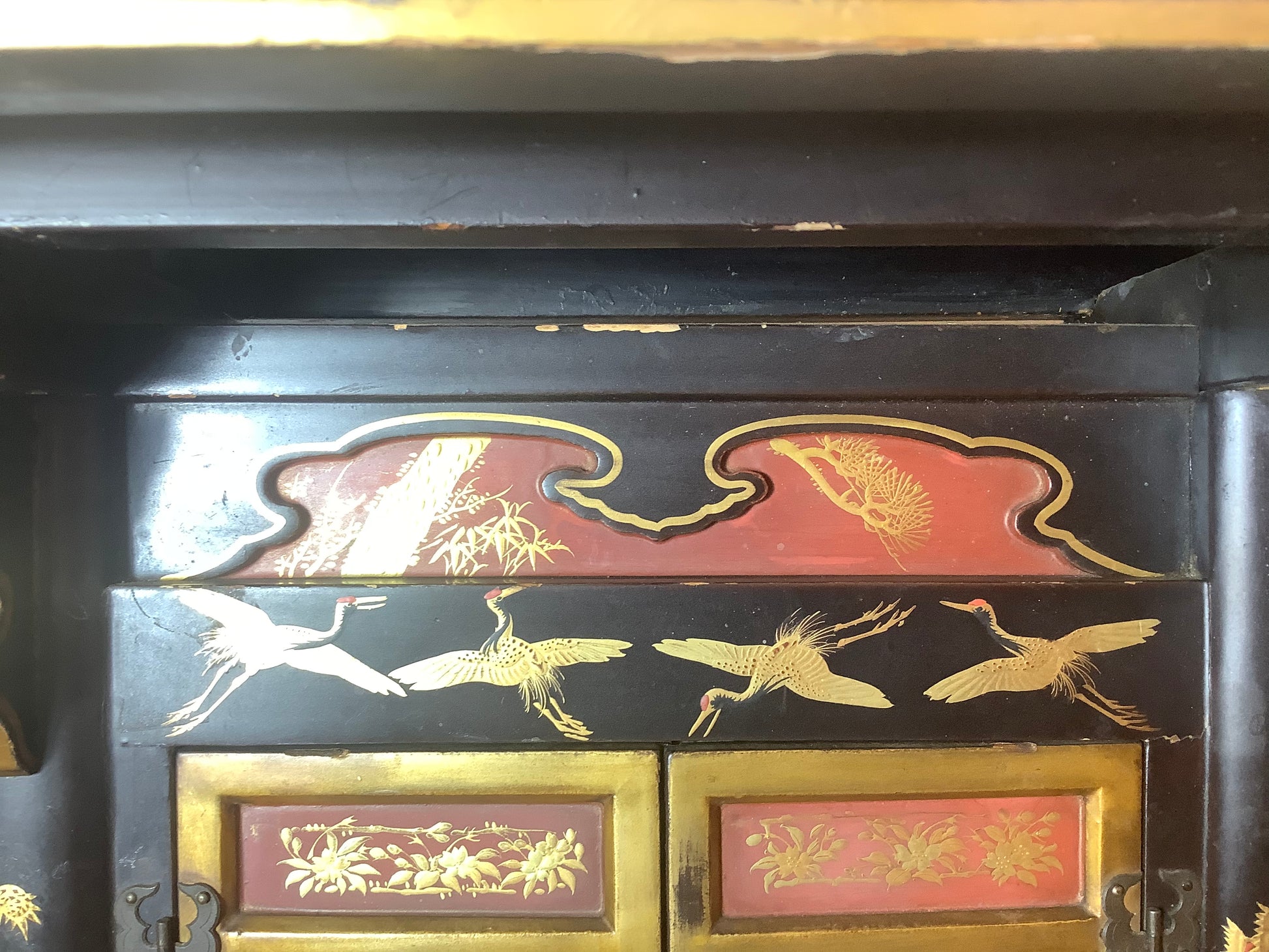 The steps and eves are decorated with paulownia mon. The side pillars are decorated with gold dragons, and the curved roof is in white crackle lacquer, with a flock of cranes. Cinnabar panelled doors open to reveal a white crackle lacquered interior decorated with a flight of cranes. The aperture is lined with green baize. This really is a spectacular piece.