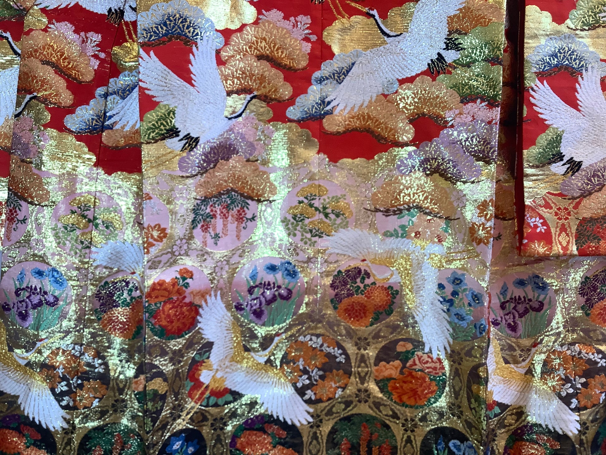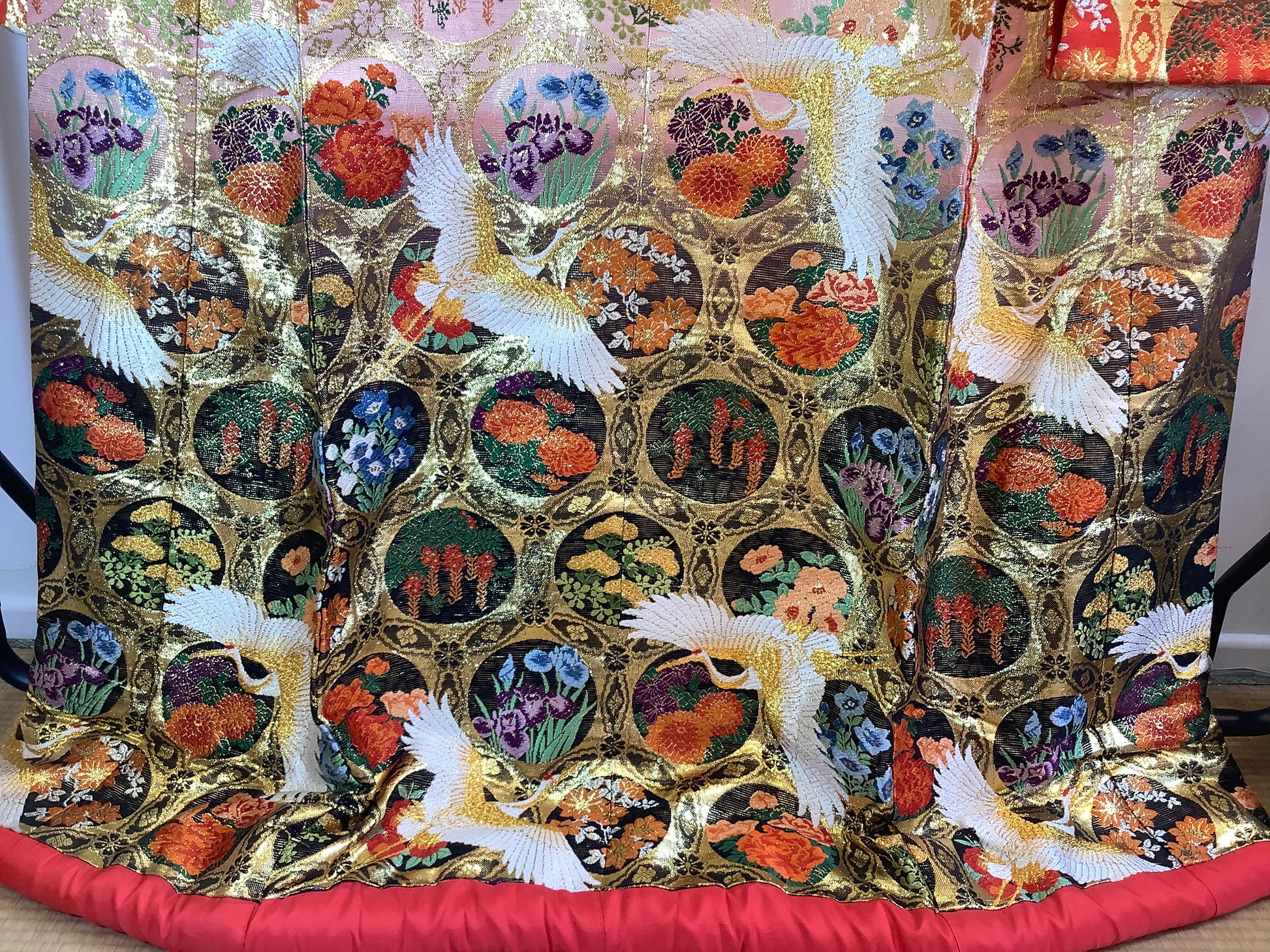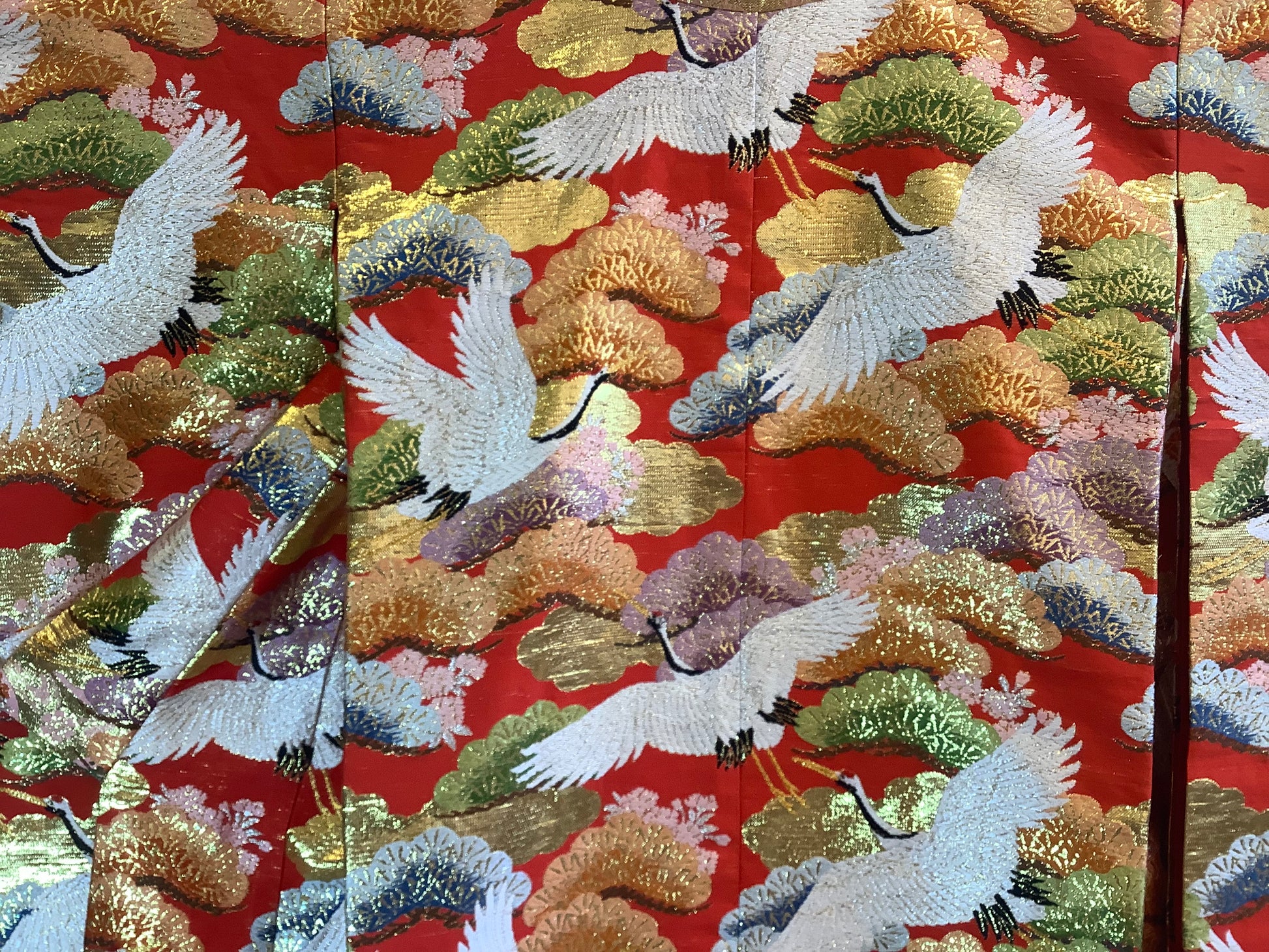 Shaded Uchikake, from black, through pink to scarlet. The hem starts with flower roundels at the hem, moving into pine trees and cherry blossoms. A flock of cranes circle around. The design is woven silk, with a heavily padded hem. The condition is excellent.