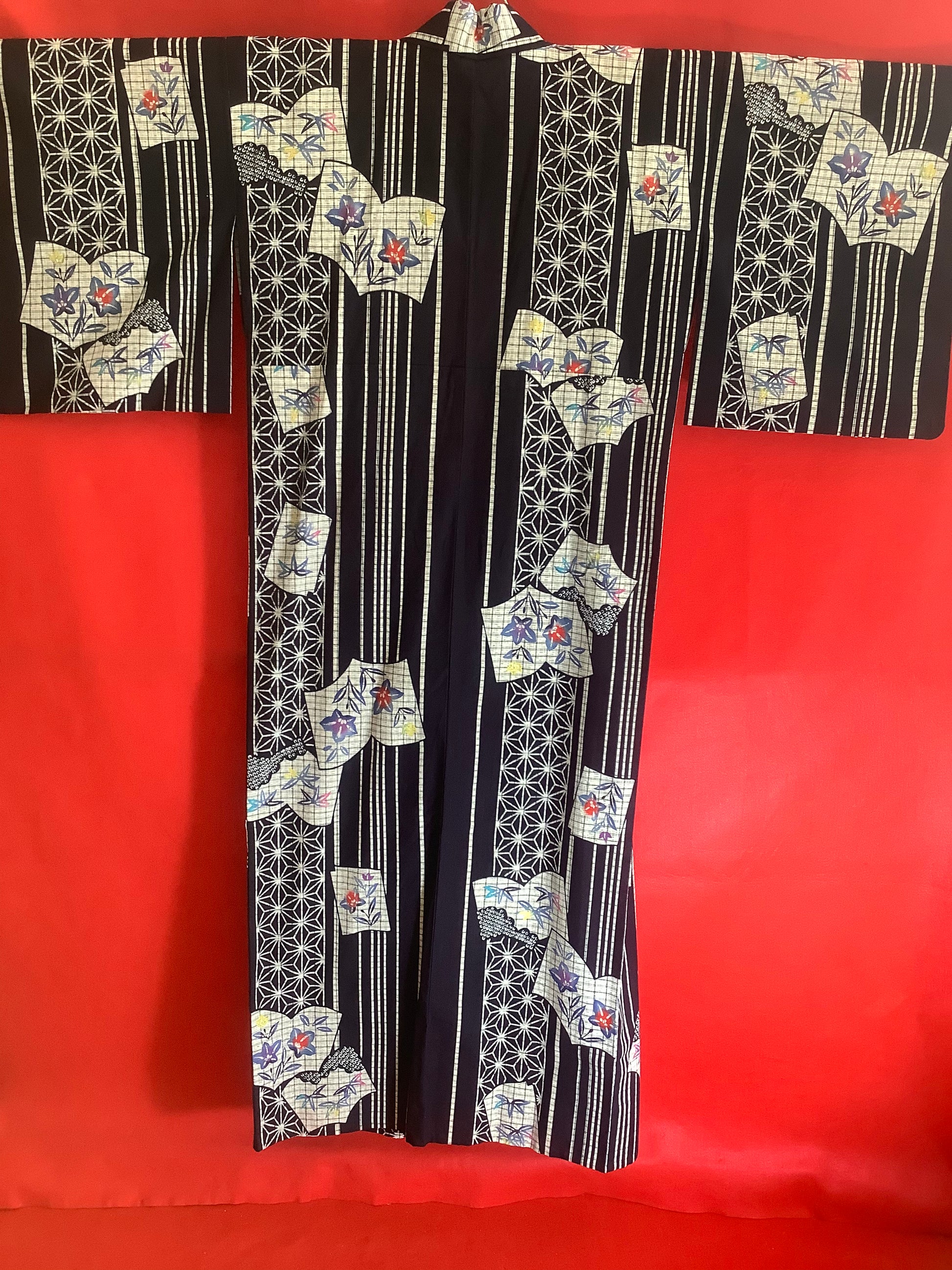 Cotton yukata with asanoha and open books. Condition is excellent.